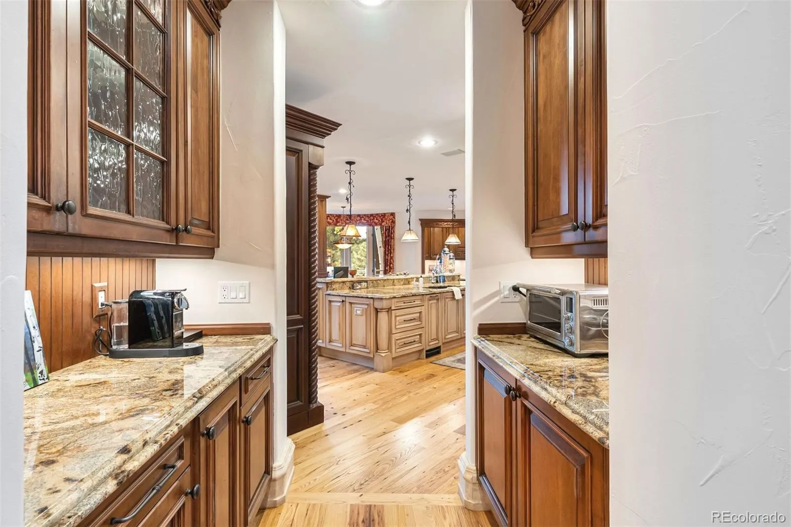 kitchen is both beautiful and functional, featuring a six-burner gas range, Wolf double oven, butler’s pantry with ice maker and thoughtful cabinetry with custom pull-out storage. The standout features are the custom-built refrigerator and wine cabinet with refrigerator drawers, seamlessly integrated to resemble furniture, further enhancing the kitchen’s timeless aesthetic and the gorgeous walk-through custom pantry tucked behind the kitchen itself. The adjacent dining room benefits from elegant maple finishes with Inkobal wood carvings adding artisanal charm. The recently updated primary suite impresses with a