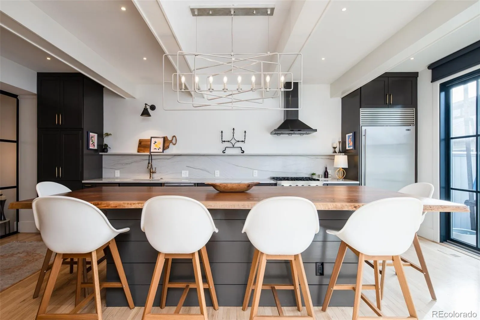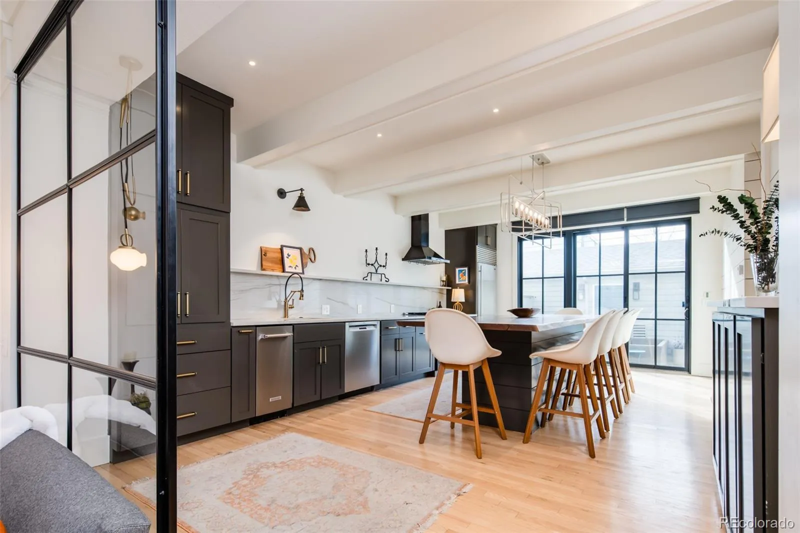 Natural light pours through expansive double-pane windows, highlighting tall ceilings and hardwood floors throughout. The reimagined gourmet kitchen anchors the main level with custom cabinetry, premium countertops, professional-grade appliances, and a striking live-edge island—ideal for both everyday living and elegant entertaining. The inviting living room centers around a statement fireplace and flows seamlessly to a private courtyard patio finished with AstroTurf, perfect for enjoying morning coffee or entertaining friends.