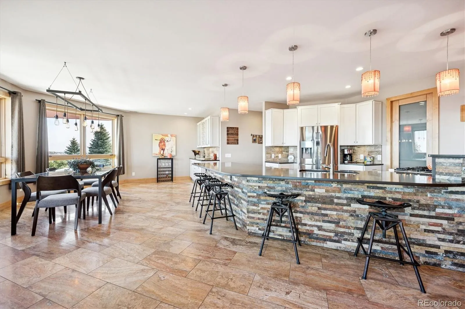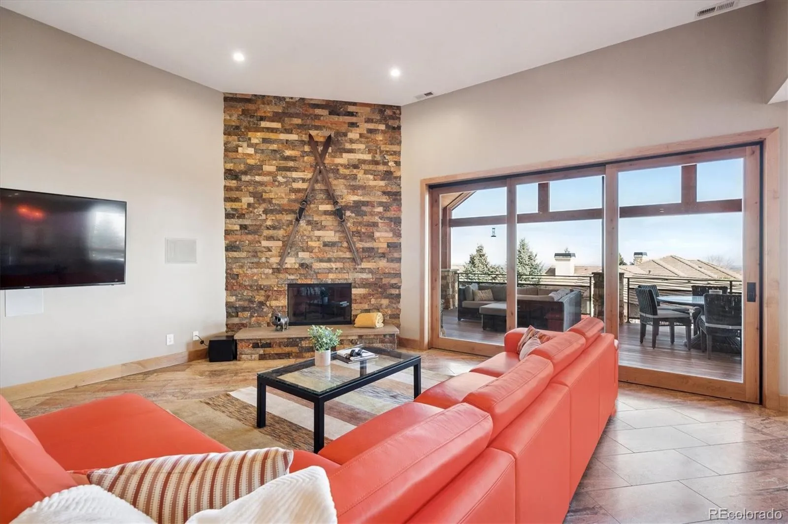 The living room includes a striking Telluride stone fireplace and flows seamlessly into the chef’s kitchen, designed for both everyday living and entertaining. Large sliding doors open to the Ipe Brazilian hardwood deck with built-in fireplace — a spectacular vantage point for sunset views and quiet Colorado evenings. Heated Turkish Travertine flooring, beautiful Ash wood stairs, and an 8-zone radiant heat system reflect the thoughtful craftsmanship throughout the home. The finished walk-out level expands the entertaining space with a substantial wet bar featuring cement countertops, a second stone fireplace, two additional bedrooms, and a ¾ bath with steam shower. Step outside to the lower patio and hot tub. A secure safe room with dedicated wine storage adds both function and peace of mind. Car enthusiasts will appreciate the oversized four-car garage plus an additional 500-square-foot bonus space above. Falcon Ridge consists of just 26 custom residences and offers direct access to over 800 acres of private Willow Springs open space. Residents enjoy golf cart access to Red Rocks Country Club featuring championship golf, dining, and pool amenities. A rare opportunity to own one of the most elevated and private settings in Willow Springs.