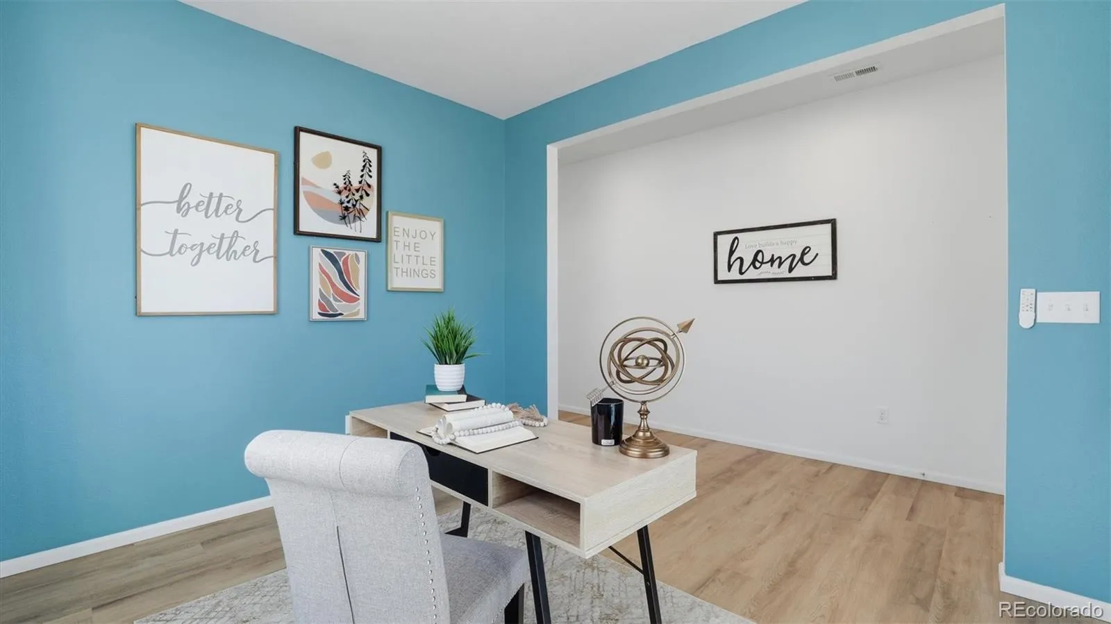 BETTER THAN NEW, this stunning 3BR/3BA, 2-story home is located in the popular community of The Trails at Aspen Ridge. Situated on a low-maintenance xeriscaped lot, the covered front porch is the perfect spot to enjoy Colorado’s abundant sunshine. Inside, you’ll find a contemporary open floor plan filled w/ natural light & modern finishes throughout. The main level features LVP flooring, stylish light fixtures, & numerous windows complete w/ window treatments. Central air & heat provide year-round comfort, & 2,198 sf of well-designed living space makes this home ideal for entertaining. Upon entry, you’re welcomed by a versatile home office or sitting area, along w/ a convenient powder bath featuring a pedestal sink. The light & bright great room overlooks the backyard & flows seamlessly into the dining area & kitchen. The dining space incl a sliding door that opens to the fenced backyard, blending indoor & outdoor living. The beautiful island kitchen offers white cabinetry, quartz countertops, pendant lighting, a breakfast bar, & large pantry. Appliances incl a dishwasher, gas range oven, & built-in microwave. Upstairs, you’ll find a laundry room w/ built-in cabinets, a spacious loft w/ mountain views, 3BRS w/ walk-in closets, & 2BAs. The primary suite is a private retreat featuring mountain views & a spa-like bathroom w/ dual-sink vanity, mirror, & enclosed tiled shower. 2 addtl BRs share a full BA w/ vanity, mirror, & tiled tub/shower. Addtl highlights incl a 2-car garage w/ door opener & a level, fenced backyard that is ready for your personal finishing touches. Living in The Trails at Aspen Ridge means enjoying a spacious central park complete w/ playground, pavilions, & walking/biking trails. You’ll appreciate the easy commute to Peterson Space Force Base & convenient access to shopping, dining, & nearby outdoor recreation areas such as Bluestem Prairie Open Space & Fountain Creek Regional Park. This MOVE-IN READY home is ready for you to make it your own!