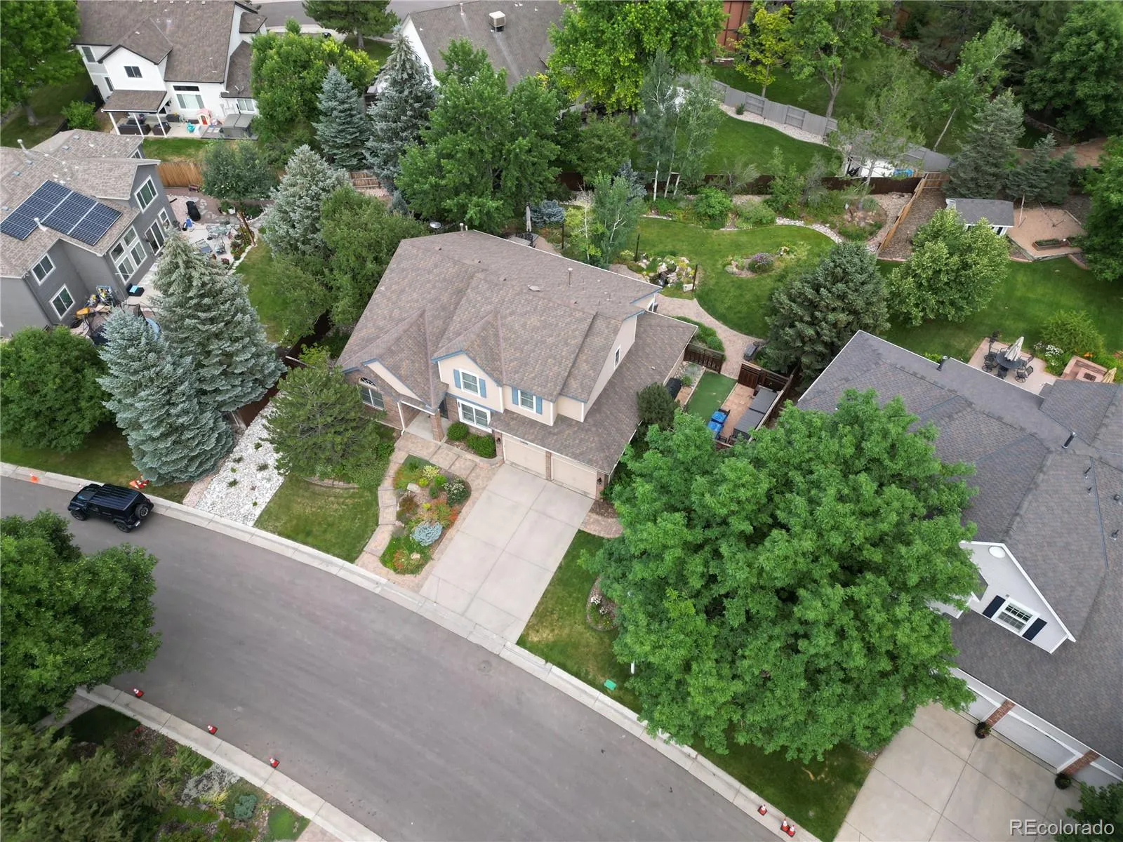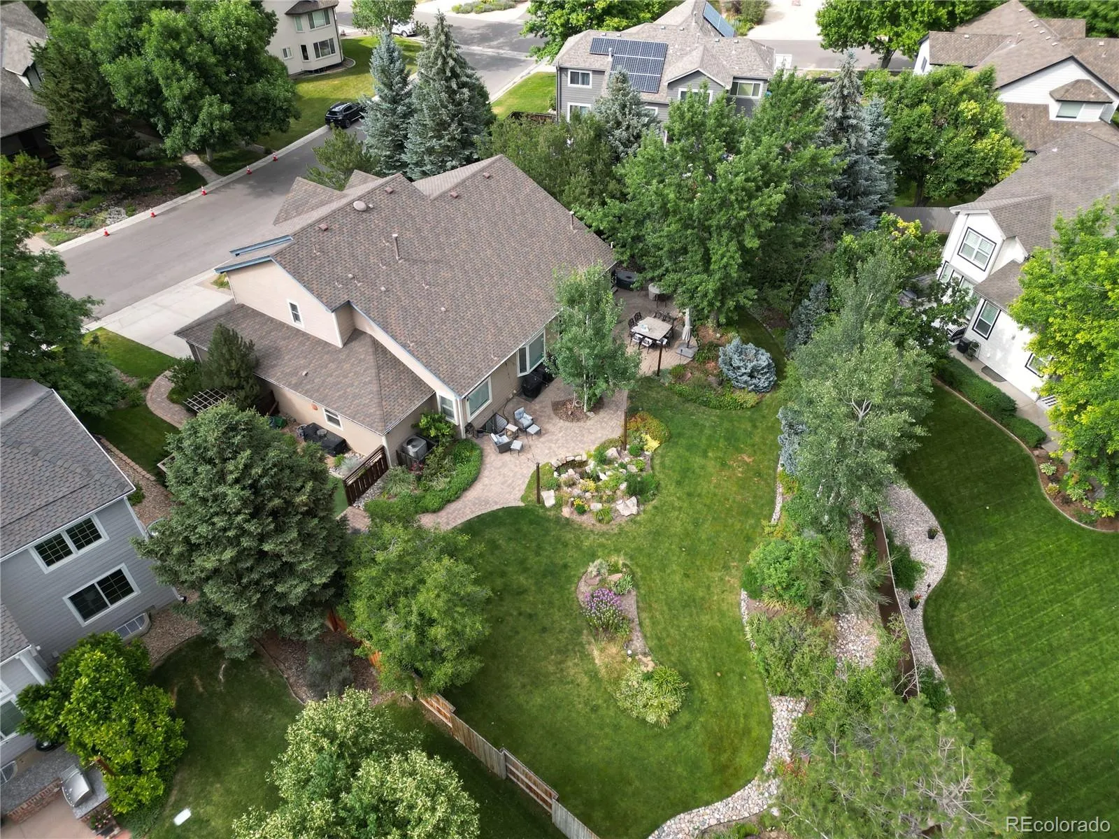 This is the one you have been waiting for in the sought after Belleview Farms Neighborhood! Do not miss your chance on the most stunning almost 1/3 acre lot, 2 story Village home. Meticulously maintained inside and out. Complete with highly desired main floor master suite. This quality RARELY becomes available! As close to perfection as possible. Open floorplan with Vaulted ceilings and hardwood floors. Spectacular vaulted ceiling dining room. Incredible kitchen updated in June 2023 has granite countertops, white cabinets and center island with downdraft tiles GE Cafe gas cooktop and stainless steel appliances. Samsung refrigerator included. Cute eat-in kitchen with bay window. Open floor plan allows seamless entertaining from kitchen to beautiful vaulted ceiling family-great room with travertine tile gas fireplace. Private main floor master suite is everything you could desire, spacious bedroom with luxurious 5 piece bath with heated tile flooring, soaking tub, double sinks, large shower, custom walk-in closet and has backyard views. Main level includes perfect office space which was updated with fresh paint and carpet. Nice half bath and laundry room with utility sink also on main level. 2nd story has 2 spacious bedrooms, full bath with granite counter, double sinks and tile floor as well as a large loft with built-ins. Don’t miss the extraordinary basement which was professionally finished with amazing tv/rec exercise room, 4th bedroom with giant walk-in closet and another full bath. Step out to gorgeous private back yard’s immaculate landscaping with pond and waterfall, gardens and expansive patios, dog run area and more. Relax in the included hot tub. Brand new HVAC system installed June 2024 should ease your mind as well as the radon mitigation system. TV mounts saty. 3 car tandem garage. Highly rated Jeffco Schools , location to foothills, shopping, restaurants and so much more! Owners have made upgrades to their property that make it even more spectacular!!