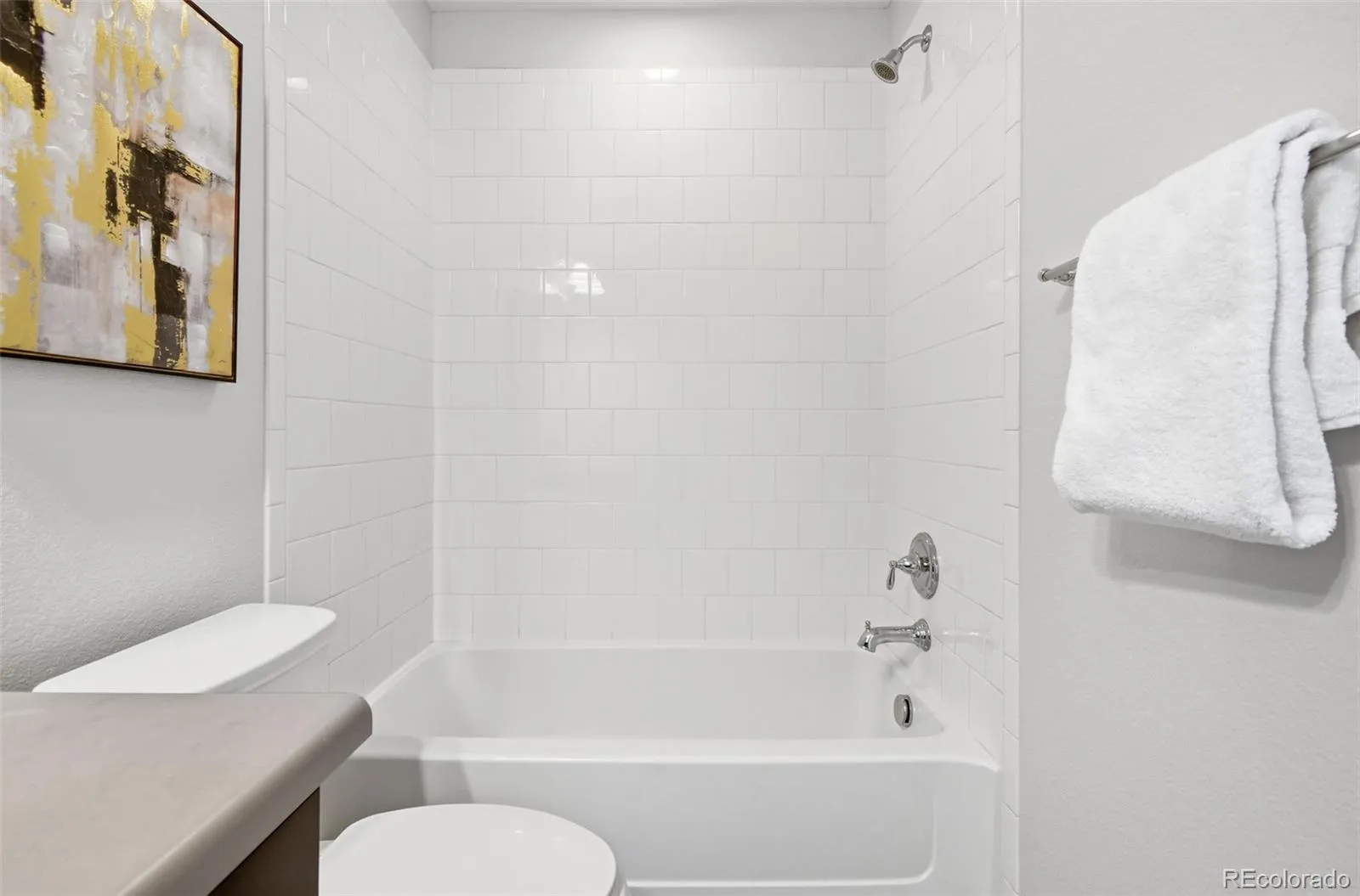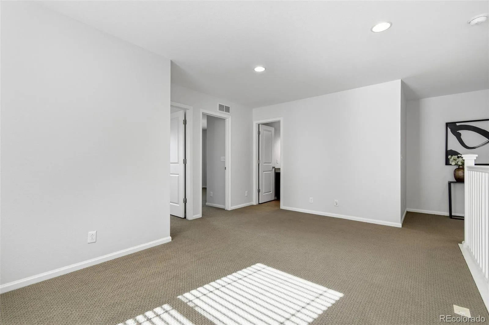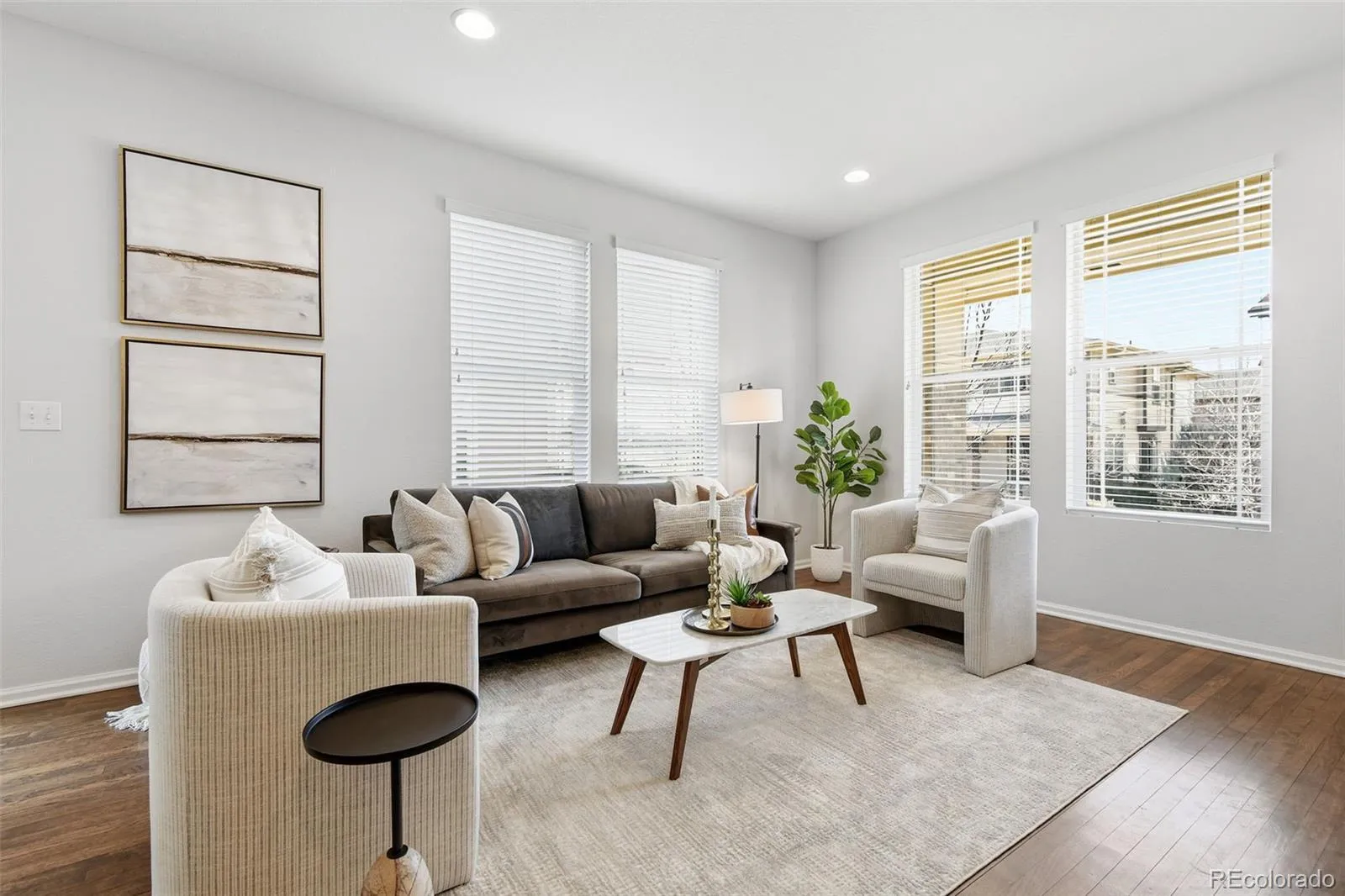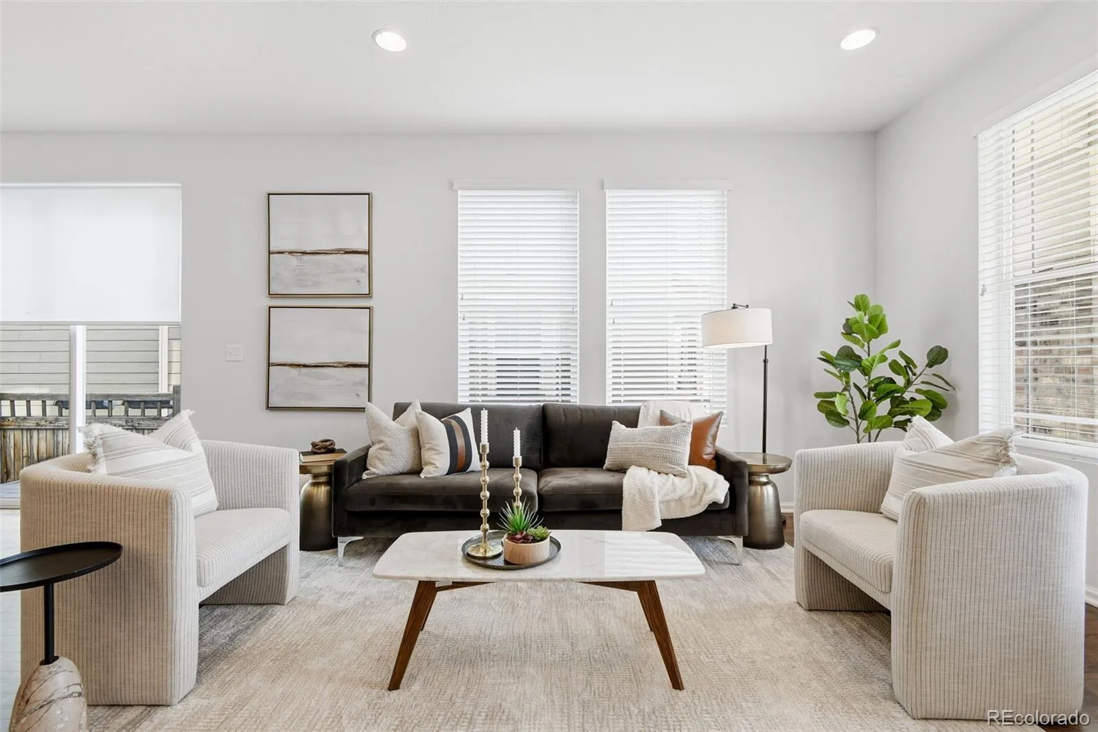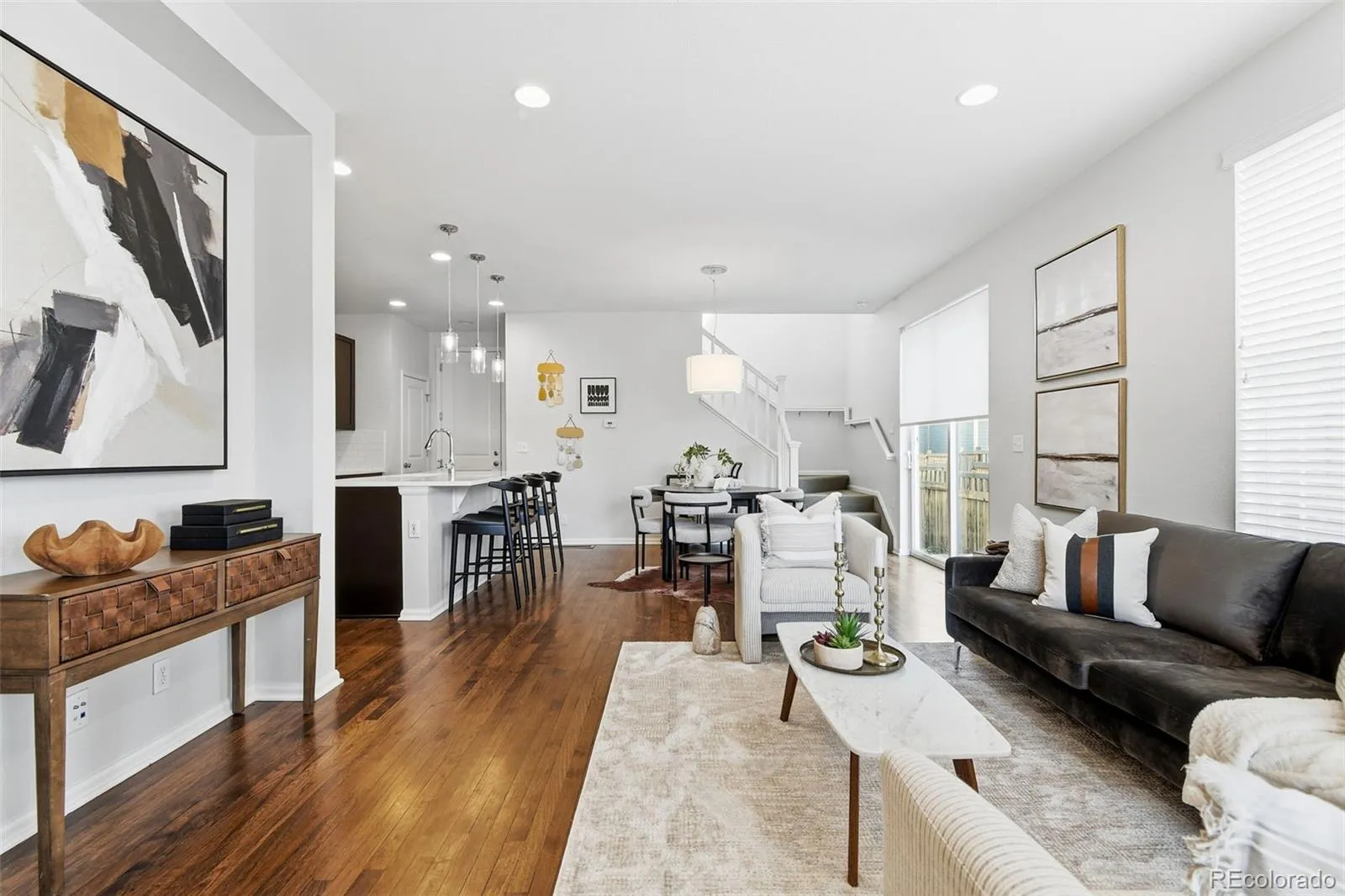 Welcome to this thoughtfully upgraded home, where custom design details meet a spacious, functional floor plan. The main level features real hardwood floors and an open, light-filled living room that flows seamlessly into the dining area and eat-in kitchen, complete with a quartz island, subway tile backsplash, and stainless-steel appliances. The layout is ideal for everyday living and entertaining, extending out to a deck and fenced yard with sunny southwest exposure. Upstairs, a generous loft offers flexible space for a cozy family room or home office. Two secondary bedrooms with western views share a full bath, while the primary suite serves as a comfortable retreat with a ¾ ensuite bath featuring a custom surround and quartz counters. Two large closets and an adjacent laundry area add everyday convenience. Custom finishes throughout bring a cohesive, elevated feel to the home. The open, unfinished basement provides a blank canvas – perfect for a gym, an entertainment area or future finished living space – along with ample storage. A two-car attached garage and extended driveway offer plenty of off-street parking. The location is equally appealing. Just a stone’s throw from the newly opened Bluff Lake Center, you’ll have easy access to trails and open space, as well as the dining and shopping options at Eastbridge Town Center and Stanley Marketplace, plus convenient Light Rail and I-70 access. Whether it’s a stroll through the courtyard, a quick grocery run, or time outdoors on nearby paths and parks, this home is well positioned for everyday living.