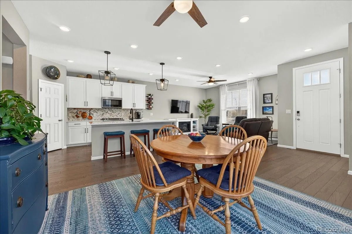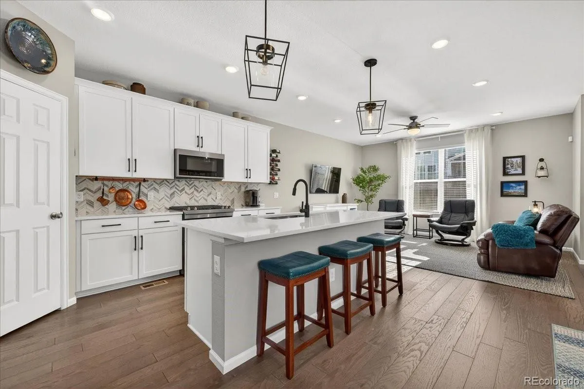 The beautiful setting of this home provides abundant natural light and breathtaking sunrise and sunset views. The open main level features a welcoming living room and a stunning kitchen with white Shaker cabinetry, quartz countertops, stainless steel appliances, a large walk-in pantry, and a spacious eat-in island. The dining area overlooks the fenced Xeriscape backyard, where you can enjoy coffee surrounded by perennial blooms and hummingbirds. Relax outside or entertain on the patio with warrantied pavers. A powder room and access to the two-car garage complete the main level.