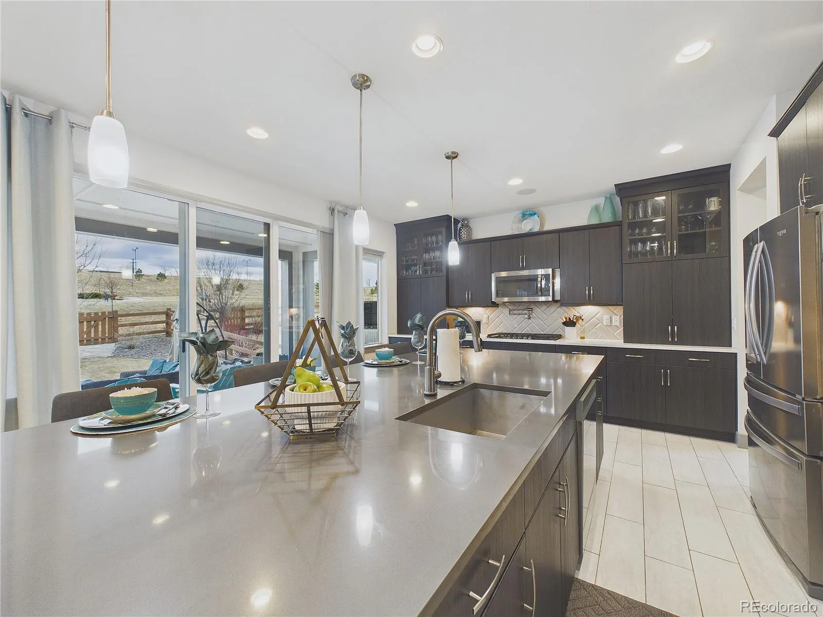 *** OPEN HOUSE SATURDAY, FEBRUARY 21ST FROM 11AM-1PM *** Experience Colorado living in this thoughtfully upgraded former model home, where designer finishes and high-end details elevate every space. The main level showcases an expansive open floor plan, seamlessly connecting the living room and kitchen for effortless everyday living and entertaining. A dramatic floor-to-ceiling tiled fireplace anchors the living area, while the oversized kitchen island, gas range cooktop, double ovens, walk-in pantry, and abundant cabinetry create a true chef’s workspace. A main-level bedroom with an en-suite bath offers flexibility for guests or multigenerational living, complemented by a powder bath and a spacious mudroom designed for daily convenience. Upstairs, the wide stairway leads to a bright loft area, two additional bedrooms, and a well-appointed bathroom. The primary suite provides a private retreat with a luxurious bath and upgraded finishes throughout. Top-of-the-line carpet and luxury lighting continue the home’s polished aesthetic. The finished basement expands the living space with its own kitchen, living room, and integrated Sonos surround sound system. Perfect for movie nights or hosting gatherings. An additional bedroom and bathroom add further versatility. The outdoor living space is just as impressive, with a covered back porch, extended patio, built-in gas line, and an outdoor gas fireplace. This property also backs directly to the park and open space with a private gate leading to the park. Enjoy sweeping views of the Flatirons and miles of nearby trails. The fully finished garage includes custom storage, while owned solar panels provide energy efficiency without additional financing. Located within a vibrant community offering a clubhouse, fitness center, pool, tennis courts, playgrounds, and easy access to local shops and restaurants, this home combines comfort, style, and convenience in one exceptional package!