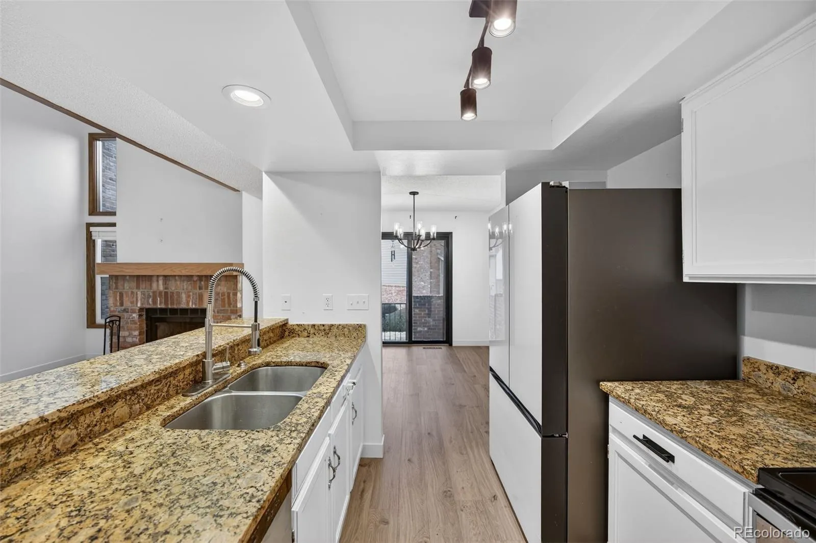 The main level features a comfortable living area with a wood-burning fireplace and a dining space that opens to a private deck overlooking a quiet greenbelt—an easy spot to relax or enjoy some fresh air. The kitchen includes granite countertops, stainless steel appliances, and updated cabinetry, along with a convenient powder bath for guests.