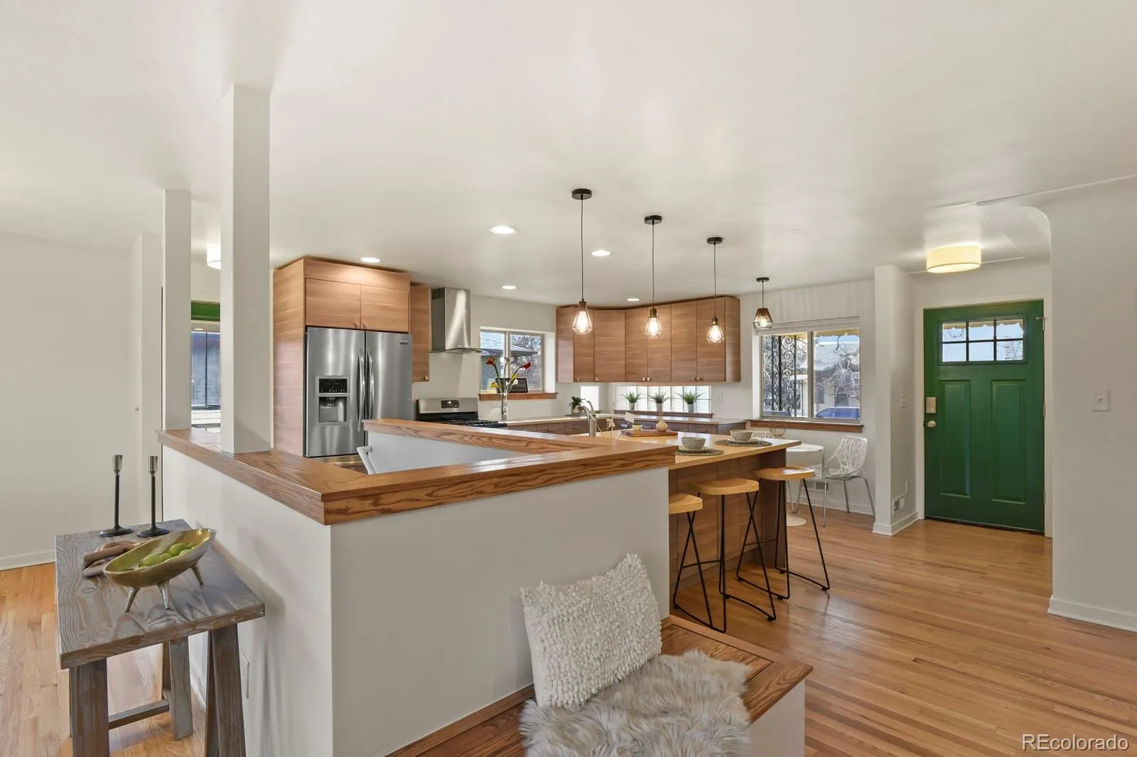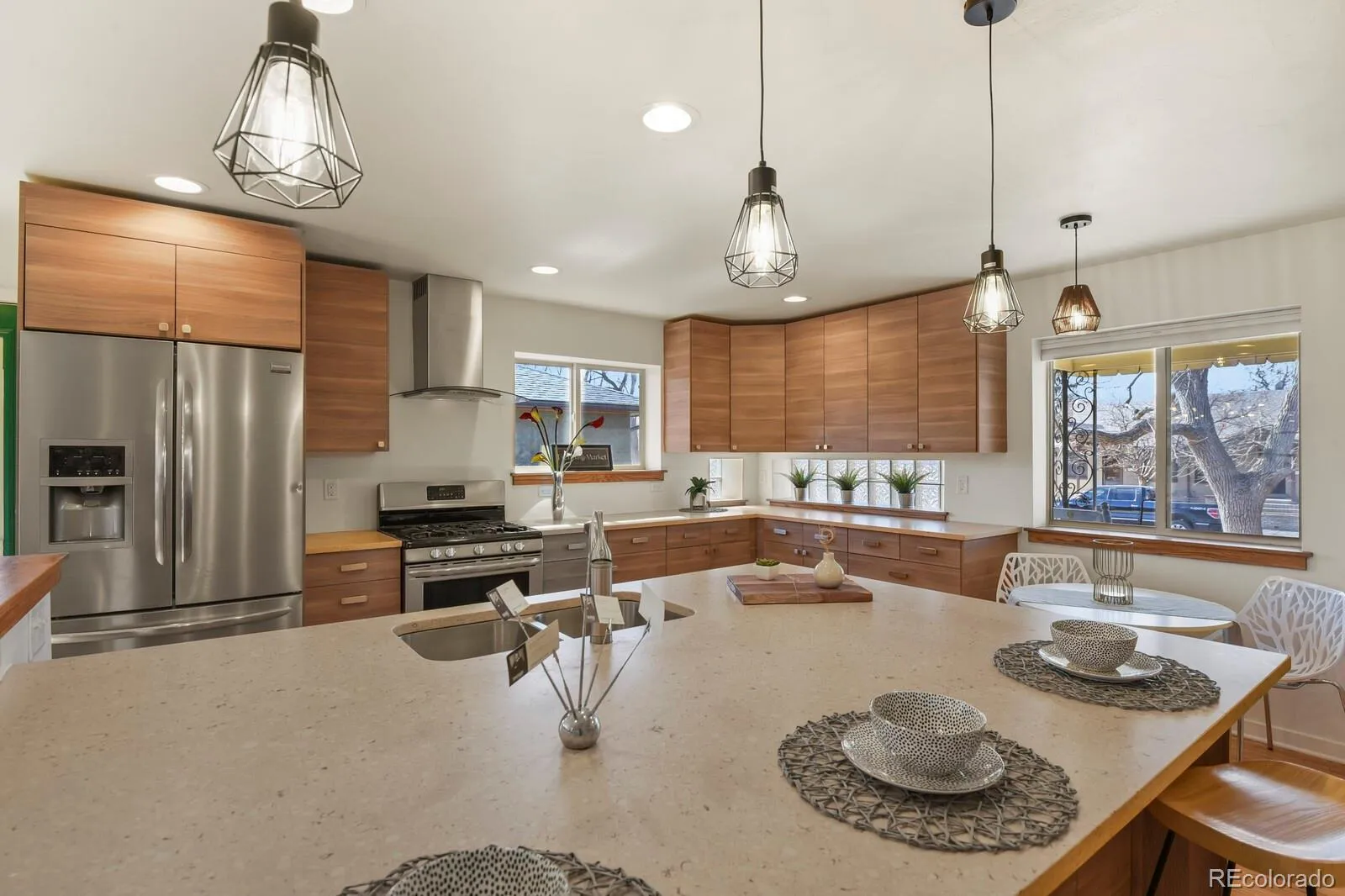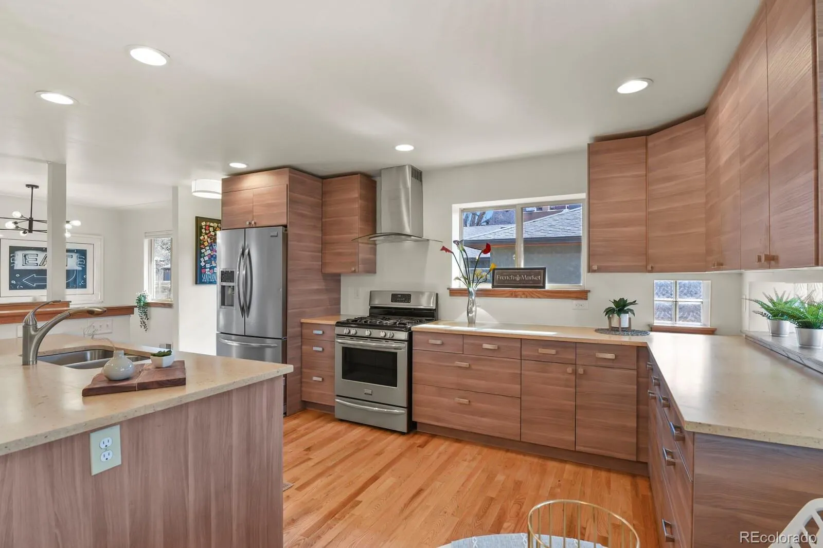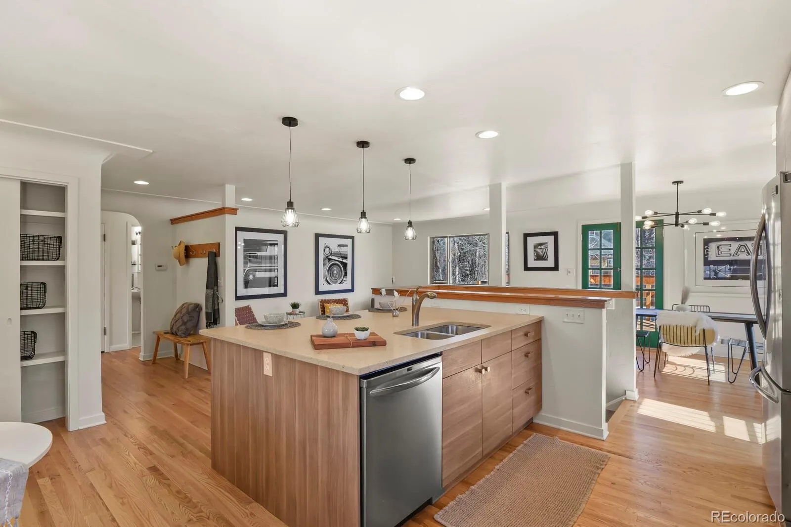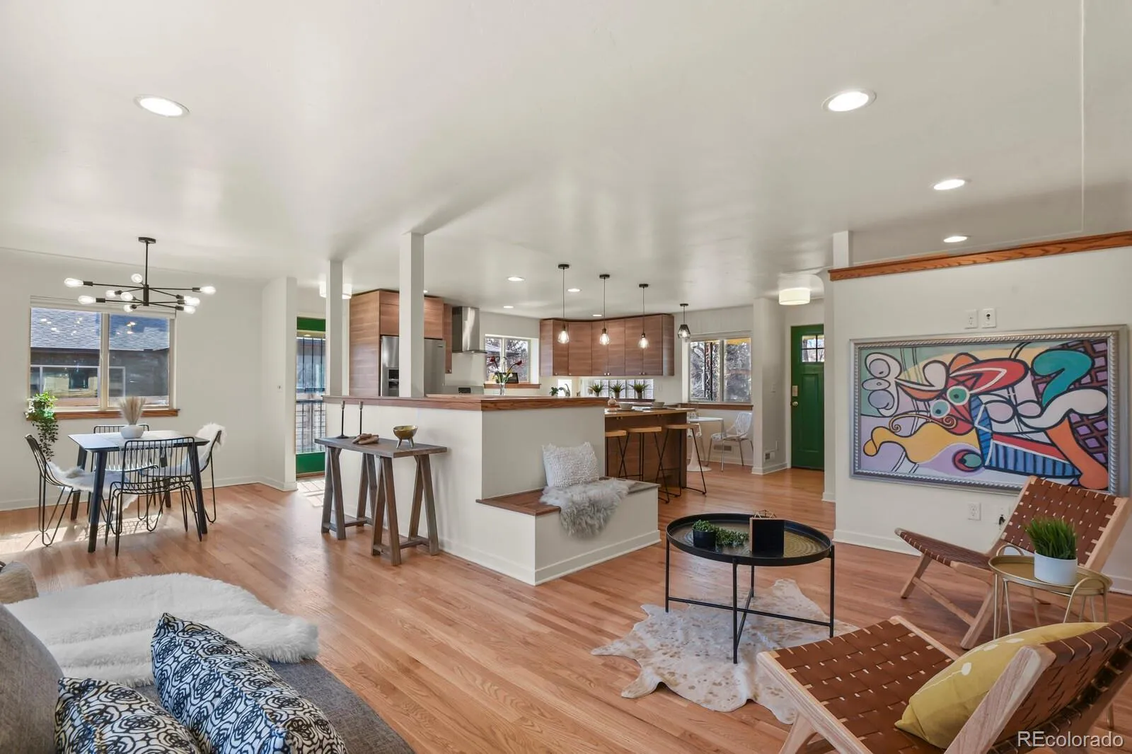 Welcome to 1340 Olive Street, a beautifully updated raised ranch in coveted Montclair—just moments from the iconic Richthofen Castle and a short stroll to Montclair Park. This classic blonde brick home offers 5beds+office/2baths across 2,594 square feet of highly functional living space. Step inside to an open-concept main level filled with natural light. The spacious living room flows seamlessly into a thoughtfully designed kitchen featuring modern cabinetry, period glass block accents, a HUGE center island, sunny south-facing window, and additional eat-in space. Original French doors off the dining area open to an expansive cedar deck, perfect for effortless indoor-outdoor living. The main floor includes a generous primary bedroom, two additional bedrooms with ample closets, and a full bath conveniently positioned near two hallway linen closets. Downstairs, you’ll find a massive family room anchored by a brick-surround wood-burning fireplace. A dedicated bar area—already plumbed for a future wet bar—makes this the ultimate entertaining level. Two conforming basement bedrooms, an updated ¾ bath, and a bright flex room (ideal for an office, gym, or media room) add incredible versatility. The oversized laundry area offers abundant storage, utility sink, and bonus space perfect for a workshop or wine cellar. Situated on a generous 7,800 sq ft lot, the outdoor spaces truly shine. Enjoy the raised covered front porch, host unforgettable gatherings on the HUGE back deck, and unwind around the natural gas firepit. The oversized two-car garage includes a “secret” bonus room for creative space or retreat, plus a long driveway and additional parking pad provide exceptional off-street parking—ideal for guests or recreational vehicles. Fresh interior paint, newly refinished hardwood floors, easy access to I-70, and a central location just minutes from downtown, Central Park, and Lowry complete the package. Classic charm. Modern updates. Prime location.