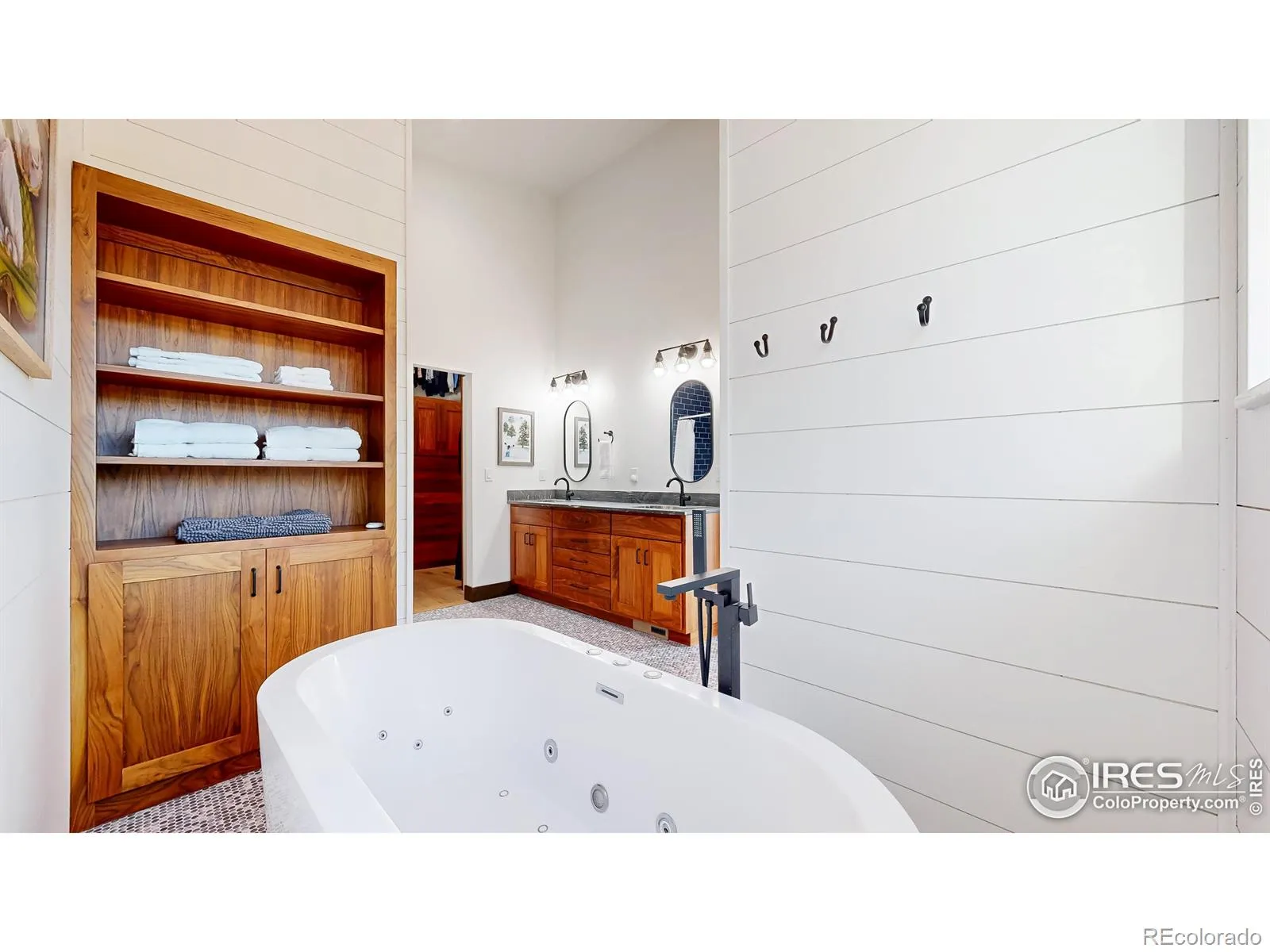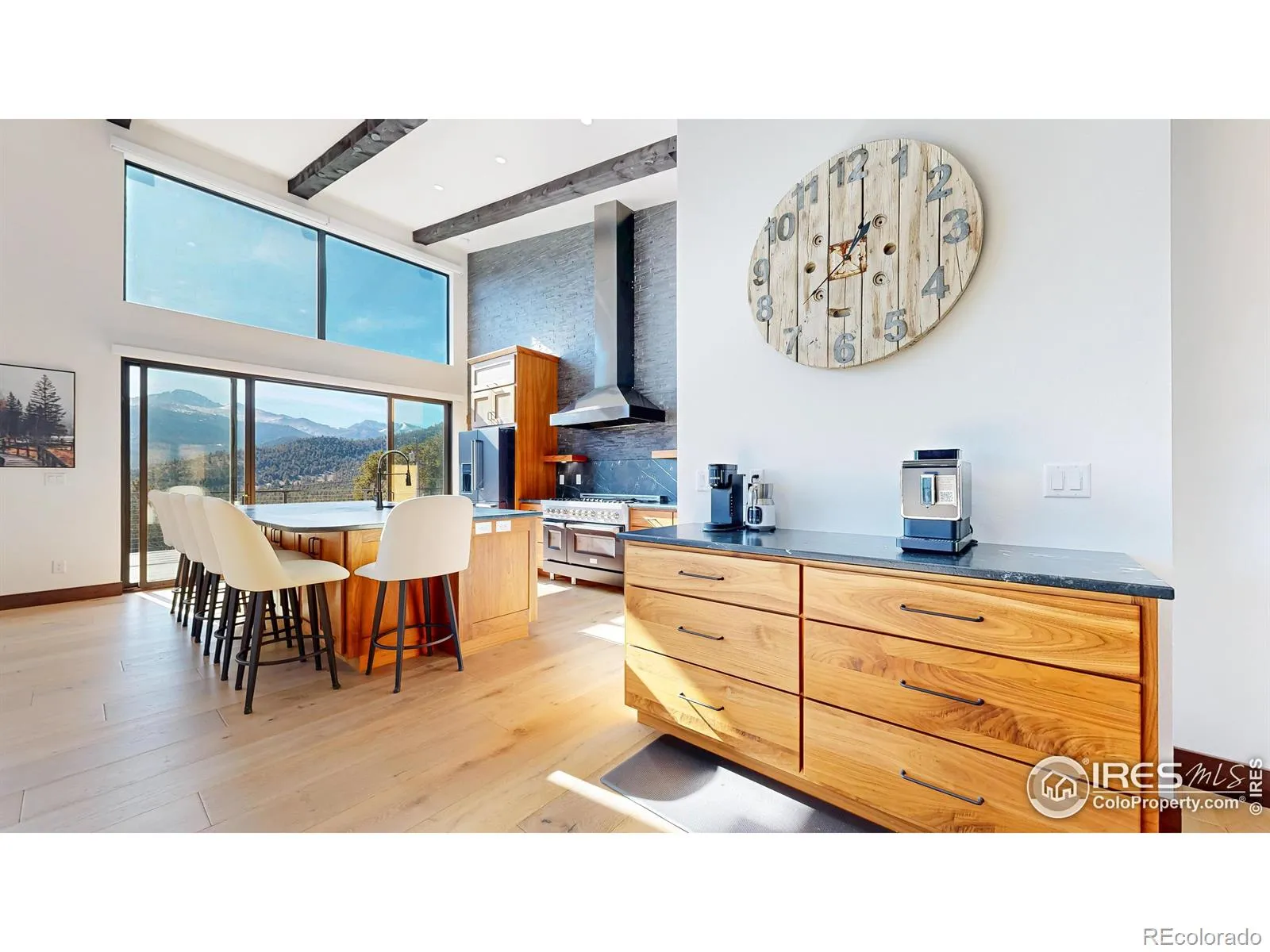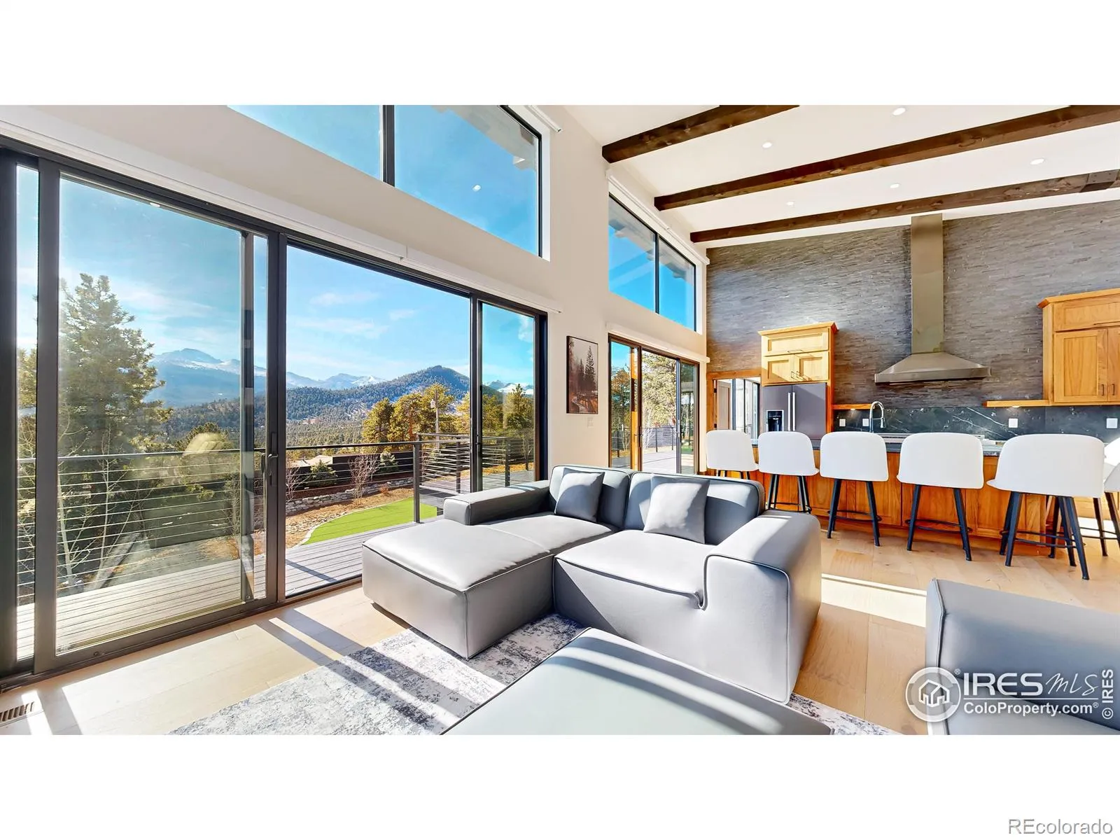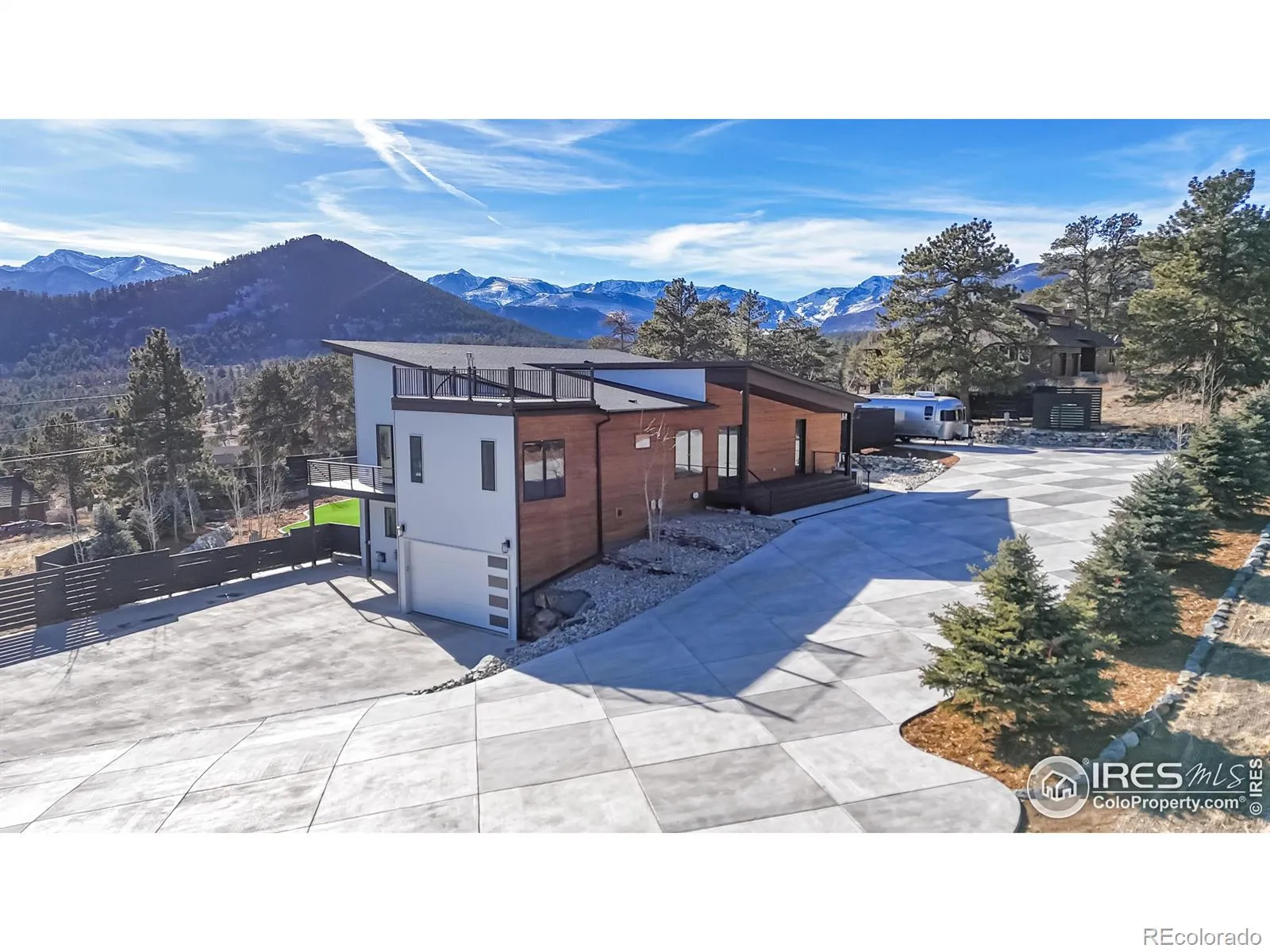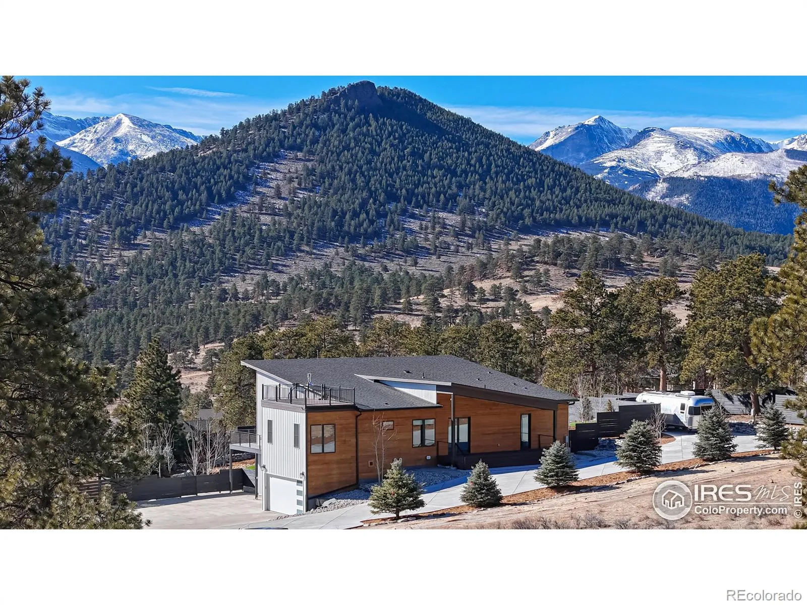 One of the most spectacular properties in the entire Estes Valley, showcasing breathtaking views of Mt. Meeker, Longs Peak, and the Continental Divide from a coveted High Drive location just 1/2 mile to Rocky Mountain National Park and only 2 miles to downtown Estes Park. The main level offers three bedrooms, including two with ensuite baths, dramatic vaulted ceilings, custom walnut cabinetry, granite countertops, and an impressive 1,238 square feet of Trex decking with a metal and cable railing system. The lower level features two bedrooms and two baths, a spacious great room, full kitchen, and a dedicated theater room, and may be locked off for privacy; it is currently operated as a licensed hosted short-term rental with a transferable license (buyer to confirm with Larimer County) and would also make an ideal extended family retreat, in-law suite, corporate getaway, or long-term rental. Notable amenities include a large rooftop deck, whole-house Kohler natural gas generator, Lennox dual-zone heating and air conditioning, 7-inch closed-cell foam insulation throughout the ceiling, Hunter Douglas motorized blinds, jetted tub, steel siding, Trex fascia and soffits, two Rheem tankless on-demand water heaters, a 220-volt EV charger in the garage, and a 50-foot dedicated concrete RV parking space with electricity. Trailblazer Fiber Internet makes working from home seamless. This exceptional property truly deserves a closer look.