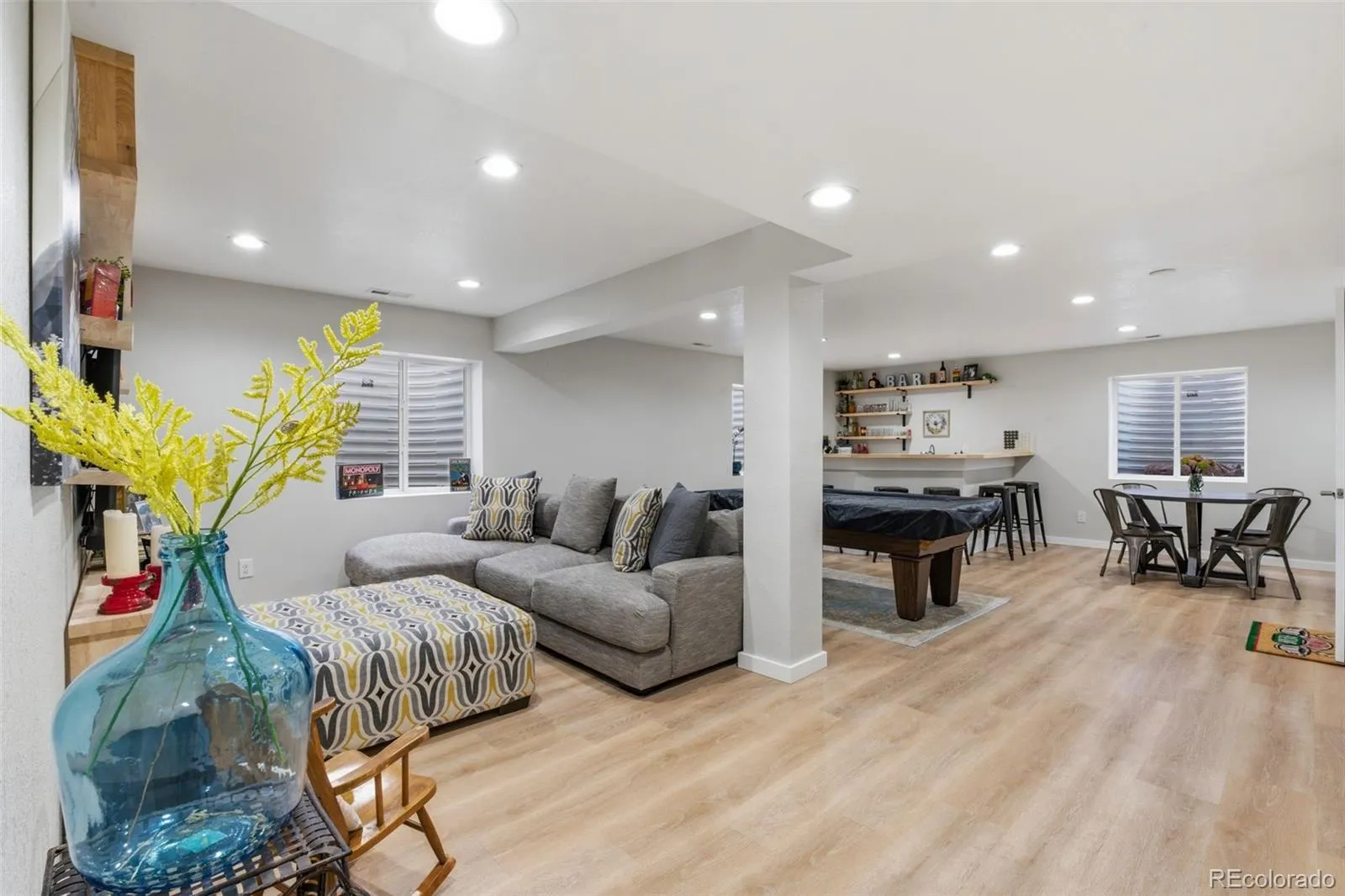 Welcome to this beautifully updated 5-bedroom, 3-bath home! Upstairs offers 3 spacious bedrooms and 2 baths, featuring elegant bamboo floors across the kitchen, dining, and living areas. The open-concept kitchen boasts ample brown cabinetry. The primary suite includes a five-piece bath with a tub, shower, and walk-in closet. As you step into the fully finished basement, you’re greeted by a stunning custom wet bar with white cabinetry and warm wood finishes. The expansive open space unfolds into a large living area perfect for entertaining or a cozy TV setup. Matching wooden shelves complement the bar, offering a seamless flow. Natural light pours in through large egress windows. The basement remodel includes 2 bedrooms, a stylish bathroom, and a custom laundry room with cabinetry and folding space. This is a must-see home!