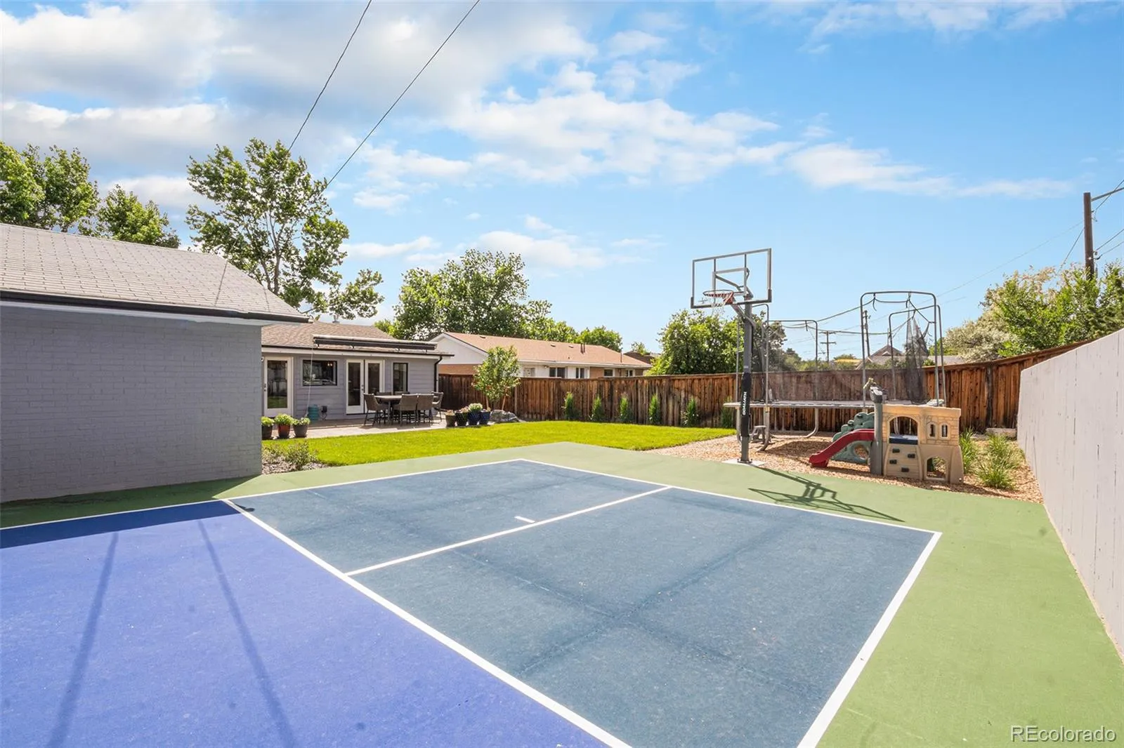 The main living and dining spaces flow seamlessly to an expansive patio with an electronic cover, creating a true extension of the home for year-round enjoyment. The backyard is a private resort-style escape, complete with a hot tub, dedicated pickleball/sports court, basketball hoop, and fresh professional landscaping with modern lighting. It’s the ultimate setup for entertaining or unwinding in style.