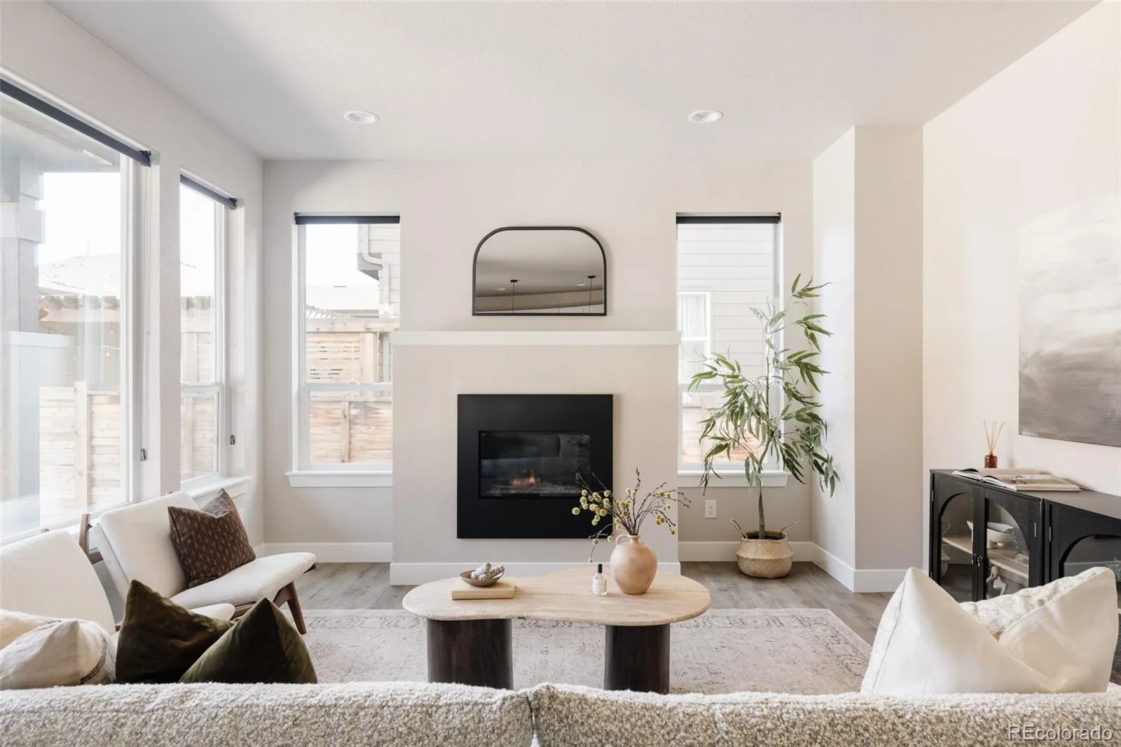 This Wonderland Home is thoughtfully designed & beautifully finished. From the moment you arrive, the home makes a statement with bold architectural lines & an inviting covered front porch that sets a warm, welcoming tone. Inside, the light-filled open-concept main level is designed for both connection & ease, offering seamless flow for daily living & entertaining alike. The spacious living room is anchored by a cozy gas fireplace, creating a natural gathering space that opens effortlessly to the dining area & kitchen. The kitchen is a true showpiece, featuring crisp white cabinetry, quartz countertops, a designer tile backsplash & a gas range ideal for the home chef. An oversized island with statement pendant lighting provides ample seating & prep space, while a large pantry keeps everything organized. Custom window coverings throughout offer privacy. The main floor also includes a dedicated study—perfect for working from home & a powder bath. Upstairs, unwind in the serene primary suite, a true retreat complete with a luxurious five-piece bath featuring a soaking tub, separate shower, dual sinks & a generous walk-in closet. Two additional bedrooms, a full hall bath & a convenient second-floor laundry room complete the upper level. The fully finished basement adds incredible versatility, offering a large secondary living space, a fourth bedroom & an additional full bathroom—ideal for guests, multi-generational living, or a home gym or media room. Outdoor living shines just off the kitchen, where a private backyard with an extended patio & modern privacy fencing creates the perfect setting for entertaining, relaxing, or enjoying quiet Colorado evenings. A detached two-car garage adds everyday convenience & extra storage. Perfectly positioned near top-rated schools, parks, trails, shops, Dick’s Sporting Goods Park, the Rocky Mountain Arsenal Wildlife Refuge & the new Pearl Market, this home offers a lifestyle that is both connected & serene.