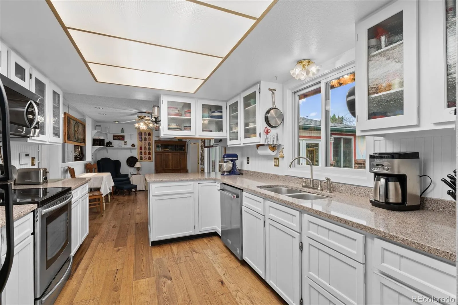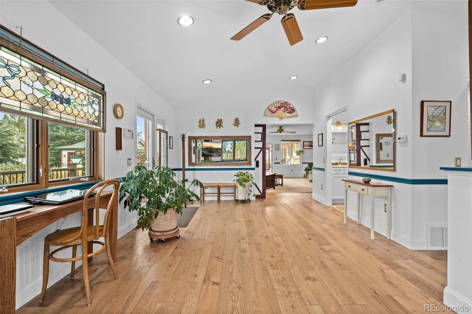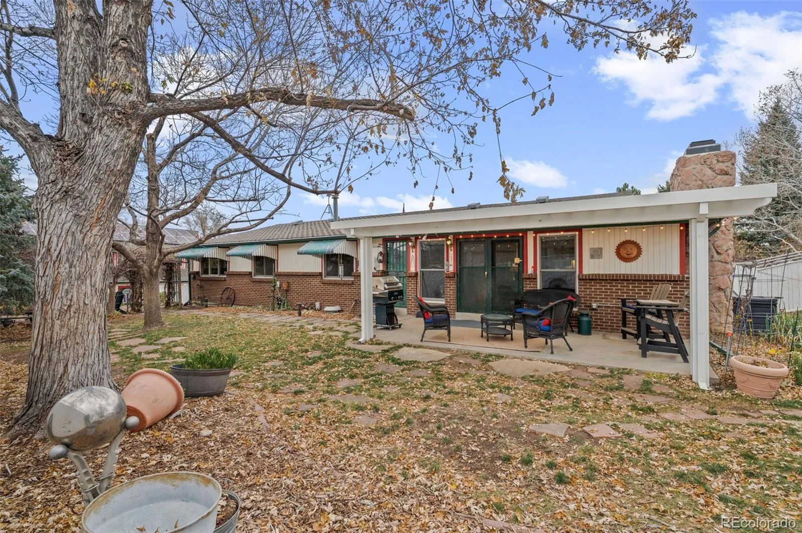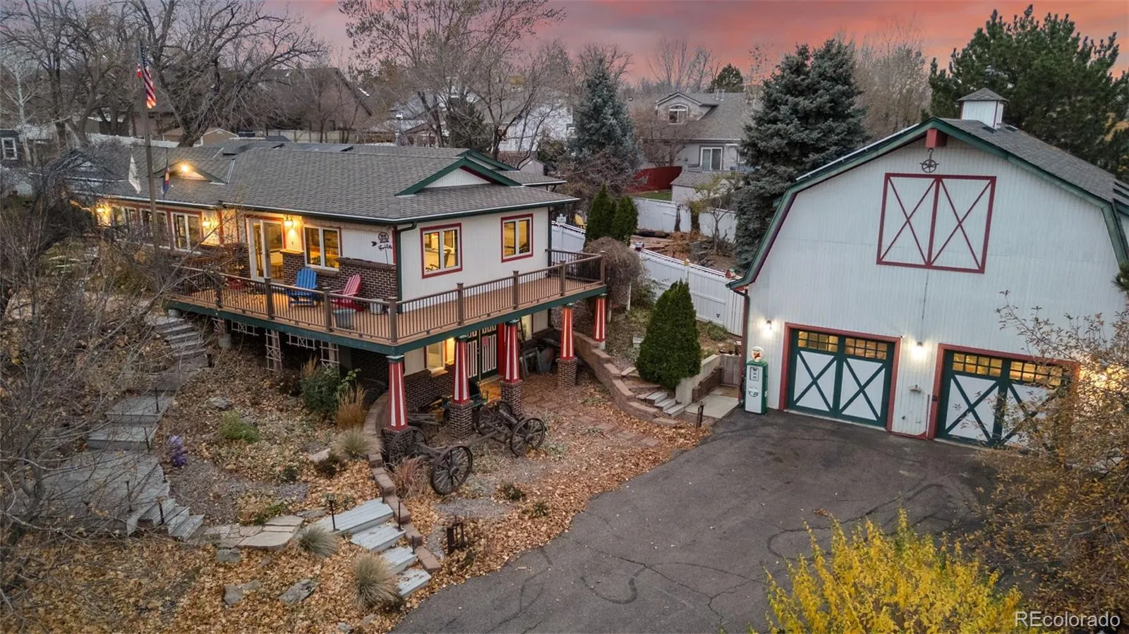 Country living in the city on nearly an acre in the heart of Arvada, with sweeping views from your wraparound porch. This light-filled estate offers 4 bedrooms, 3 bathrooms, a detached 2-car garage, and an impressive heated 40×30 gambrel-style workshop featuring expansive garage/shop space plus insulated second-floor space — ideal for additional vehicles, studio use, business operations, or flexible future use. Designed for privacy and versatility, the home is exceptionally well suited for multi-generational living. Windows in every direction flood the interior with natural light, highlighting full-depth Hickory floors and thoughtfully integrated built-ins crafted from repurposed antiques. On the west wing are three bedrooms, including a primary suite with walk-in closet and private en-suite bath, along with a comfortable family room featuring a gas fireplace. The centrally located kitchen anchors the floorplan with quartz countertops and custom cabinetry accented with reclaimed glass from a historic Durango bank, seamlessly connecting the dining room and breakfast nook. A separate living wing offers an additional family room and a private suite complete with vaulted ceilings, recessed lighting, curbless shower, dedicated furnace, separate basement storage space, and its own exterior entrance to a wraparound deck with retractable awning. Recently used for generational living, this space is ideal as guest quarters, ADU-style living area, or secondary primary. The outdoors is equally impressive, with multiple covered porches and composite decks, a flagstone patio, goldfish pond, and beautifully maintained gardens. A ditch share conveys with the property, augmenting irrigation to the nearly one-acre. Thoughtful efficiency upgrades include Renewal by Andersen windows and doors, solar, leaf guard protection, and numerous system improvements over time. A truly unique opportunity to own space, versatility, and character — all within minutes of central Arvada conveniences.