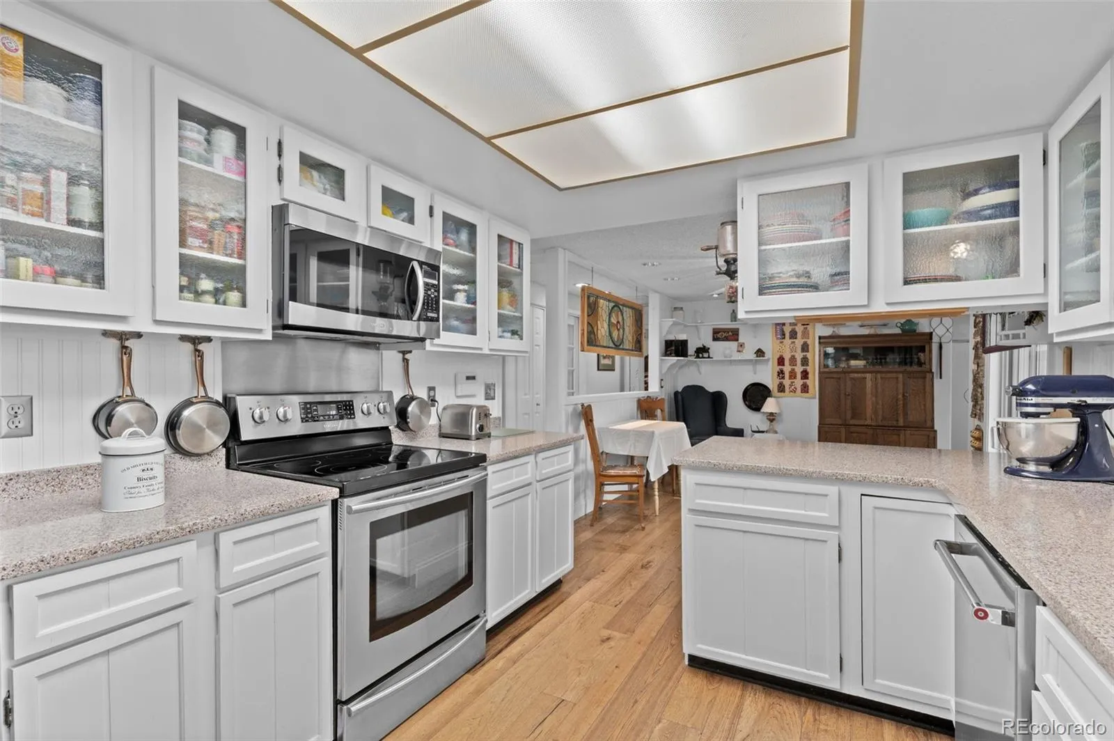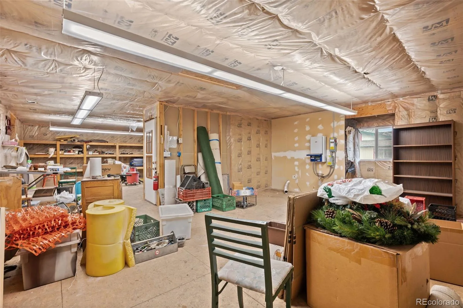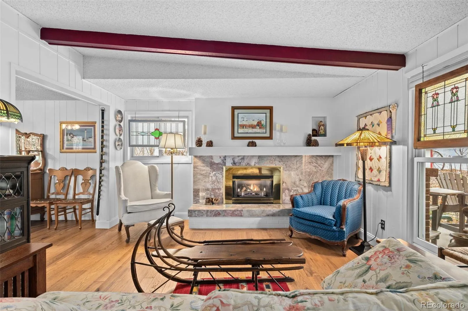 Country living in the city on nearly an acre in the heart of Arvada, with sweeping views from your wraparound porch. This light-filled estate offers 4 bedrooms, 3 bathrooms, a detached 2-car garage, and an impressive heated 40×30 gambrel-style workshop featuring expansive garage/shop space plus insulated second-floor space — ideal for additional vehicles, studio use, business operations, or flexible future use. Designed for privacy and versatility, the home is exceptionally well suited for multi-generational living. Windows in every direction flood the interior with natural light, highlighting full-depth Hickory floors and thoughtfully integrated built-ins crafted from repurposed antiques. On the west wing are three bedrooms, including a primary suite with walk-in closet and private en-suite bath, along with a comfortable family room featuring a gas fireplace. The centrally located kitchen anchors the floorplan with quartz countertops and custom cabinetry accented with reclaimed glass from a historic Durango bank, seamlessly connecting the dining room and breakfast nook. A separate living wing offers an additional family room and a private suite complete with vaulted ceilings, recessed lighting, curbless shower, dedicated furnace, separate basement storage space, and its own exterior entrance to a wraparound deck with retractable awning. Recently used for generational living, this space is ideal as guest quarters, ADU-style living area, or secondary primary. The outdoors is equally impressive, with multiple covered porches and composite decks, a flagstone patio, goldfish pond, and beautifully maintained gardens. A ditch share conveys with the property, augmenting irrigation to the nearly one-acre. Thoughtful efficiency upgrades include Renewal by Andersen windows and doors, solar, leaf guard protection, and numerous system improvements over time. A truly unique opportunity to own space, versatility, and character — all within minutes of central Arvada conveniences.