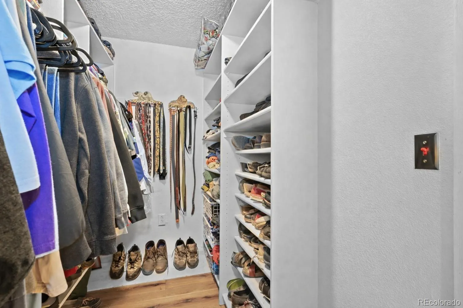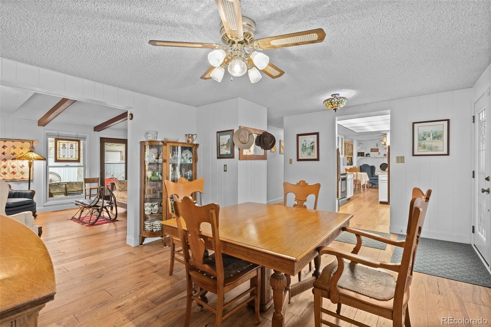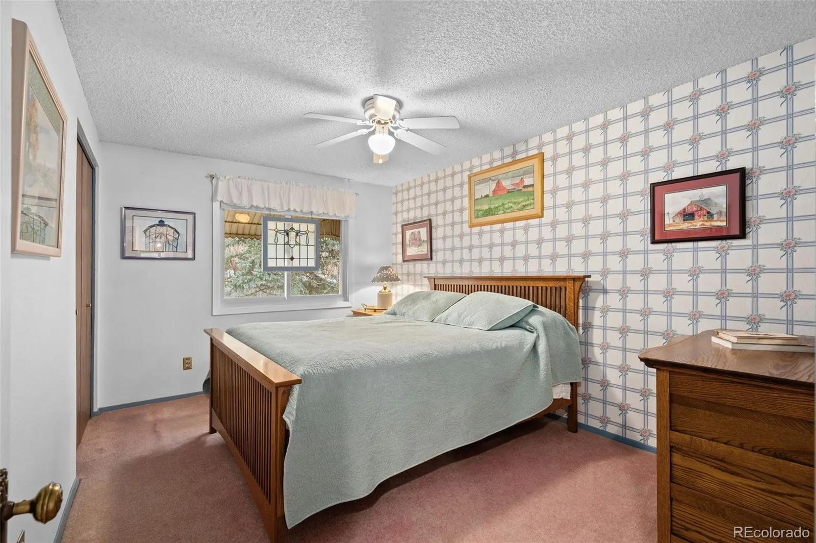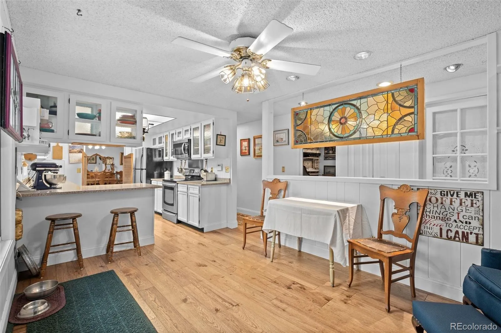Country living in the city on nearly an acre in the heart of Arvada, with sweeping views from your wraparound porch. This light-filled estate offers 4 bedrooms, 3 bathrooms, a detached 2-car garage, and an impressive heated 40×30 gambrel-style workshop featuring expansive garage/shop space plus insulated second-floor space — ideal for additional vehicles, studio use, business operations, or flexible future use. Designed for privacy and versatility, the home is exceptionally well suited for multi-generational living. Windows in every direction flood the interior with natural light, highlighting full-depth Hickory floors and thoughtfully integrated built-ins crafted from repurposed antiques. On the west wing are three bedrooms, including a primary suite with walk-in closet and private en-suite bath, along with a comfortable family room featuring a gas fireplace. The centrally located kitchen anchors the floorplan with quartz countertops and custom cabinetry accented with reclaimed glass from a historic Durango bank, seamlessly connecting the dining room and breakfast nook. A separate living wing offers an additional family room and a private suite complete with vaulted ceilings, recessed lighting, curbless shower, dedicated furnace, separate basement storage space, and its own exterior entrance to a wraparound deck with retractable awning. Recently used for generational living, this space is ideal as guest quarters, ADU-style living area, or secondary primary. The outdoors is equally impressive, with multiple covered porches and composite decks, a flagstone patio, goldfish pond, and beautifully maintained gardens. A ditch share conveys with the property, augmenting irrigation to the nearly one-acre. Thoughtful efficiency upgrades include Renewal by Andersen windows and doors, solar, leaf guard protection, and numerous system improvements over time. A truly unique opportunity to own space, versatility, and character — all within minutes of central Arvada conveniences.
