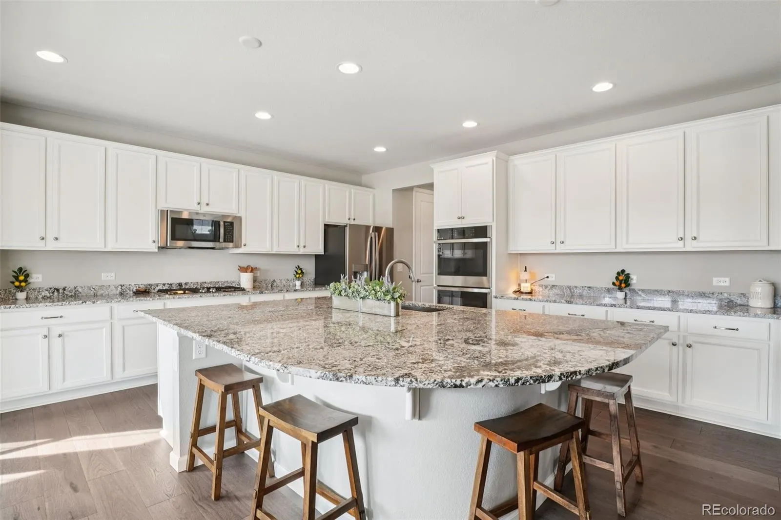 The main floor offers an open-concept layout ideal for everyday living and entertaining. A versatile flex room with elegant 8-foot French doors is perfect for a home office, playroom, or formal sitting area. The welcoming great room features a cozy tile fireplace, adding warmth and charm. The gourmet kitchen impresses with a large granite center island, stainless-steel appliances, double ovens, and a generous gathering space. The adjoining sunroom offers a bright, more formal dining area with views of the covered patio — perfect for outdoor dining and entertaining year-round.