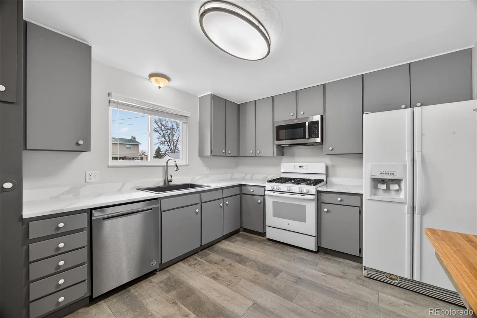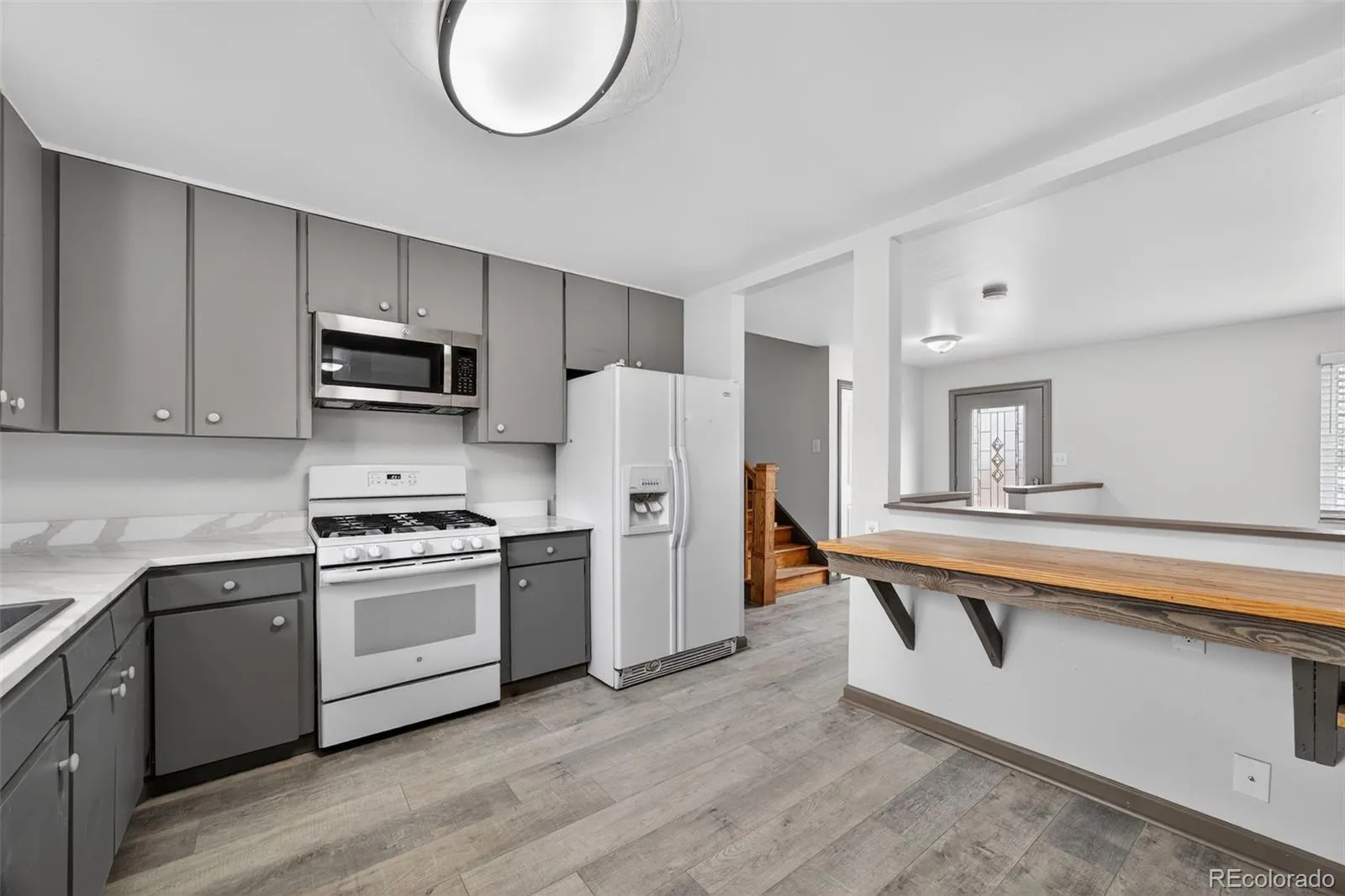 Step inside to a bright, open main level featuring beautiful hardwood flooring throughout the living and dining spaces, creating a warm and welcoming feel the moment you enter. All windows and exterior doors throughout the home were replaced last year, bringing in great natural light while also improving energy efficiency and comfort. The kitchen is both functional and inviting, highlighted by new quartz countertops and new laminate flooring, giving the space a clean, updated look that’s perfect for everyday living and entertaining.