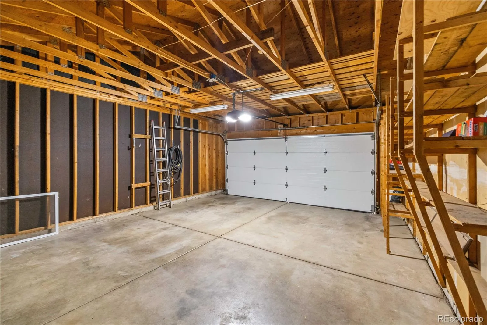 The oversized two-car garage includes extra storage shelving and a built-in workbench – ideal for hobbies, tools, or gear.