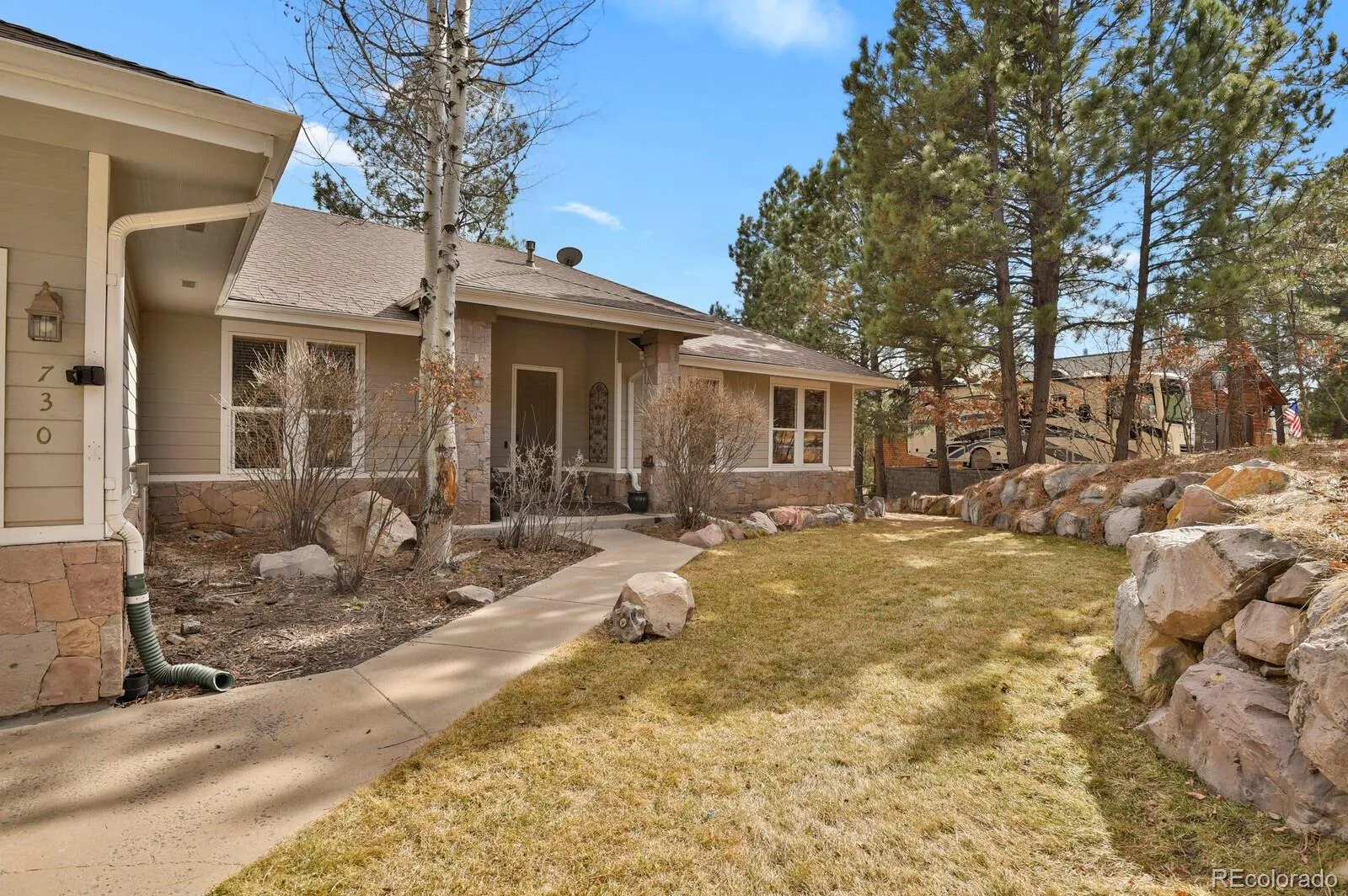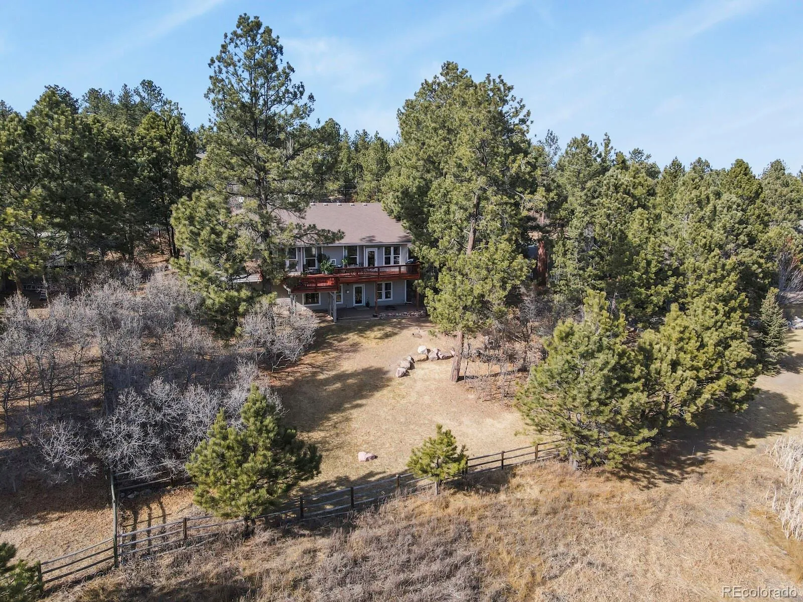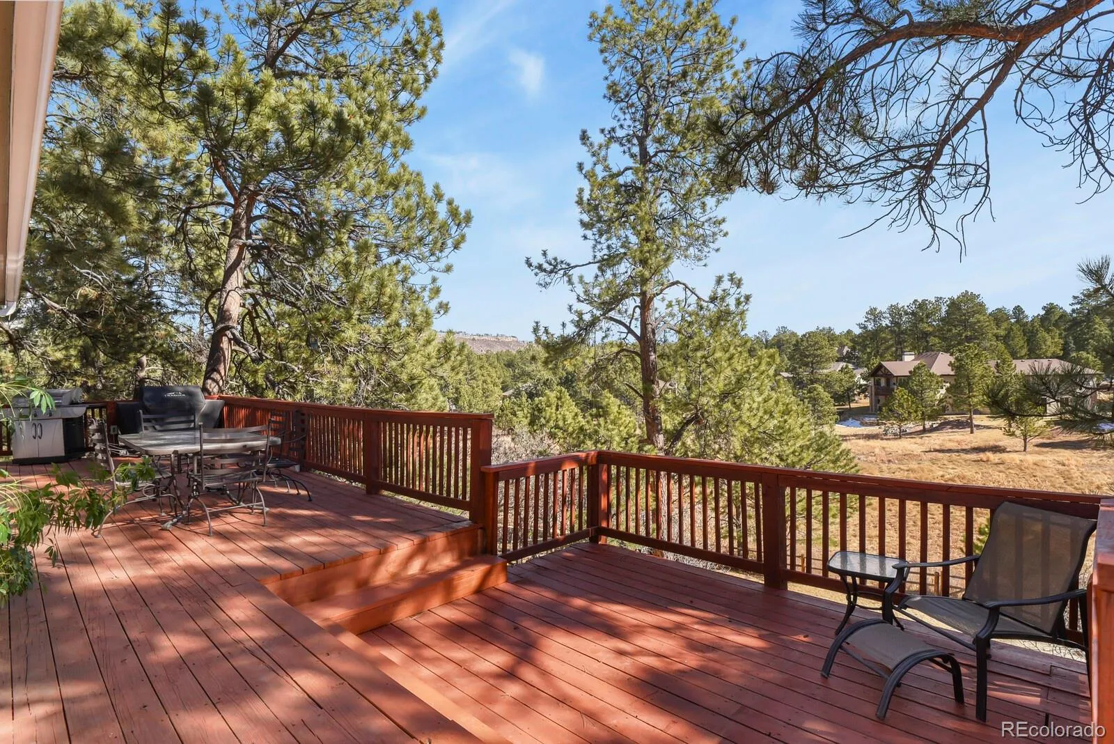 Welcome home to this stunning 5-bedroom, 4-bath ranch-style retreat, backing to open space! Thoughtfully designed to blend comfort, functionality, and the beauty of its natural surroundings. This brilliantly designed floor plan offers effortless main-level living while perfectly framing serene views of the surrounding landscape. This functional floorpan is exactly what you’ve been looking for! Main floor boasts 3 bedrooms and 3 baths for convenience. Large eat-in kitchen with granite counters and updated high quality appliances. Laundry room with cabinetry includes a convenient scrub sink! The oversized main level primary suite features its own walk-out to the rear deck with Sunbrella canopy where you can take in the abundant local wildlife or add a spa to soak your cares away after a long day. Primary also offers a luxurious spacious 5 piece bath and custom walk-in closet! The light and airy main floor flows seamlessly into an equally light and bright finished walk-out basement. This abundant space allows for entertaining large crowds, relaxing, or hosting guests in the secondary primary suites with attached 5 piece bath. Basement also features a cozy wood stove, separate home gym, and several storage areas to hide away clutter. This home could work very well for multigenerational living. Major systems have been updated within the past 3 years. This home is move-in ready! Whether you’re into enjoying quiet mornings or lively gatherings, this home truly has it all! Backing to open space, the property offers exceptional privacy and a true connection to nature with no rear neighbors, just beautiful scenery. With no HOA, you’ll also enjoy the freedom to park your RV or trailers. A rare combination of space, privacy, and thoughtful design, this home is a true sanctuary! Only 2 miles to Larkspur Elementary and 2 miles to Bear Dance Golf Club! Only 8 Miles to Safeway and even closer to the new proposed Castle Rock Costco location.