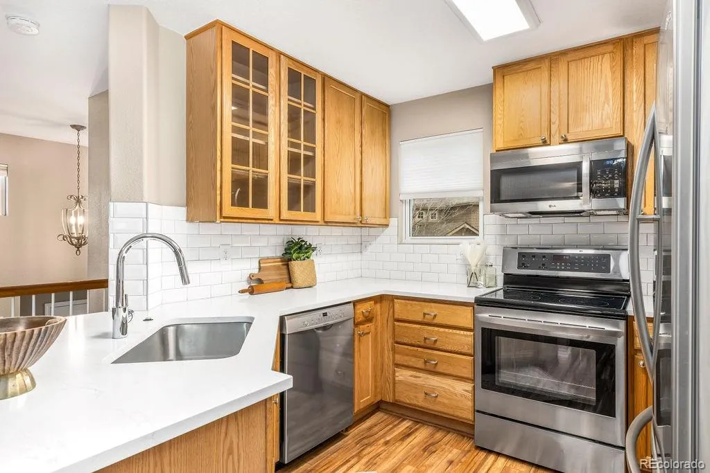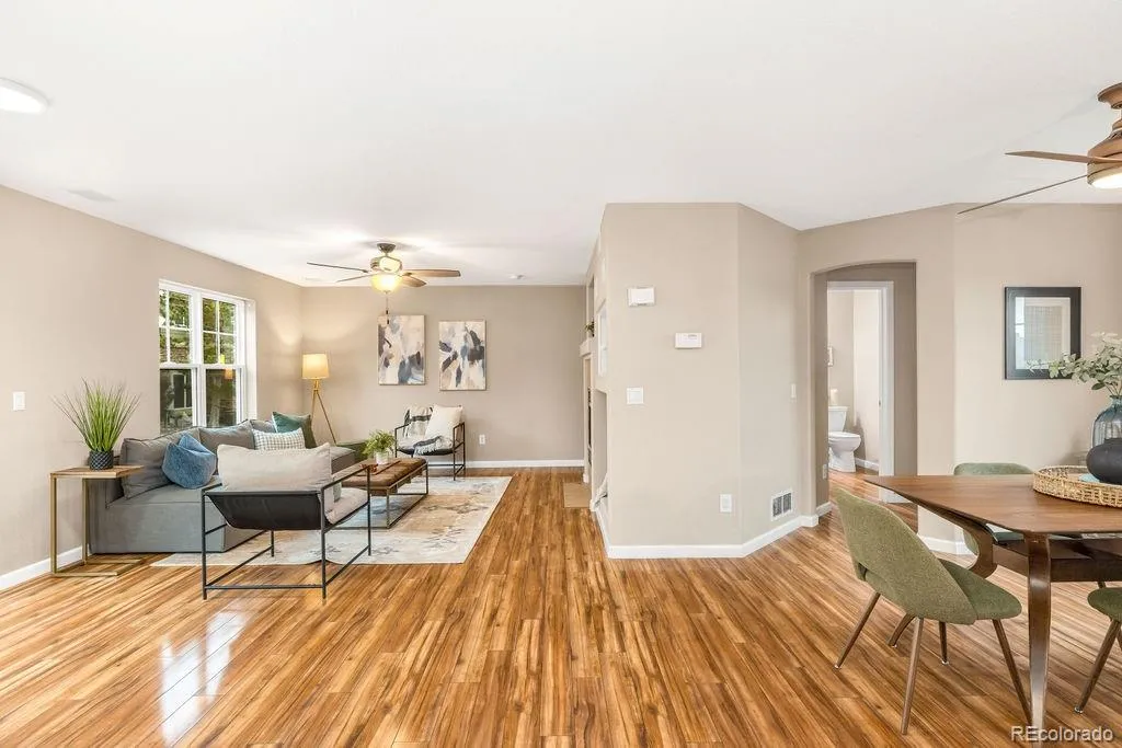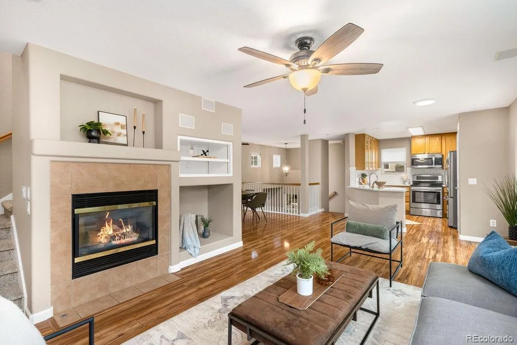 Located in the highly sought-after Cherry Creek School District, this light-filled end-unit townhome offers the perfect blend of comfort, functionality, and community living. Positioned next to a greenbelt and featuring a welcoming wraparound porch and back patio, this two-bedroom residence provides privacy, natural light, and thoughtful upgrades throughout.