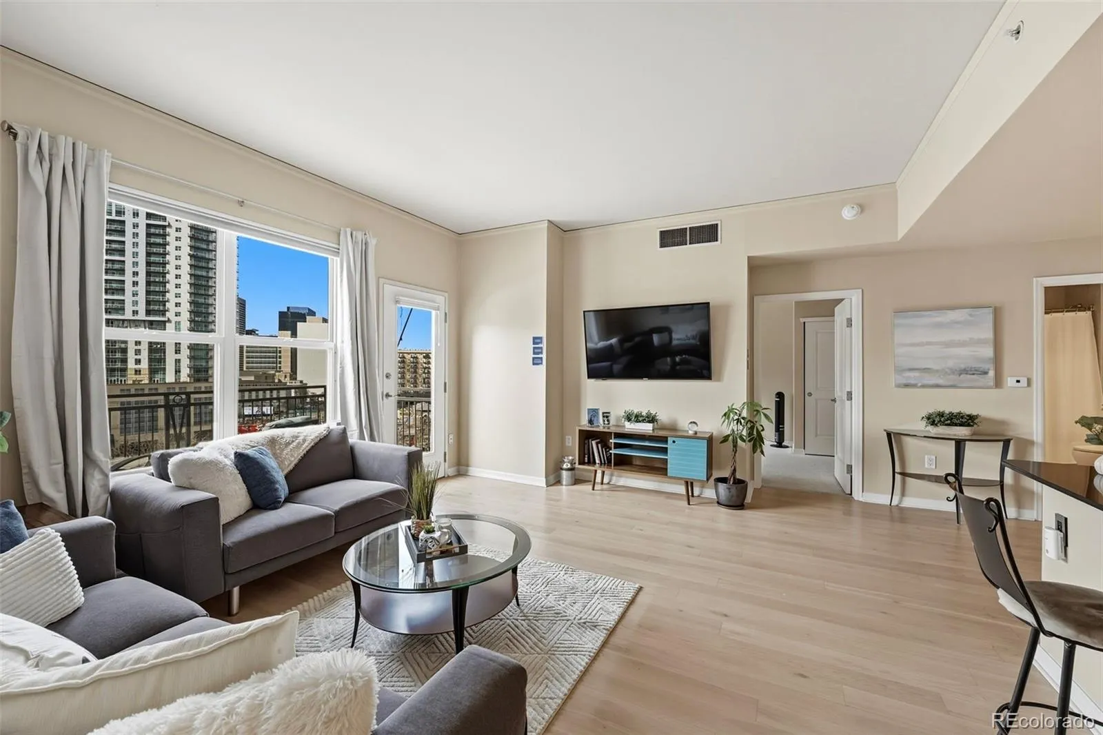Welcome to luxury penthouse living in the heart of Downtown Denver. This 8th-floor, top-floor condo at Grant Park offers panoramic city views, mountain views, and exceptional privacy with no neighbors above. This move-in ready 2-bedroom, 2-bath condo features an open floor plan, abundant natural light, hardwood floors, fresh paint, and expansive windows showcasing the Denver skyline. The updated kitchen includes granite countertops, stainless steel appliances, large island, ample cabinetry, and seamless flow into the living and dining areas—ideal for entertaining or working from home. Step onto your private balcony/terrace and enjoy unobstructed views of the city and Colorado sunsets. The spacious primary suite offers a walk-in closet and ensuite bath with dual vanities. The second bedroom is perfect for guests, a home office, or roommate setup. In-unit stackable washer and dryer included. It is a true 2 bedroom- 2nd bedroom is good size and then the primary suite. 2 bedrooms separated by the spacious family room-kitchen areas.