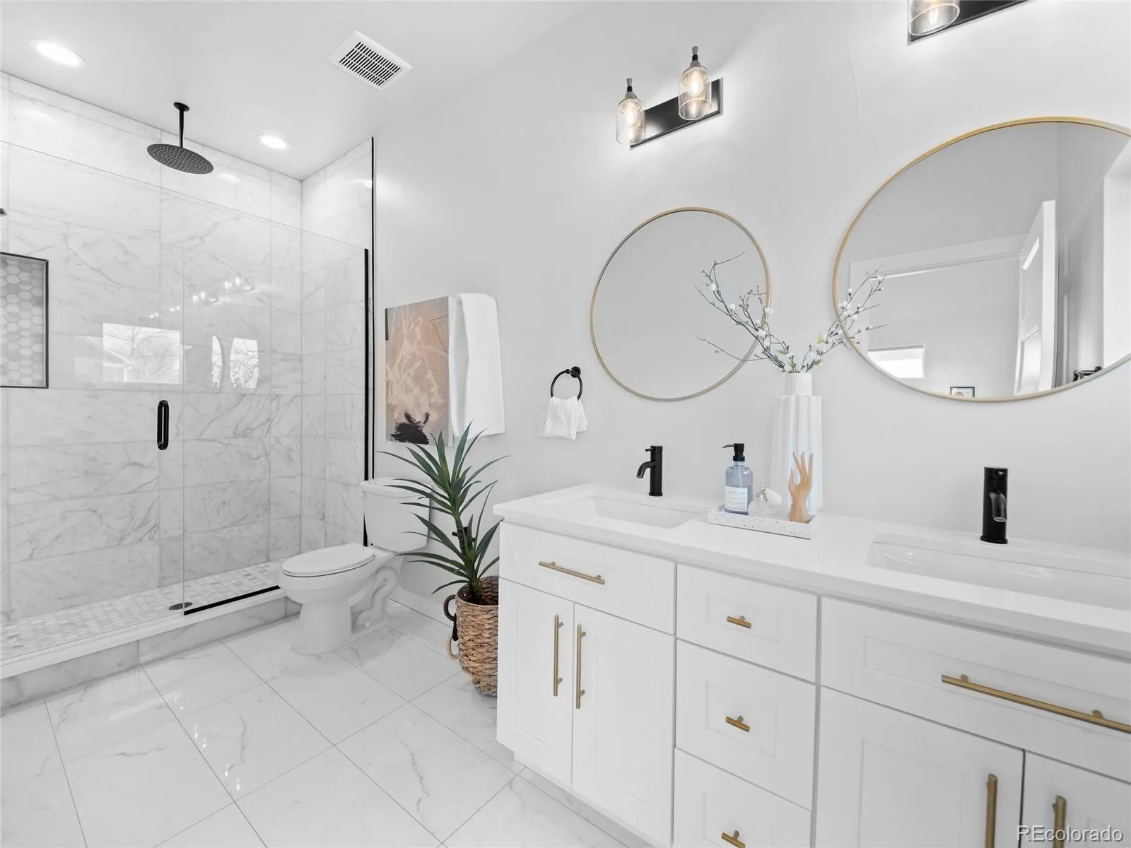 Upstairs, three bedrooms are thoughtfully positioned on the second level, including a well-appointed primary suite. The primary bath is finished with elevated materials and features an oversized glass enclosure with dual shower heads, creating a clean, spa-like aesthetic. A conveniently located upstairs laundry room includes the washer and dryer, adding everyday ease. Designer bathrooms throughout the home continue the cohesive, modern feel.