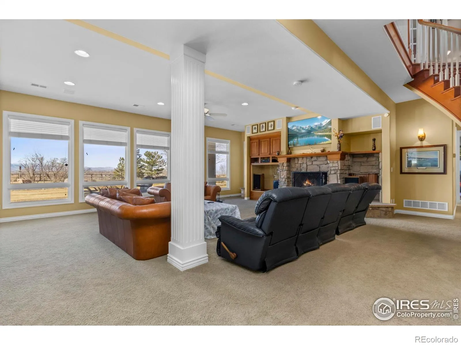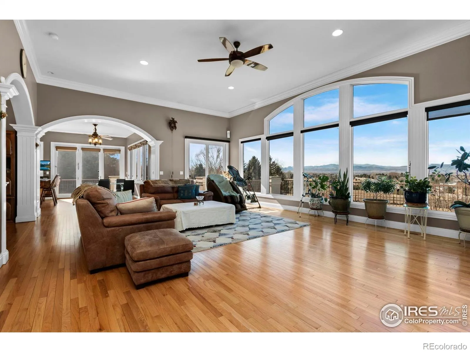 Picturesque High-End Custom home perched on 1.11+ acre lot w/ incredible mountain views. Located between Ft Collins & Windsor, in the highly sought after Highland Hills private community, convenient to I-25 + Fort Collins Schools! Wonderful curb appeal, perfect courtyard, private drive through, and privacy. Welcoming grand entry, showcasing the majestic snowcapped mountains and front range panorama views. High end Custom Ranch home, bosting 5,000+/- finished square feet, with luxury features, walkouts off just about every room to the beautiful setting. Wrap around covered composite deck, showcasing the views. Great history, very well maintained, pride of ownership shows throughout. Open, bright, inviting layout, lots of natural light, desirable floor plan, high ceilings, great for relaxing or entertaining. Nice upgrades, and nice touches all around. Gourmet kitchen w/subzero refrigerator, 6-burner gas range, double ovens, custom cherry cabinets & granite counters. Dramatic curved staircase & tall windows add to the ambiance. Finished walk out basement, great views, 9+ ceilings, with huge rec room, 2 beds, 2 baths, wet bar & fitness room. Dual water heaters/furnaces. If views & elbow room are hot buttons, check this out. New Roof Sept 2017. Incredible finish detail – this home could not be built for this price today! Additional features include ceiling fans, vacuum system, speaker system, 3 dishwashers, newer windows in living room, electronic sunshades, wood floors recently refinished, balcony deck was redone a few years ago, 3 fireplaces – basement fireplace is wood-burning, w/ cozy slate/stone. Upgraded newer Furnace and A/C, & lots of storage, 3+ finished oversized garage w/ windows. Newer wood floors, upgraded/replaced kitchen sink, newer window tinting, newer fence, newer tile, newer garage doors, newer window wells, and more! Close to golf courses, parks, Lake Loveland, natural open spaces, schools, shopping, dining, I-25 & more!