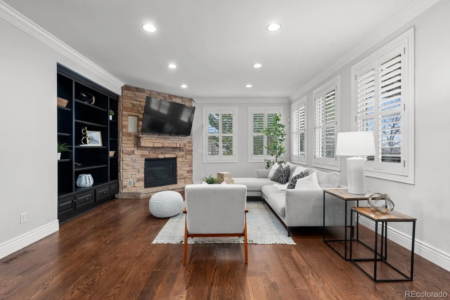 The family room’s focal point is set on the fireplace and custom built-in that overlooks the yard. As you step out onto the private back covered composite deck that is highlighted with a custom gas fireplace, overhead built-in heaters and private fully fenced yard overlooking the neighborhood greenbelt.
