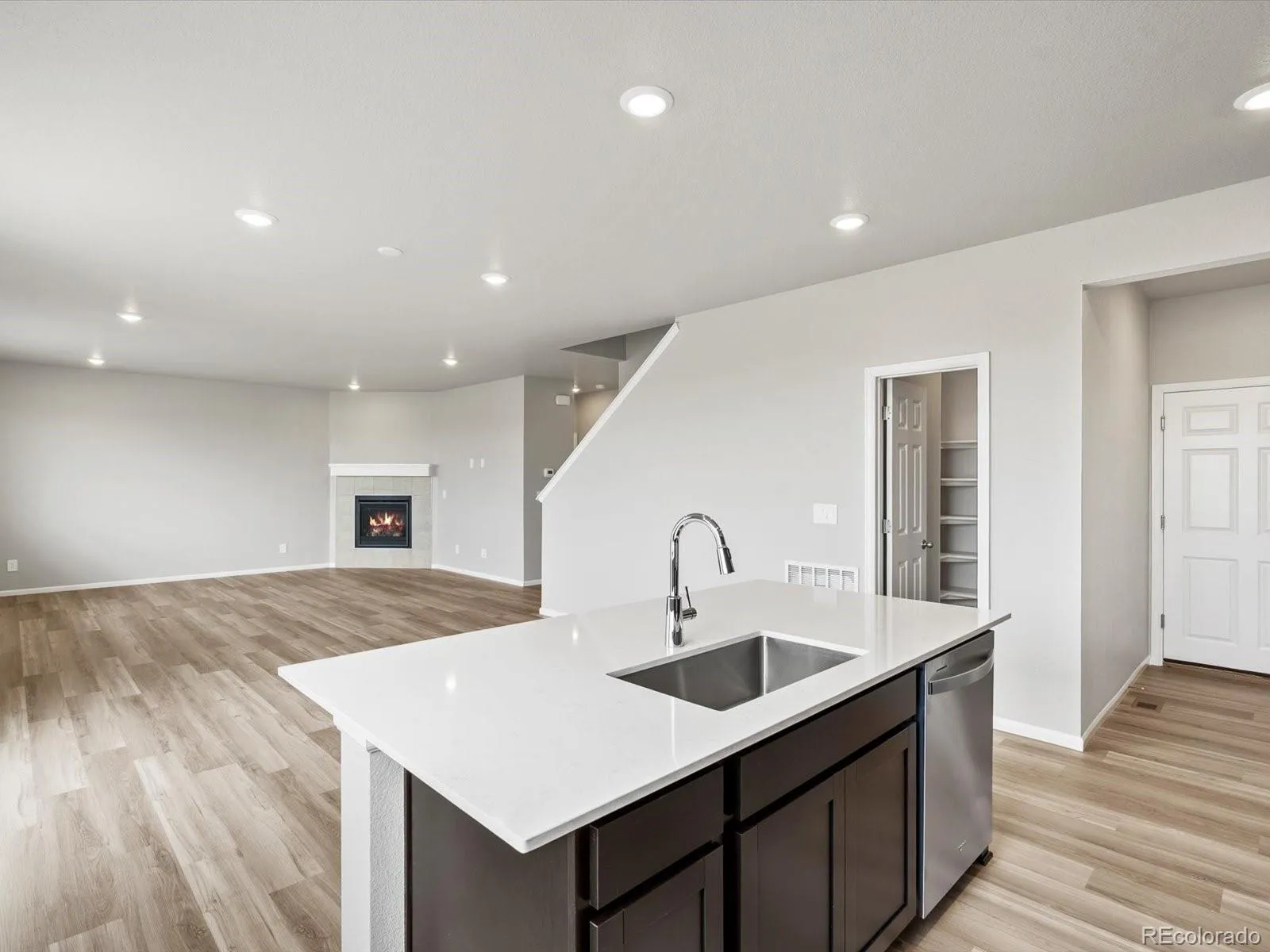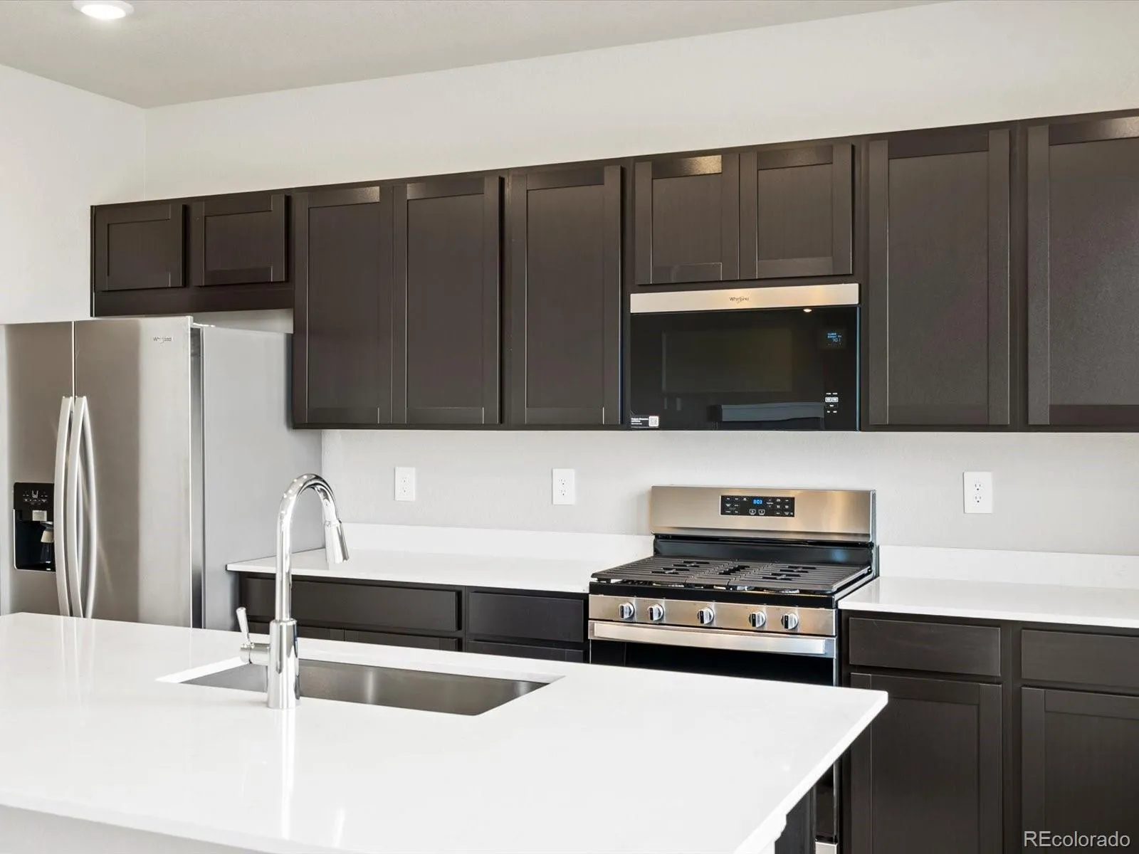 Open concept kitchen with quartz countertops and espresso cabinets!