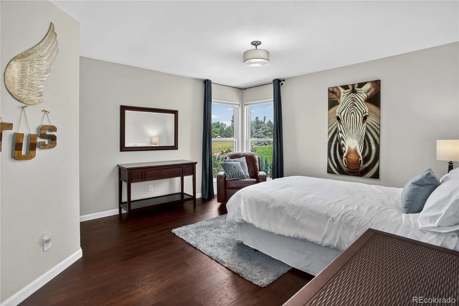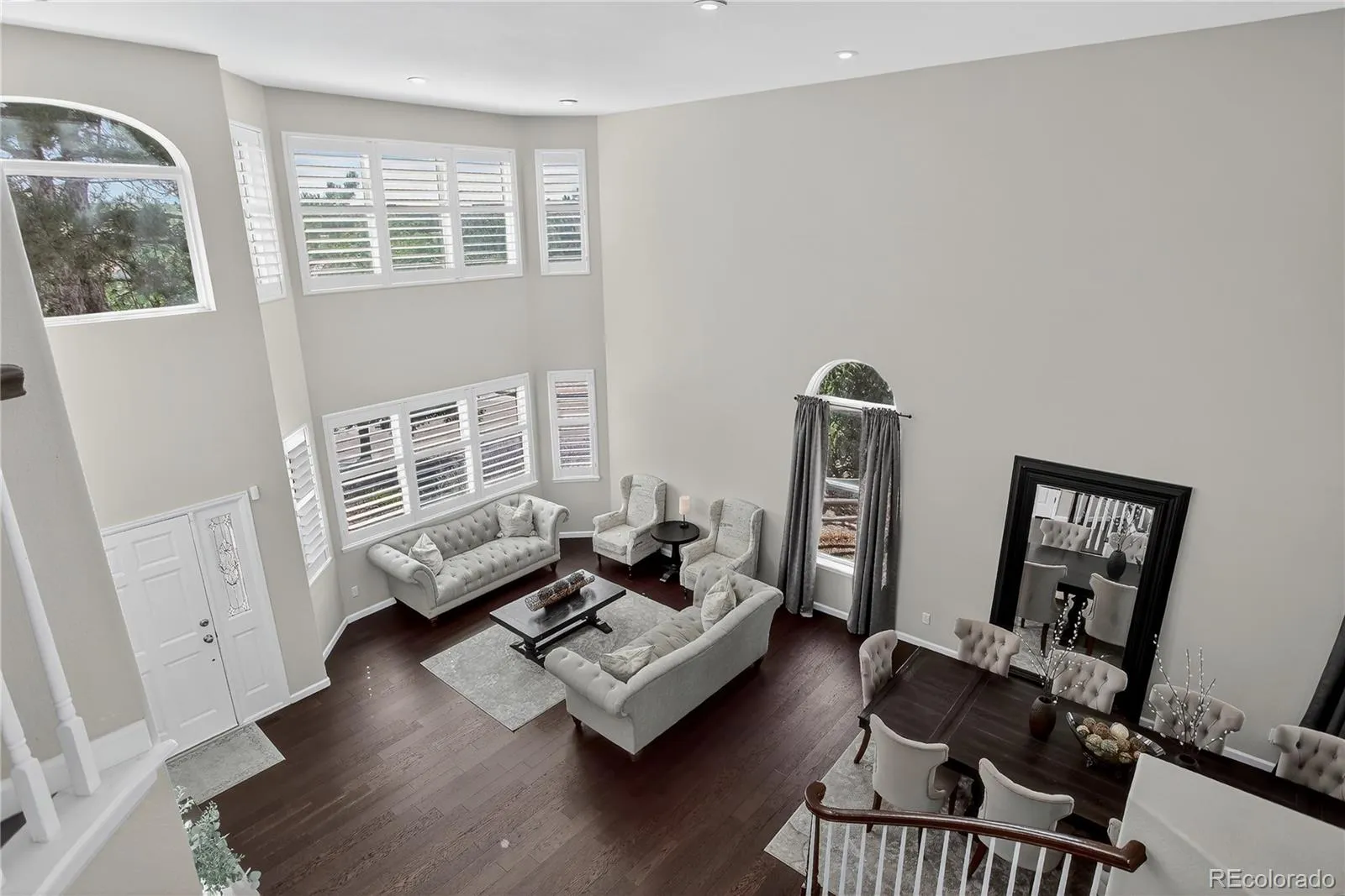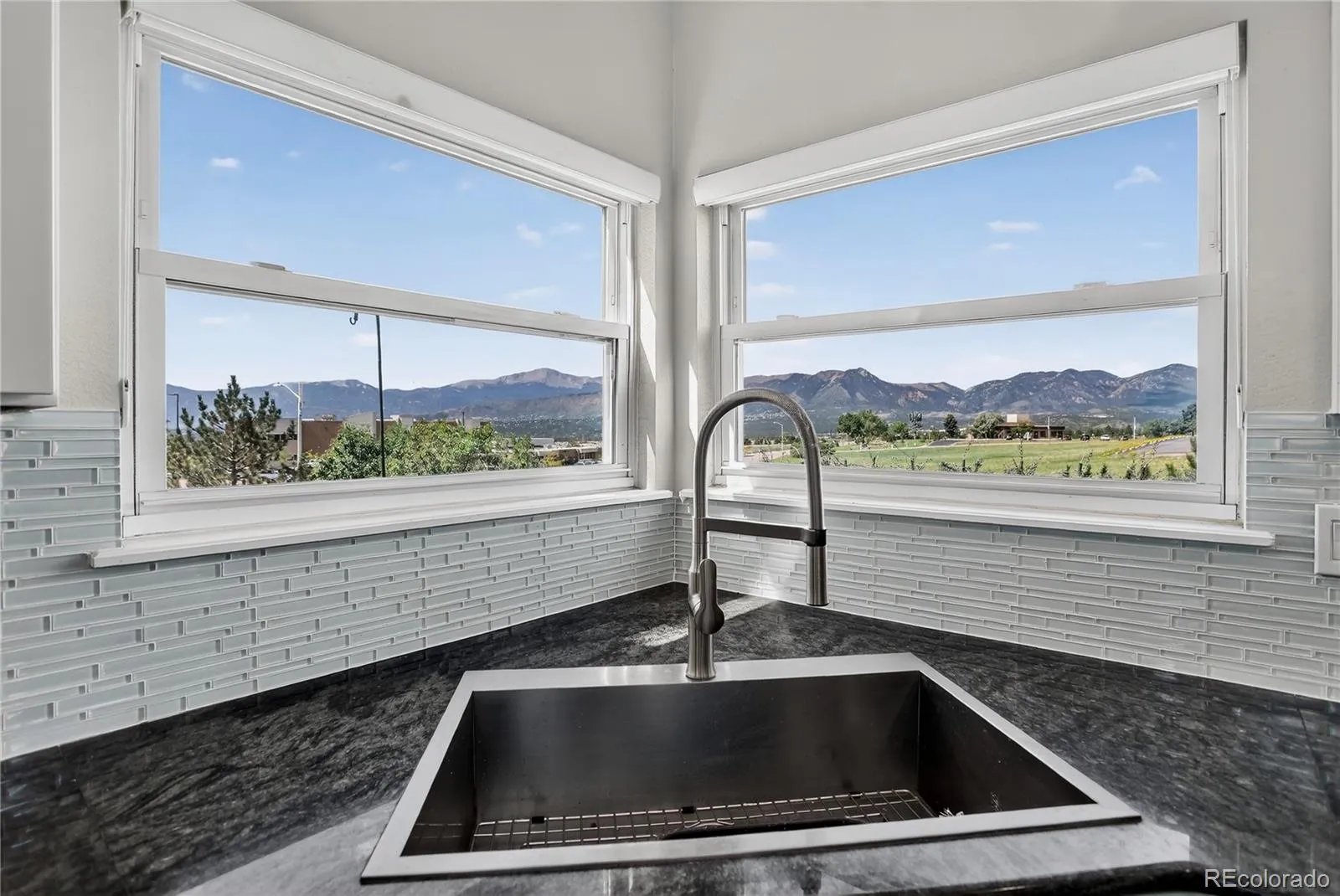 Showcasing stunning views of Pikes Peak and the Front Range, this inviting 7 bed & 4 bath home blends everyday comfort with thoughtful design. A welcoming front living room and adjoining dining area feature soaring two-story ceilings and abundant natural light. The eat-in kitchen offers soft-close cabinetry with crown molding, granite countertops, dual ovens, a walk-in pantry, and an island with bar seating—perfect for gathering. Step outside to a spacious deck overlooking mountain scenery, or relax in the family room complete with a gas fireplace, & wet bar. Upstairs, French doors open to the primary suite with a vaulted ceiling, fireplace, and 5-piece bath with a soaking tub. The lower level includes a rec room with dry bar and dedicated office space for work or play. Additional bedrooms are available on every level of this home, including the option for a main-level guest suite or office. Enjoy outdoor living with a turf yard featuring putting holes, a playground area, and established professional landscaping. The xeriscaped front yard ensures easy maintenance. A 3-car garage, RV pad, and Tuff Shed provide ample storage and flexibility. Located in a peaceful setting with excellent D20 schools, convenient access to I-25, shopping, and restaurants, this property offers comfortable Colorado living with room to relax and enjoy breathtaking sunsets.