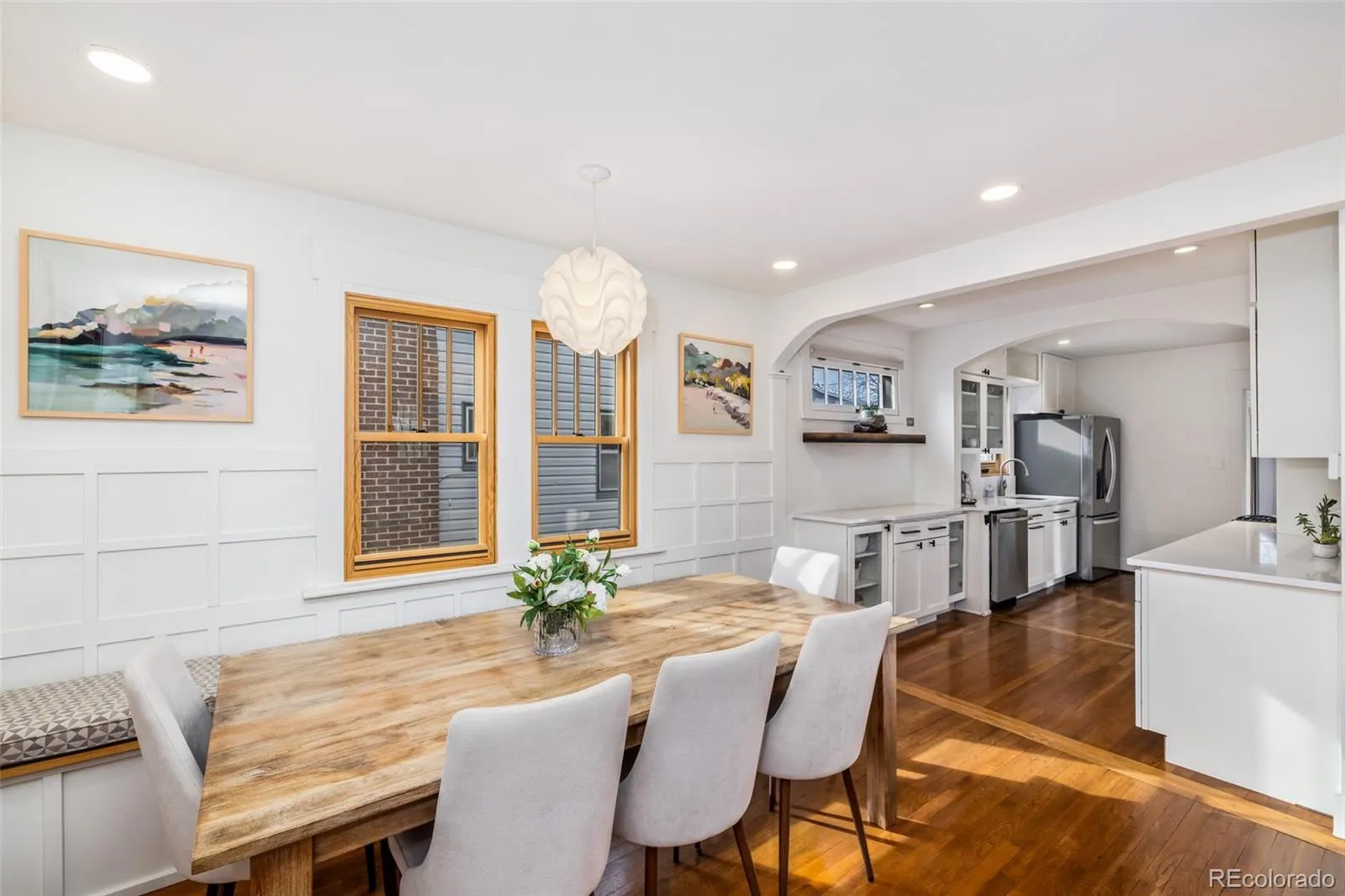 Step inside to an open, sun-filled layout that flows from living to dining to kitchen, featuring original hardwood floors and custom wainscoting that nod to the home’s 1920s character. The remodeled kitchen shines with quartz countertops, stainless steel appliances, and sleek cabinetry—offering the perfect mix of style and functionality for everyday cooking or casual get-togethers.