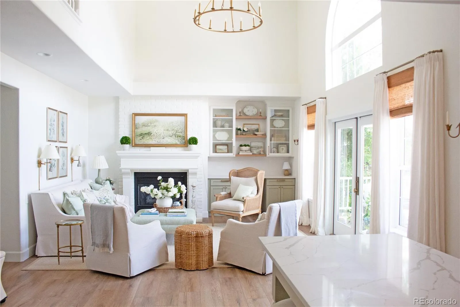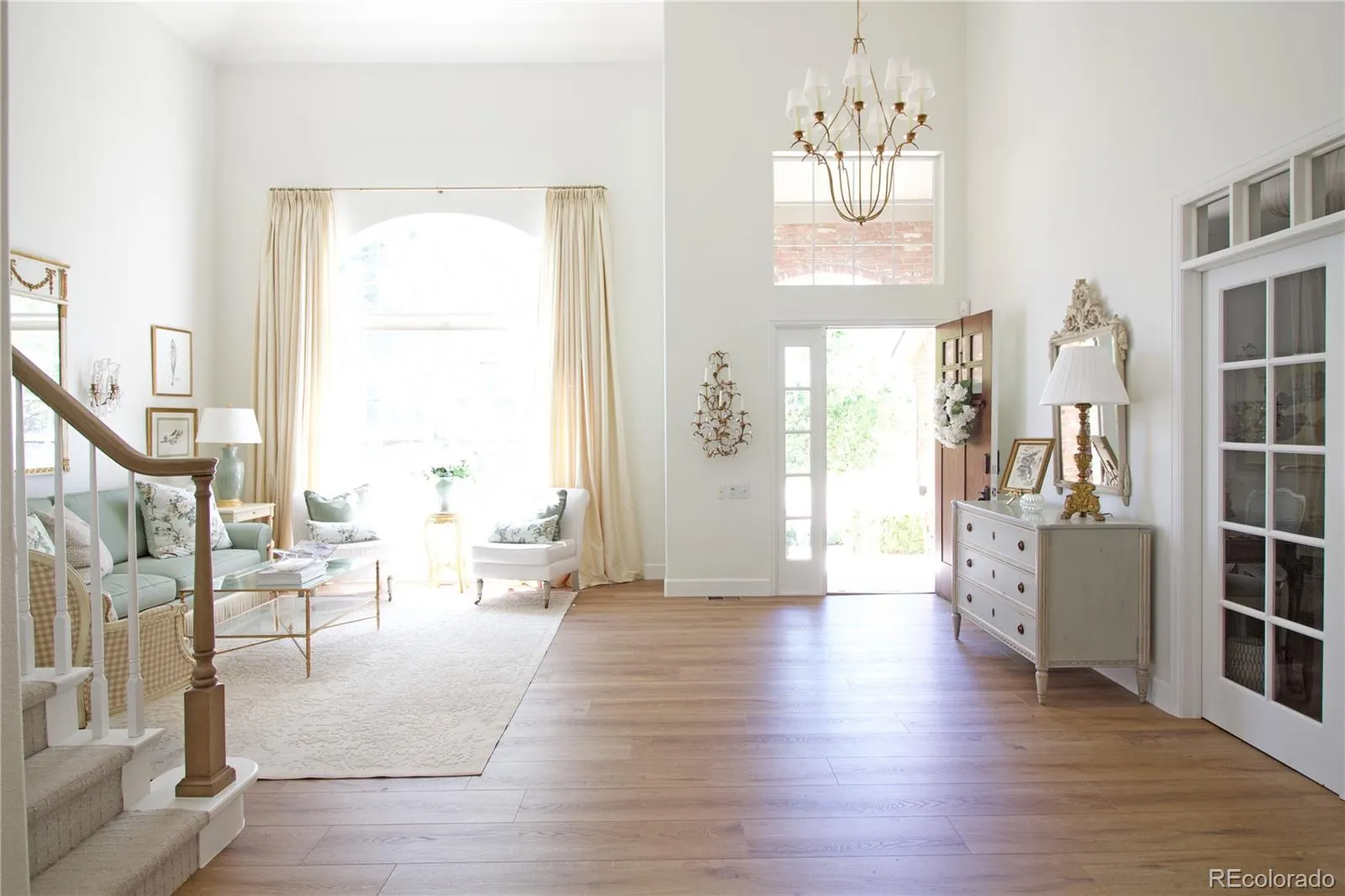 Sophisticated design and modern upgrades define this Castle Pines home with 5 bedrooms, 4 bathrooms, and 4,197 finished sq ft—plus approximately 300,000 dollars in improvements. The entry opens to a bright, two-story living room with warm white walls, designer chandelier, and Goldin Oak COREtec engineered hardwood flooring throughout the main level.
