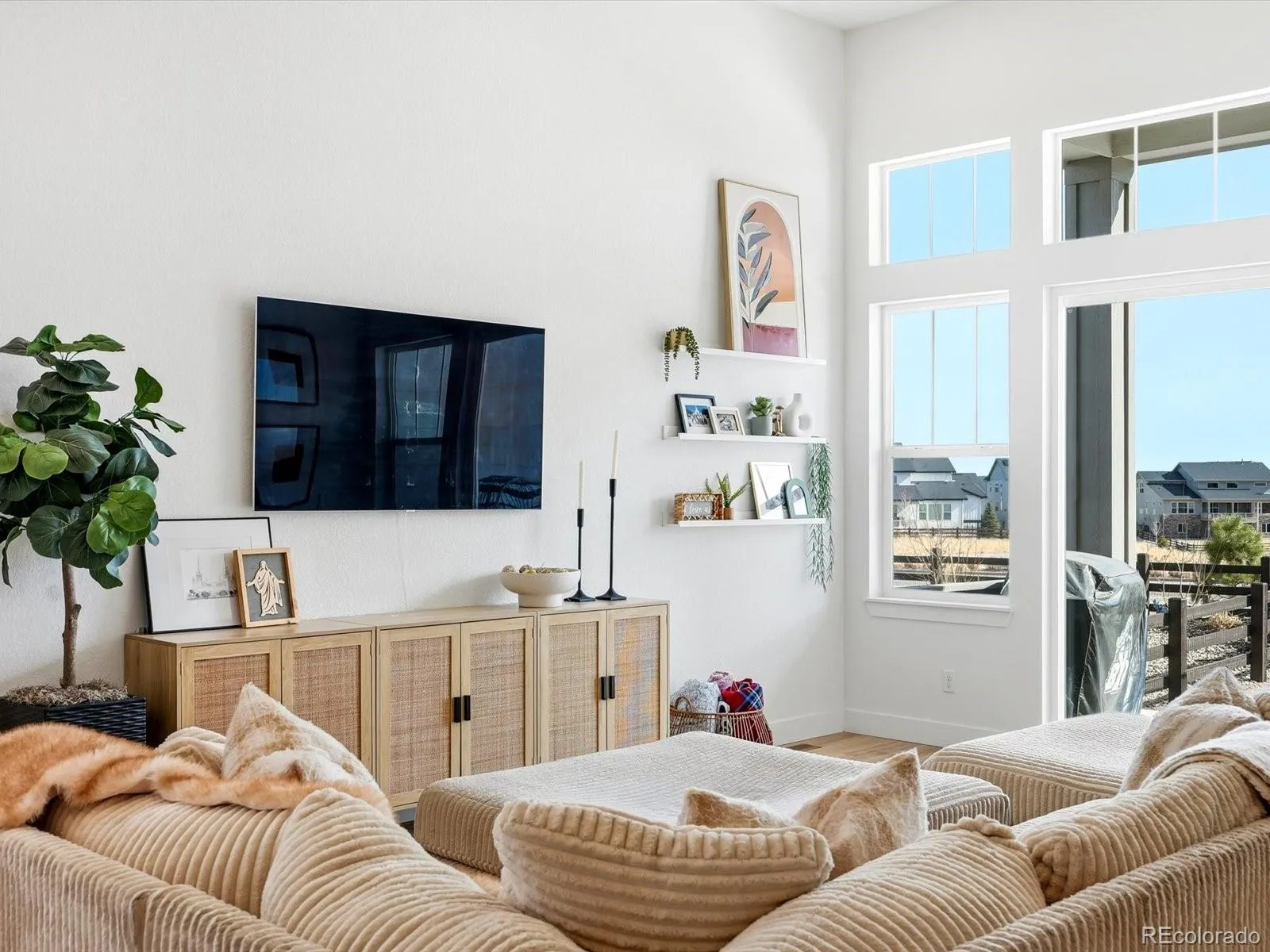 This exceptional home features 13-foot ceilings in the main living areas and a large sliding door that opens to the covered patio—perfect for entertaining or enjoying the tranquil views of open space.