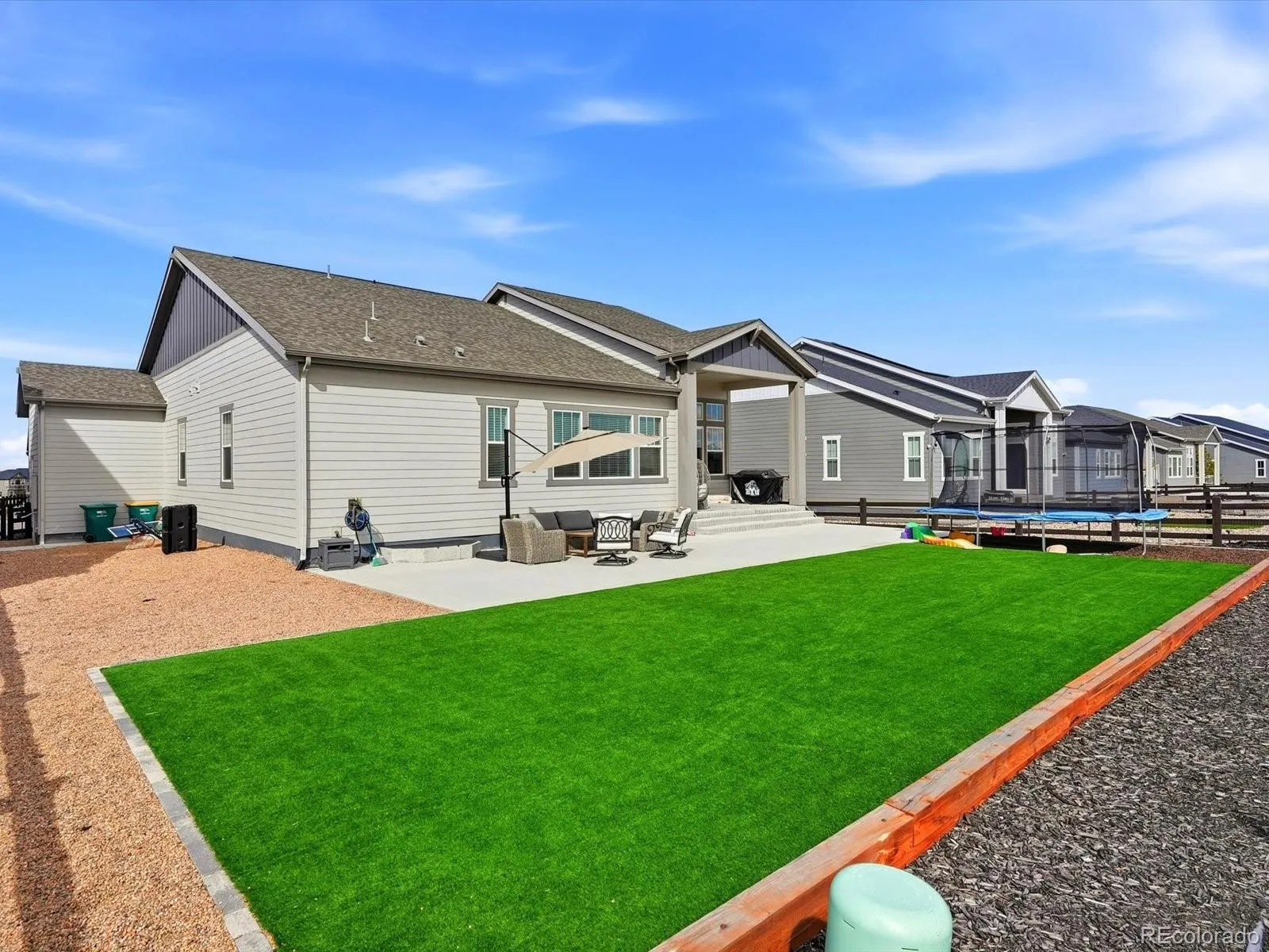 Step outside to a beautifully designed backyard featuring a covered patio as well as a spacious poured concrete pad and low-maintenance turf—ideal for relaxing or hosting gatherings.