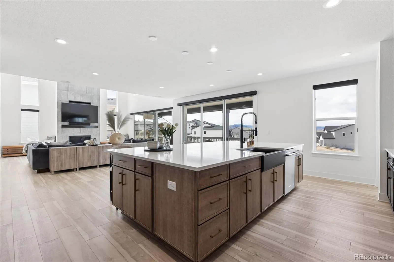 surfaces that perfectly complement the wide-plank flooring. Glass sliding doors