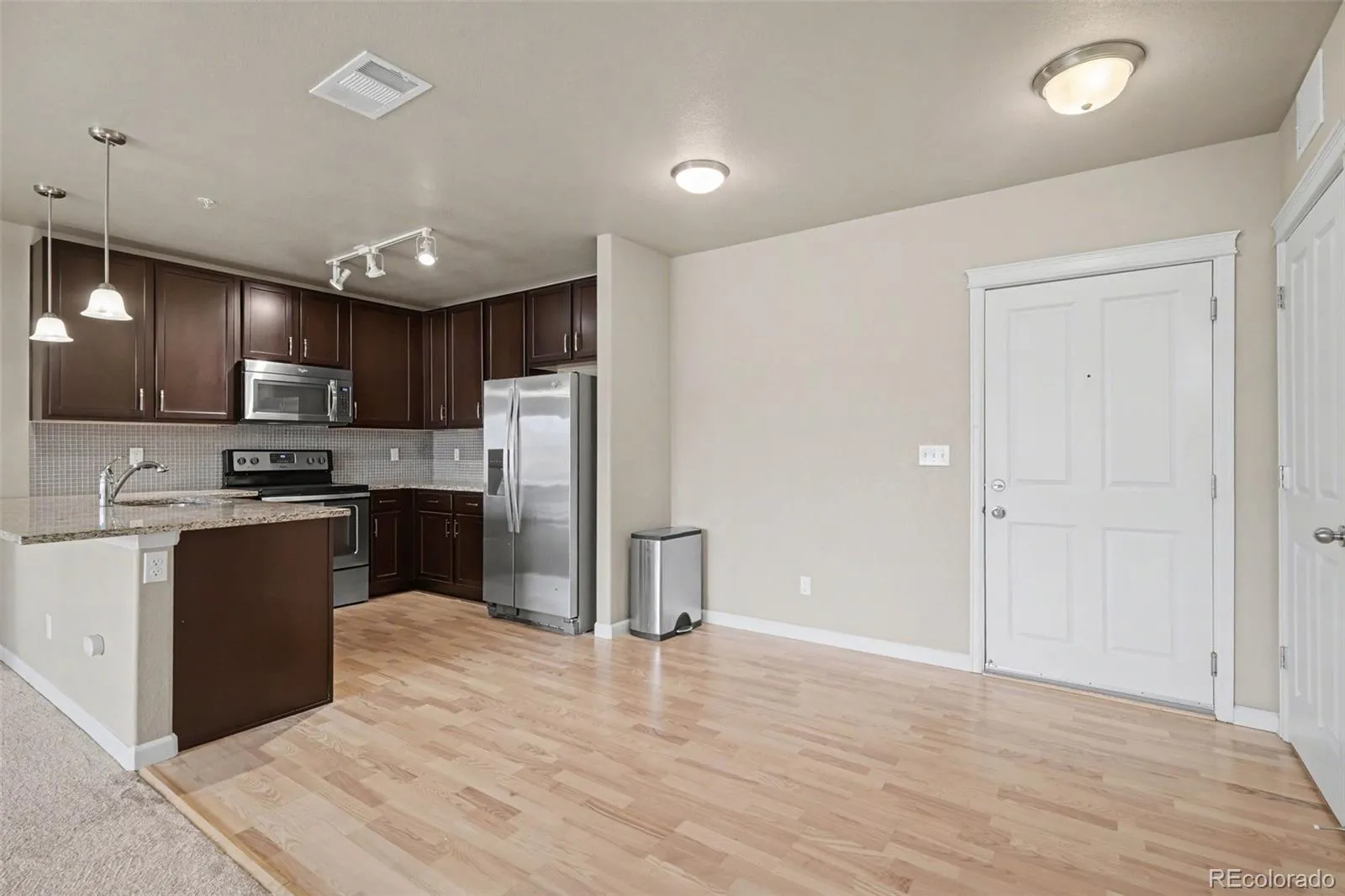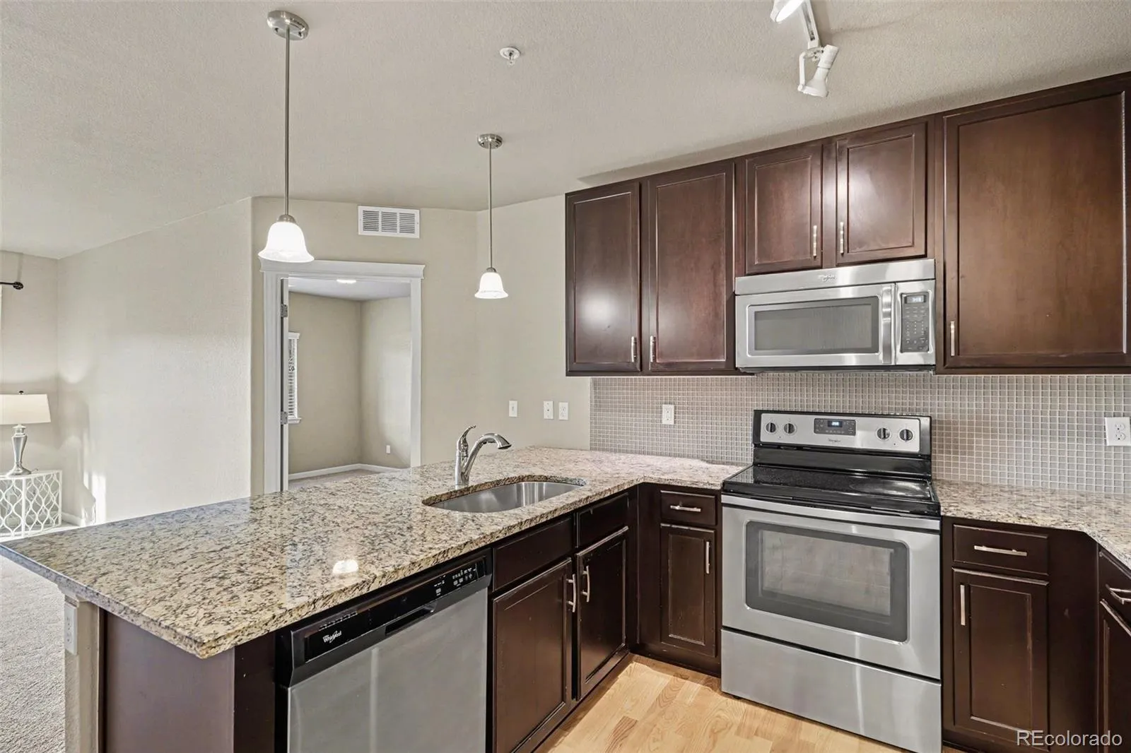 Welcome to low-maintenance living in the heart of Highlands Ranch Town Center — where you can actually walk to dinner, coffee, the library, and groceries instead of planning your whole evening around a drive. This ground-level, no-stairs condo was thoughtfully updated and feels far newer than its build date. Inside, the open layout immediately feels comfortable and functional. The living room centers around a cozy gas fireplace and opens to a covered patio with partial mountain views — a great spot for morning coffee or grilling on a permitted propane BBQ. The kitchen is one of the highlights: a large granite peninsula perfect for barstools and conversation, rich espresso cabinetry, stainless steel appliances, modern tile backsplash, undermount sink, and great lighting. It flows naturally into the dining space and living area, making the home feel larger than its footprint. The floor plan is smartly split, placing the secondary bedroom and full bath on one side and the primary suite on the other for privacy. The primary suite offers a walk-in closet and a spacious bath with granite vanity and a large walk-in shower with built-in bench seating. Full-size in-unit laundry adds everyday convenience. Comfort is year-round with central A/C and forced hot water heat, and the building itself is well-constructed and noticeably quieter than typical apartment-style living. Secure building entry, a outdoor deeded parking space, large fenced/secure storage area, and ample guest parking make day-to-day life easy. Living here also means access to Highlands Ranch Community Association amenities — multiple rec centers, pools, fitness facilities, tennis courts, miles of trails, and expansive open space — all while being minutes from award-winning schools. Ask your agent for a list of the nearby local amenities! If you’ve been waiting for a place where location actually changes your lifestyle, this one is worth seeing in person.