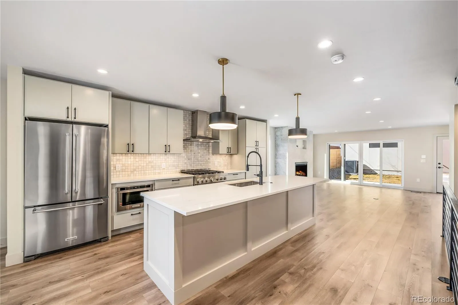 features luxury laminate plank flooring, a sleek gas fireplace, and a chef-inspired kitchen with soft-close cabinetry, under-