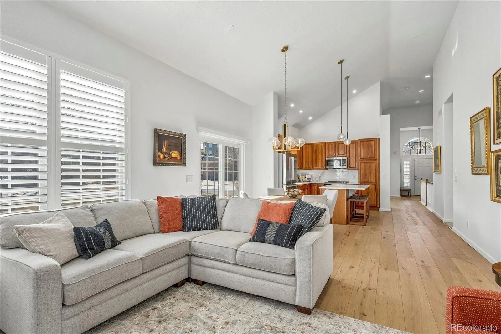 COMING SOON! FABULOUS LOW MAINTENANCE RANCH in the Star Pass community at Saddle Rock Golf Club! Approximately 3,576 total sq ft includes 1,788 beautifully finished sq ft on the main floor plus a full basement with multiple egress & garden level windows. The vaulted ceilings & walls of windows showcase the beautiful wide plank wood flooring & the generously sized rooms. There’s an abundance of natural cherry cabinets & storage in the updated kitchen with large seating/serving island, quartz counters, full height tile backsplash, composite farm sink, & stainless appliances. The kitchen & breakfast nook open to the living room with full length mantle over the quartz fireplace surround & built in shelves. The formal dining room/flex space is stunning with high ceiling, wall of windows, updated light fixture and space to seat a crowd. Working from home? You’ll appreciate the main floor study overlooking the front entry & large yard – easy to convert to a 3rd main floor bedroom. The luxurious primary retreat encourages relaxation – with stunning walk-in shower, oversized jetted tub, & ample counter and storage space. A second main floor bedroom, updated bath with shower, & main floor laundry with sink, cabinets, & included washer & dryer complete the main floor. Recent updates/features include white oak engineered hardwood flooring & high quality carpet/pad, updated light fixtures & ceiling fans, plantation shutters, newer furnace & A/C, newer roof, garage door, & exterior paint; Rachio sprinkler controller & water efficient sprinkler heads. This property has one of the larger lots in the neighborhood; the lot can be fenced, patio size can be increased. Low HOA fees ($202/month) include landscape maintenance, snow removal (3+ inches), trash, recycling, 2 community pools, tennis courts, parks, trails & clubhouse. Top ranked Cherry Creek Schools include Grandview High. Convenient to DIA, DTC, E470, shopping & recreation. Schedule a tour & make this home yours!