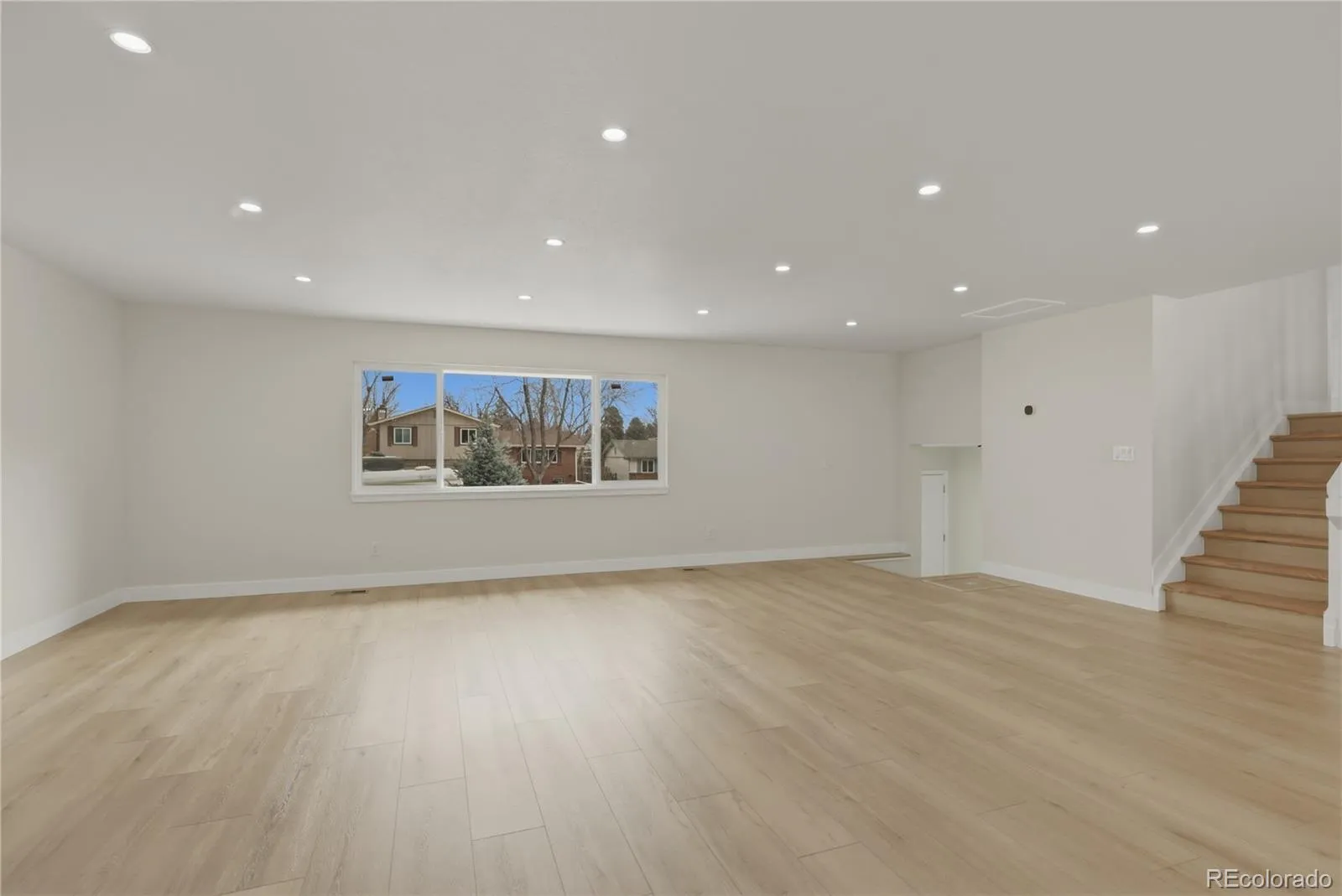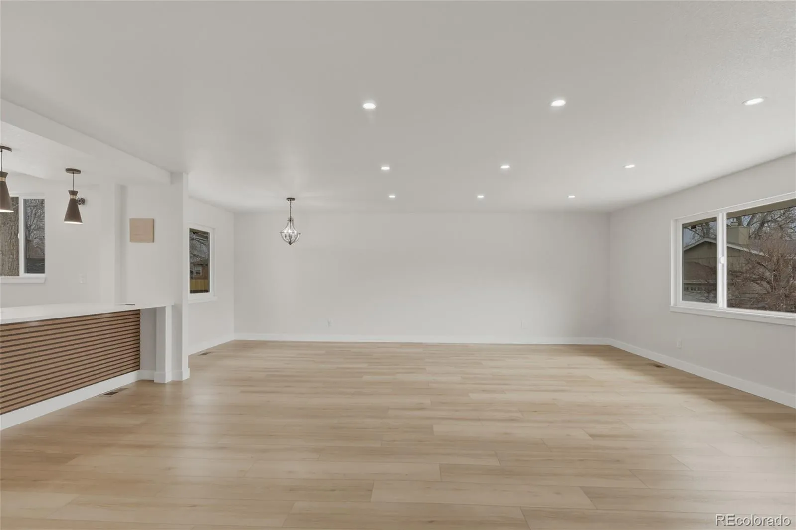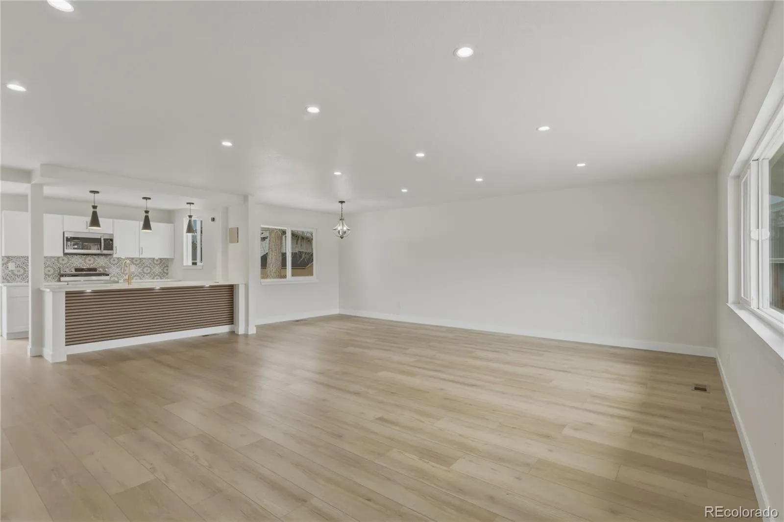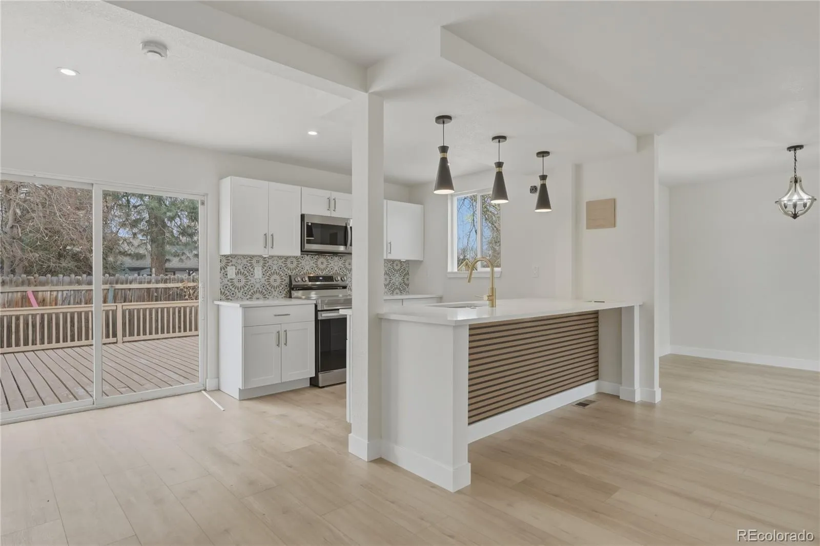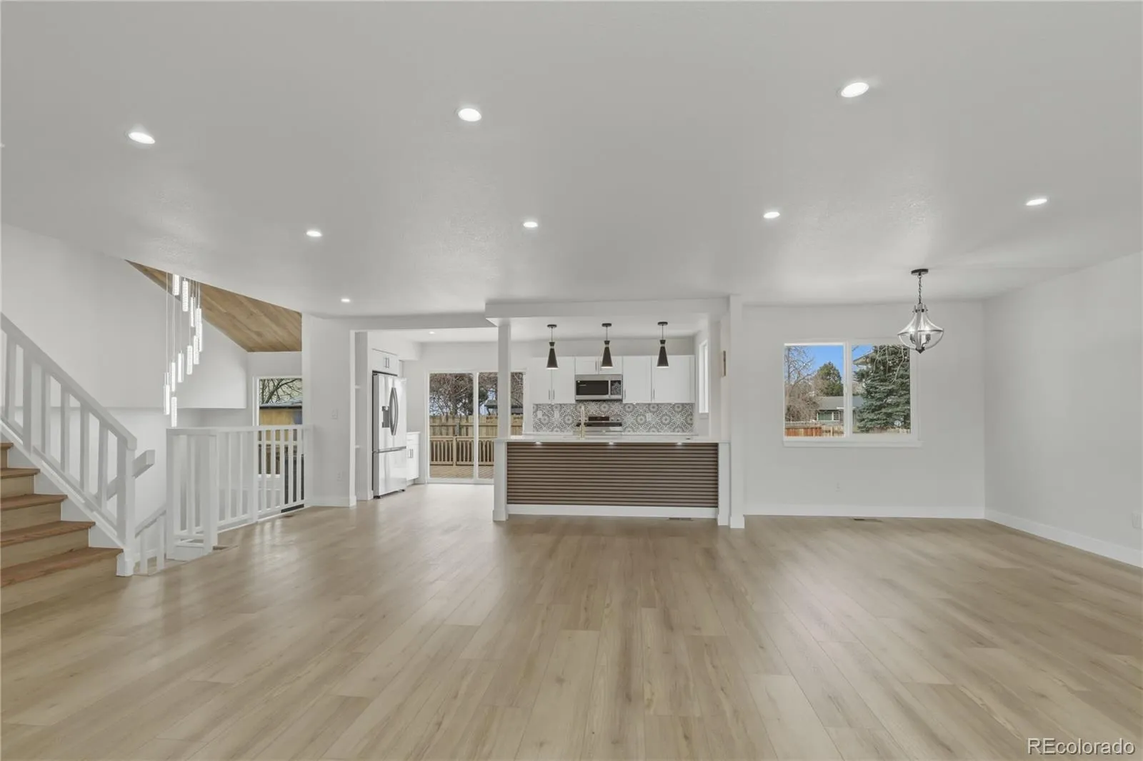 The show-stopping kitchen boasts sleek granite countertops, a large statement island, and all-new stainless steel appliances, flowing seamlessly into open living spaces highlighted by a striking new electronic fireplace—creating the perfect setting for both entertaining and everyday living.