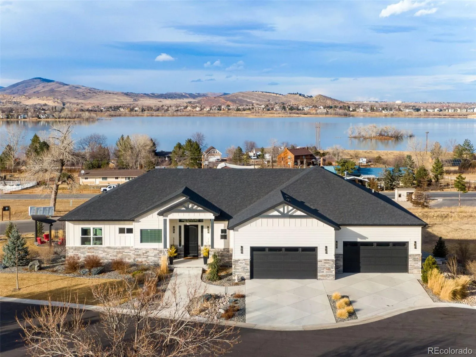 Open House Sat 21st and Sun 22nd, 12-3PM. Come see why Loveland, CO is frequently voted as one of the best places to live or retire in America. Known as the City of Love, Loveland is the gateway to Estes Park and Rocky Mountain National Park, and offers outstanding restaurants, entertainment, breweries, community festivities, trails, parks, and recreation. Incredible Boedecker Lake and Rocky Mountain views. This home offers luxury living at its finest and you can enjoy nature and wildlife from nearly every window. This custom-built ranch style property offers something for everyone with over 5,400 total square feet. 5 beds, 5 baths and an oversized 4 car finished garage with southern exposure for plenty of natural snow melt. The main floor features a split floor plan with an expansive primary bedroom taking the entire east wing. Both guest bedrooms are spacious and feature private baths and patio access. The gourmet kitchen features a walk-in pantry, stainless steel appliances, 5-burner gas range, double ovens, pot-filler, granite slab countertops and a center island with breakfast bar. Large dining area overlooks the open space and lake. The primary suite with retreat features a large walk-in closet plus a 5-piece luxury bath with oversized shower and freestanding clawfoot tub. The family room offers spectacular views, vaulted ceilings, and a gas fireplace with floor to ceiling stone. The walk-out basement features 9′ ceilings, 2 additional bedrooms (one currently used as an office), media corner, billiard room, wet bar, and plenty of storage. The oversized covered and uncovered patio features Trex decking, iron railing, and landscape lights. Additional features include central A/C, 2 40-gallon water heaters, active radon system, wood-burning fire-pit with pergola, sprinkler and drip system, hardwood floors, high-end light fixtures, humidifier, and so much more. For a full list of features, floor plan, or to schedule a showing, please contact the listing brokers.