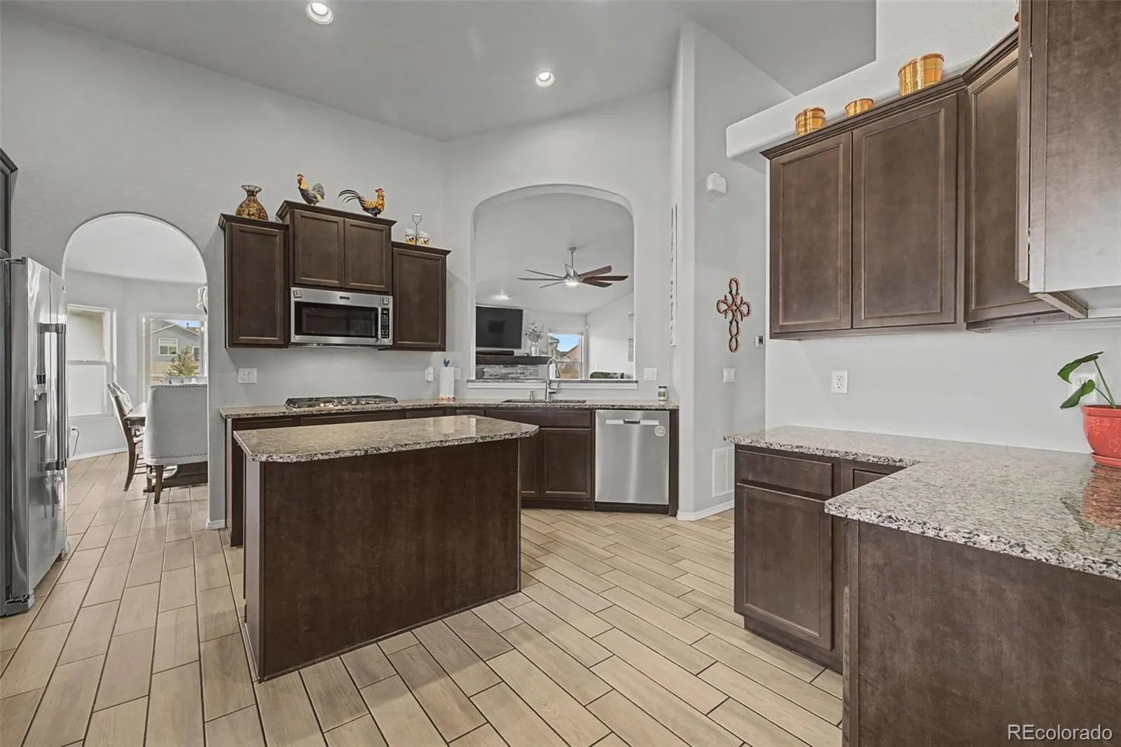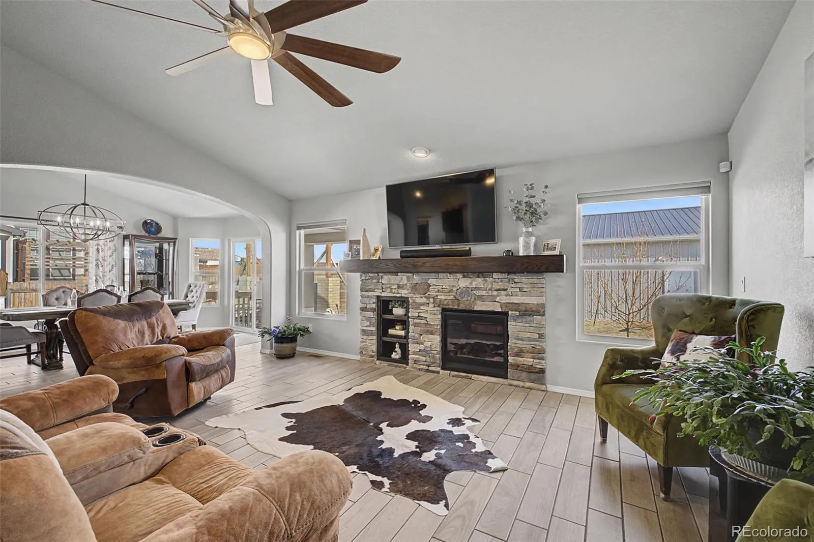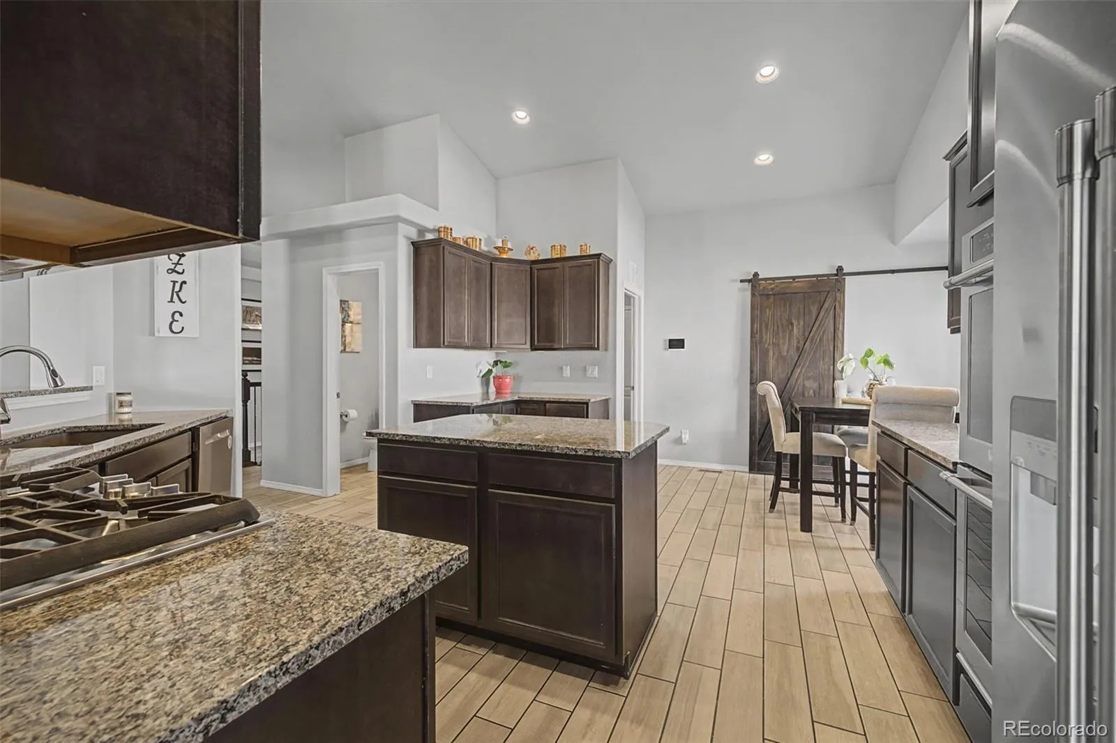 Vaulted ceilings and an open-concept layout create an inviting atmosphere, anchored by a stunning flagstone fireplace in the great room, creating a warm focal point that instantly feels like home. The kitchen is both functional and elegant, featuring granite countertops, a large island, Blanco Diamond double sink, Aristokraft Sinclair birch cabinetry, and a walk-in pantry with barn doors. A kitchen nook and separate formal dining space offer flexibility for both casual and formal gatherings.