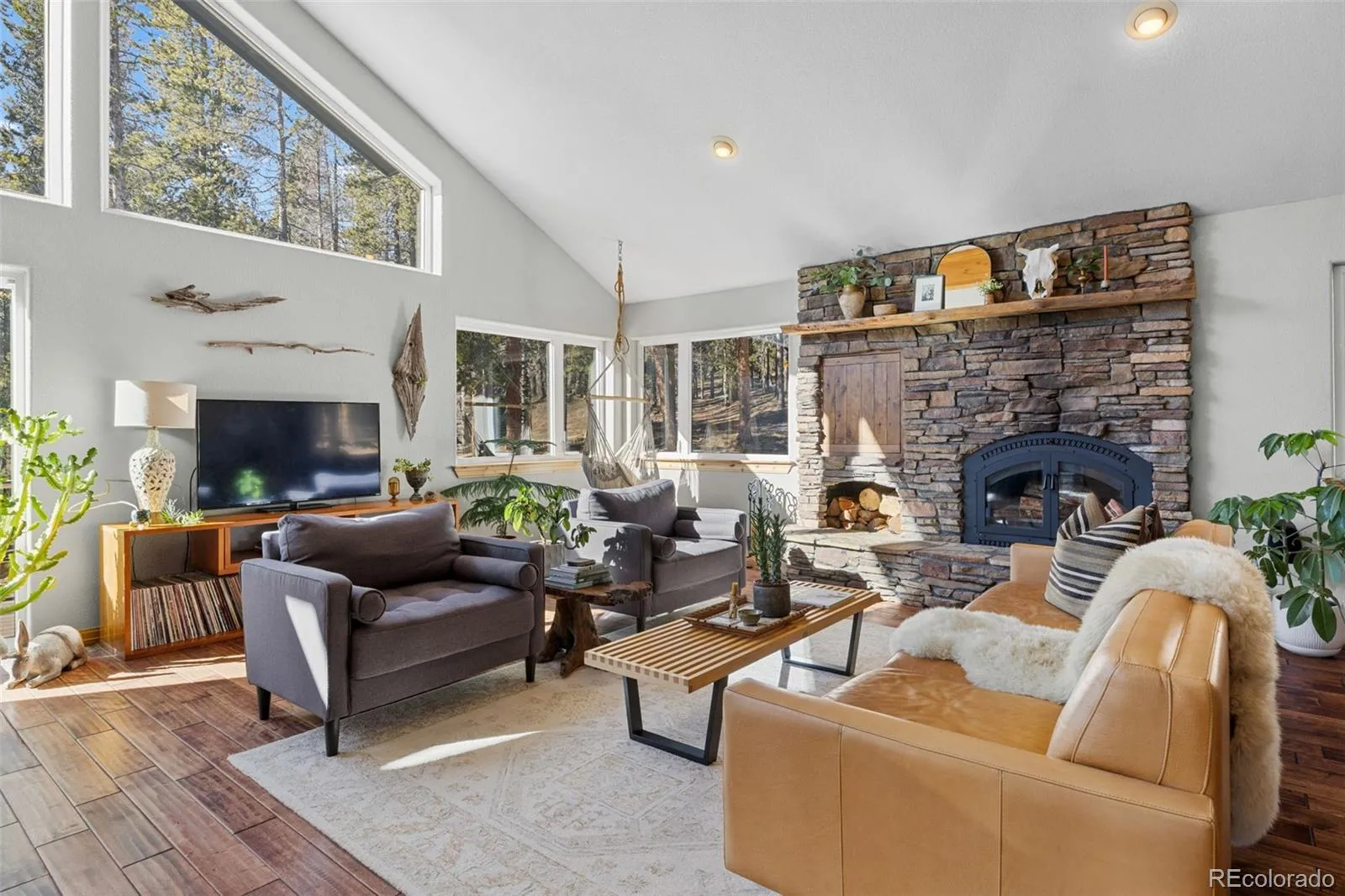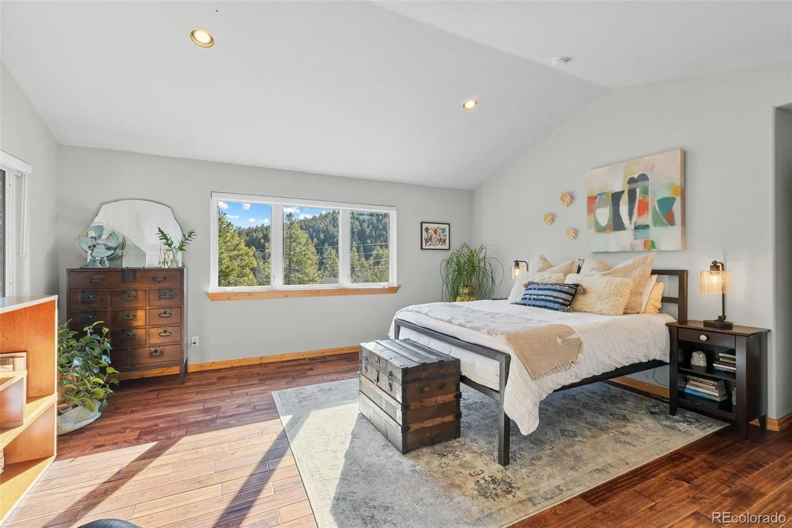 Live your Colorado story in this meticulously maintained private mountain retreat backing directly to Arapaho National Forest. Starlink high-speed internet, a garage wired for EV charging, fire-mitigation with a defensible space permit through 2027, and a durable Class 4 impact resistant roof installed in 2025 for added protection and potential insurance savings. Inside, the bright, south-facing great room fills with natural light and features warm wood floors, a carefully designed fireplace, and an open flow into the kitchen and dining area, perfect for everyday living and entertaining. The kitchen offers stylish leathered granite countertops, stainless steel appliances, stone flooring and an inviting bar. The serene primary bedroom captures some of the best views in the home, with forest and mountainside scenery right from bed and a spa-like soaking tub that looks out to the trees and night sky. Nearby bedrooms keep everyone close, while the lower level offers flexible space for a media room, gym, and office/studio space. The expansive Trex deck extends your living space outdoors almost year-round, with room for a fire pit, dining, and stargazing under incredibly clear, dark skies. The land is usable and versatile: flat backyard space ideal for a hot tub, play set, or yard games, plus additional flat pads off the driveway for RV parking or extra play space. Located on a quiet, non-HOA cul-de-sac, this home sits just about ten minutes from both downtown Evergreen and Conifer Town Center for easy access to shopping, dining, Evergreen Lake, and local concerts. Step outside and explore miles of outdoor adventure, winding trails through aspen groves, dramatic granite outcroppings, a seasonal stream, and secret local paths leading toward Cub Creek and Maxwell Falls. In winter, ski, sled, and snowshoe right behind the house, then return to your own cozy sanctuary. Frequent visits from deer, elk, fox, birds, + other wildlife complete the picture of a true Colorado haven.