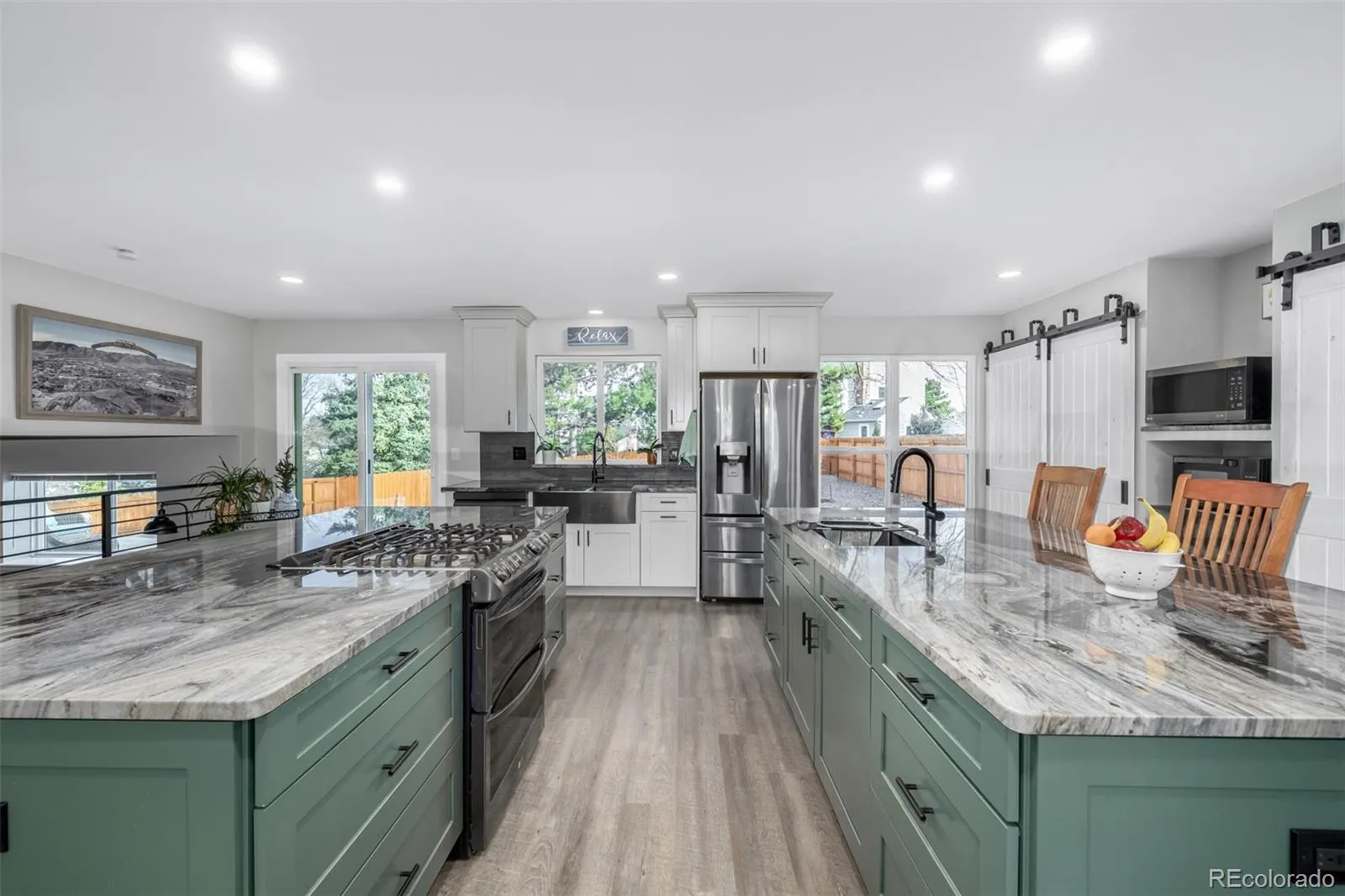 This masterfully renovated residence offers the rare opportunity to own a home where every major system & aesthetic detail has been updated within the last four years. From the 96% efficient gas furnace and tankless water heater to the electrical panel and exterior paint, no stone has been left unturned. The curb appeal is immediate, featuring a new concrete driveway with curbing, a stamped and colored front sidewalk, and a fiberglass front door highlighting the finishes found within. The chef’s kitchen boasts dual eight-foot islands topped with upgraded Dolomite granite. It is equipped with black stainless steel appliances, a country farmhouse sink, and soft-close cabinetry with pull-out shelving. Dual five-foot pantries with custom barn doors provide unparalleled storage. A gas fireplace with a stacked stone surround complements the kitchen and dining areas & features luxury plank vinyl flooring and updated recessed lighting that flows throughout the main and lower levels. The primary bedroom features an expanded, organized walk-in closet, while all bedrooms feature newer carpet and ceiling fans. Each bathroom has been uniquely redesigned, most notably the three-quarter bath which features radiant in-floor heating, heated towel racks, a custom ceramic tile surround, and a river rock shower floor. Throughout, find new interior doors, updated trim, and a tech setup with hidden electrical outlets for wall-mounted TVs. The exterior is a private, low-maintenance oasis. The backyard is fully xeriscaped with rock work, artificial grass, and fruit-bearing Alberta peach trees, all enclosed by a wood-stained picket fence. A large stamped concrete patio provides the footprint for entertaining, while a double gate offers convenient access for RV parking. The heated, finished garage is a standout, boasting upgraded wood-look steel doors with WIFI connectivity. This is a truly turnkey home where the “to-do” list has already been completed to the highest standard.