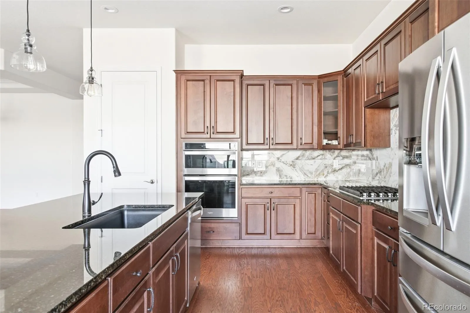 Refined single-level living awaits in this modern ranch-style home in North Hill. Built by Toll Brothers and thoughtfully designed with soaring 10-foot ceilings and rich oak wood floors, this residence offers an open, light-filled floorplan. The spacious eat-in kitchen is the heart of the home, showcasing granite countertops and a center island with statement pendant lighting. The layout flows seamlessly into the breakfast nook and expansive great room, creating an inviting gathering space. Retreat to the primary suite, complete with dual walk-in closets and a five-piece bath. Two additional main-floor bedrooms — one with French doors — offer flexibility for guests or a home office. Enjoy Colorado evenings from the covered patio overlooking a professionally landscaped, low-maintenance backyard. A large, unfinished basement provides room to customize. Residents enjoy scenic paths, a resort-style pool, clubhouse gym and a nearby park with mountain views, all just moments from shopping and dining including TopGolf, In-N-Out Burger, Denver Premium Outlets and more.