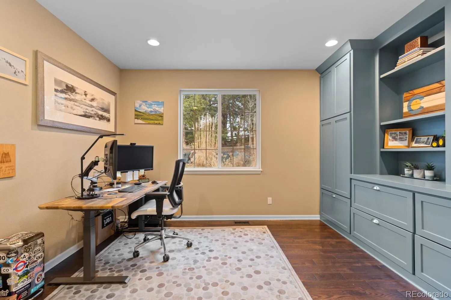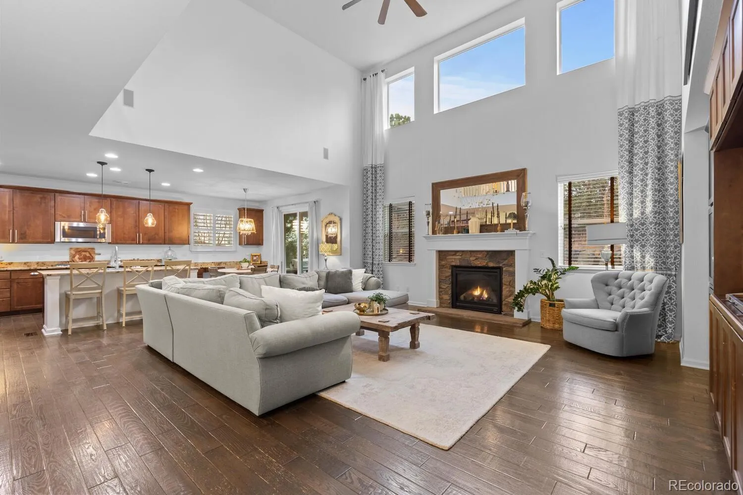 Offered for the first time by the original owners, this beautifully maintained 5-bedroom, 5-bath home with a finished basement sits on a premier lot backing directly to the protected Black Forest. Upon entry, a light-filled dining room captures Front Range mountain views. The living room features soaring vaulted ceilings, a stone fireplace, and surround sound speakers, creating an inviting sense of space. Hardwood floors, fresh interior paint, and plantation shutters extend throughout the main level, while custom built-in cabinetry adds refined function to both the living room and executive office. The kitchen is designed for everyday living and entertaining, featuring abundant cabinetry, a large pantry, a spacious island with seating, and a butler’s pantry connecting the kitchen and dining room, along with easy access to the backyard for seamless indoor-outdoor gatherings. Upstairs, the primary suite offers a spa-inspired bath with heated floors, a freestanding tub, double vanities, a bidet, and a walk-in closet. An additional upstairs bedroom includes its own en-suite bath with a walk-in shower, while two other bedrooms share a full bath with double sinks and a tub/shower.