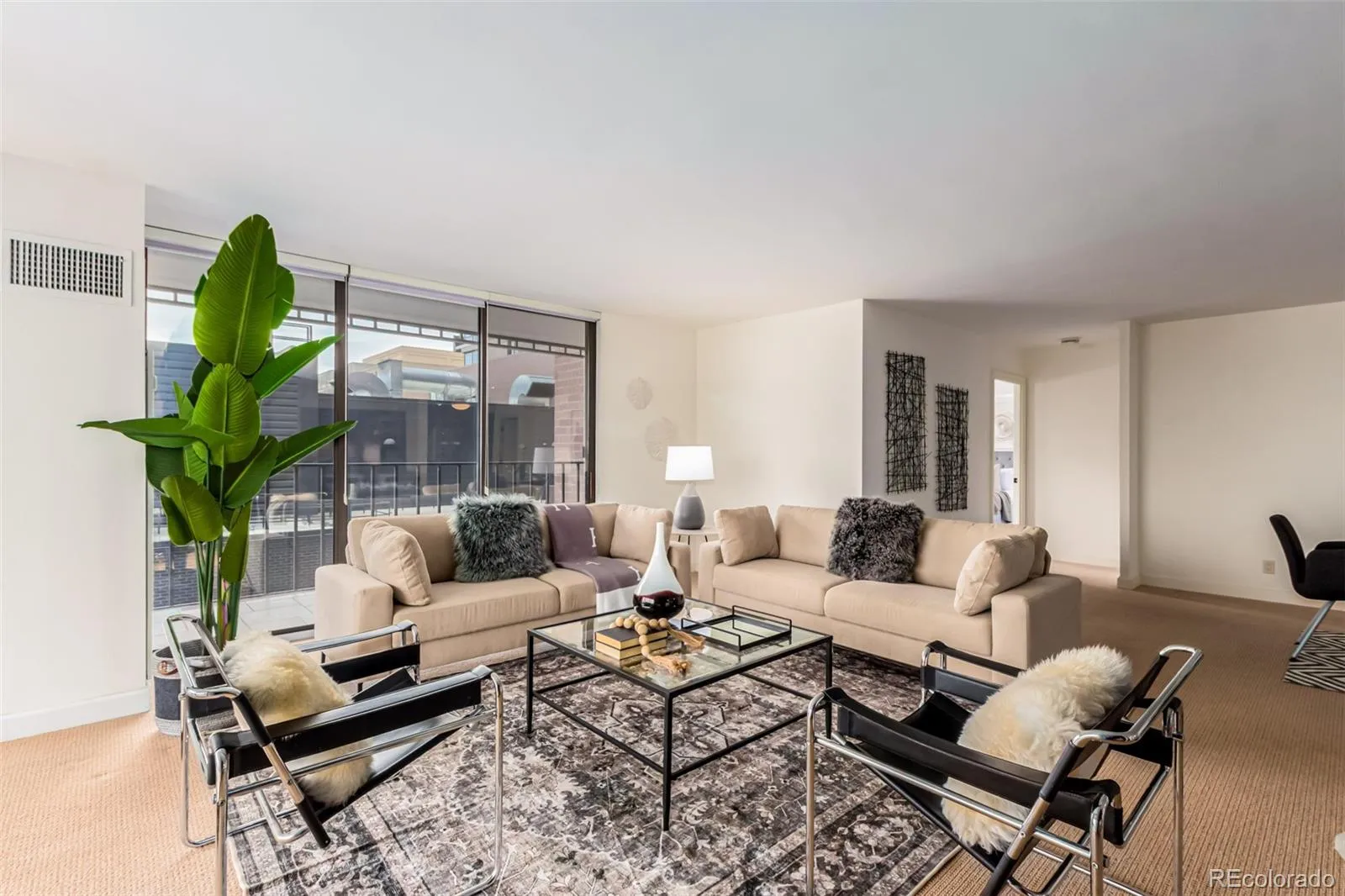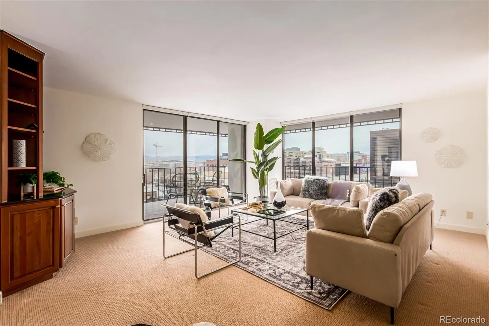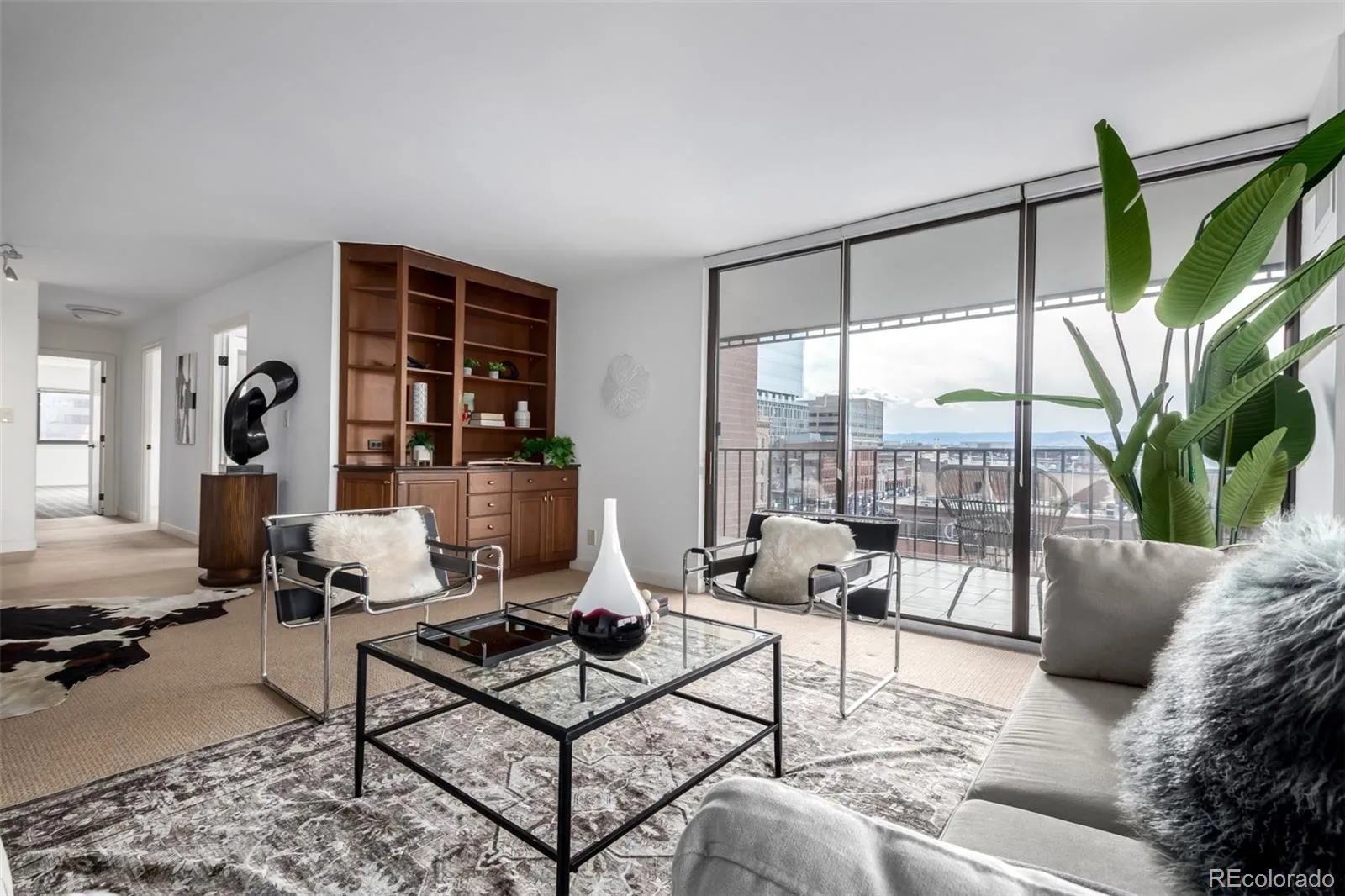 Floor-to-ceiling windows frame both the Denver skyline and distant mountain views, filling the open-concept living and dining areas with natural light throughout the day. The layout is equally suited for elevated entertaining and comfortable everyday living.