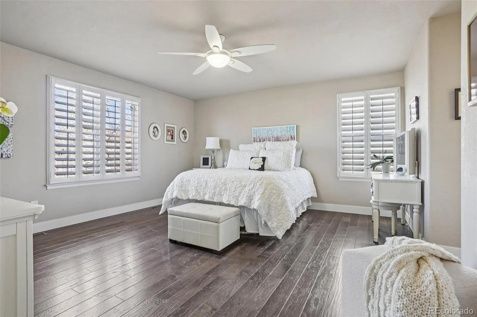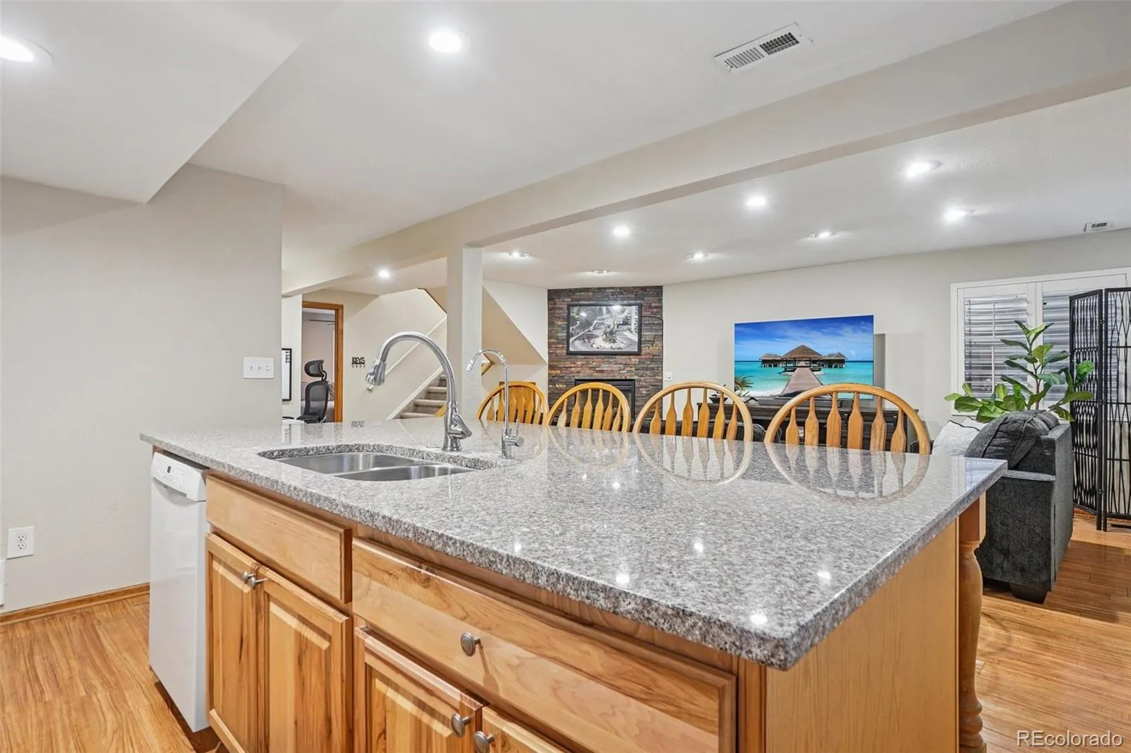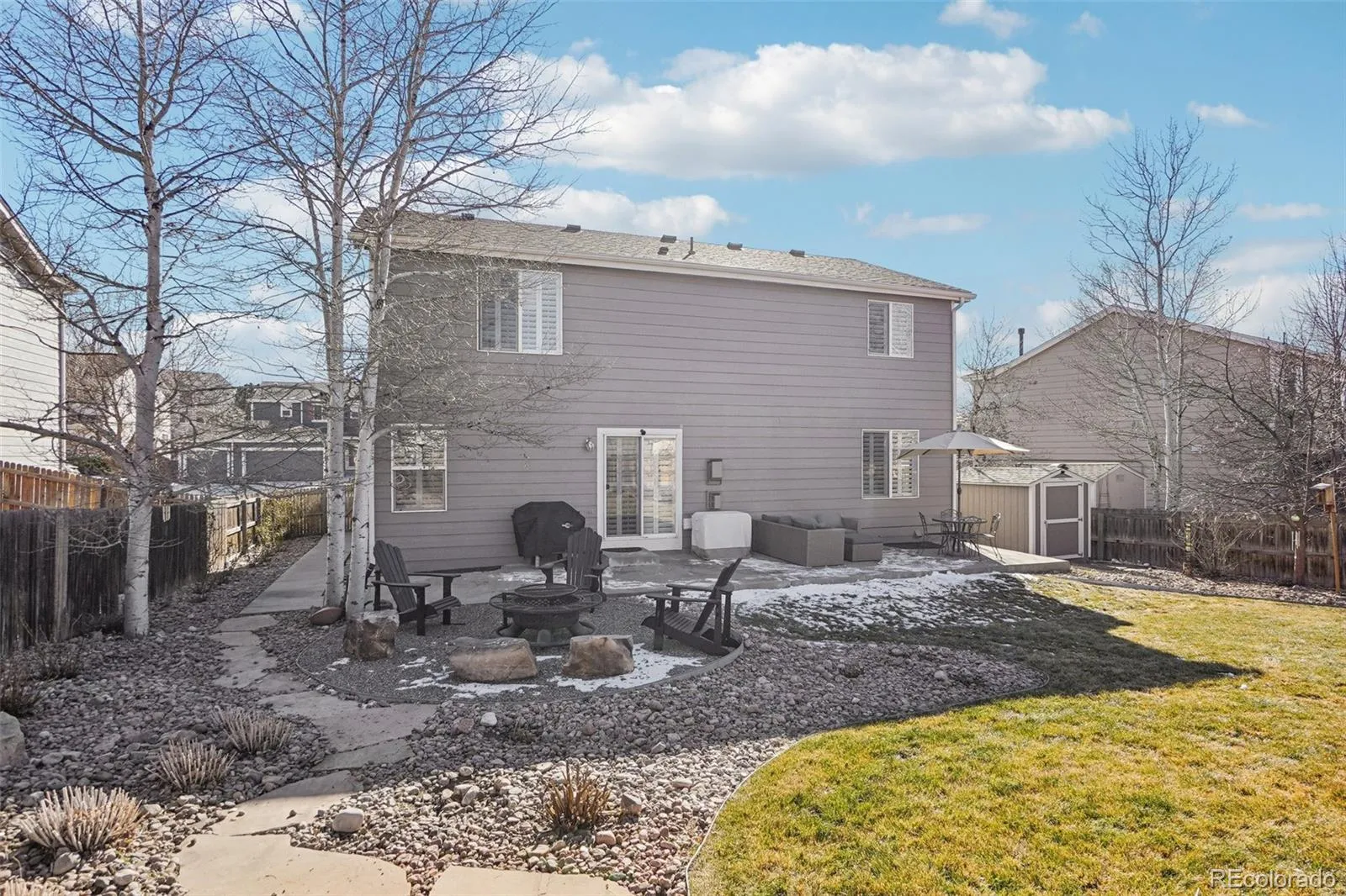 Welcome to 5435 S Shawnee Way, a beautifully maintained five bedroom, four bathroom home located in the highly regarded Cherry Creek School District. A southeast facing driveway and charming covered front porch create a warm first impression as you step into this immaculate home featuring solid surface flooring throughout. The main level offers a bright, open floor plan ideal for both everyday living and entertaining. Expansive living and dining areas flow seamlessly into the inviting family room and well appointed kitchen with abundant cabinetry and generous counter space. Large windows bring in natural light and provide an easy connection to the backyard for effortless indoor and outdoor living. Step outside to a generous, private backyard surrounded by a privacy fence and professionally designed landscaping with Rachio WiFi controlled irrigation. The extended patio creates the perfect setting for gatherings, complete with space to relax and unwind at the end of the day. Upstairs you will find four bedrooms, including a spacious primary suite with a five piece bath and walk in closet. The additional bedrooms offer flexibility for family, guests, or a home office while maintaining privacy and functionality. The finished basement expands the living space and truly feels like a home within a home. The basement kitchen features luxury vinyl plank floors, granite countertops, and rich hickory cabinets with convenient roll out shelves. A large family room with a corner fireplace provides a cozy setting for movie nights or game days. The spa inspired basement bathroom includes a steam shower, wall mounted fireplace, and corner jetted tub. An additional bedroom on this level makes it ideal for guests or multigenerational living. With generous space, thoughtful updates, and inviting indoor and outdoor living areas, this move in ready home offers comfort, versatility, and an exceptional location.