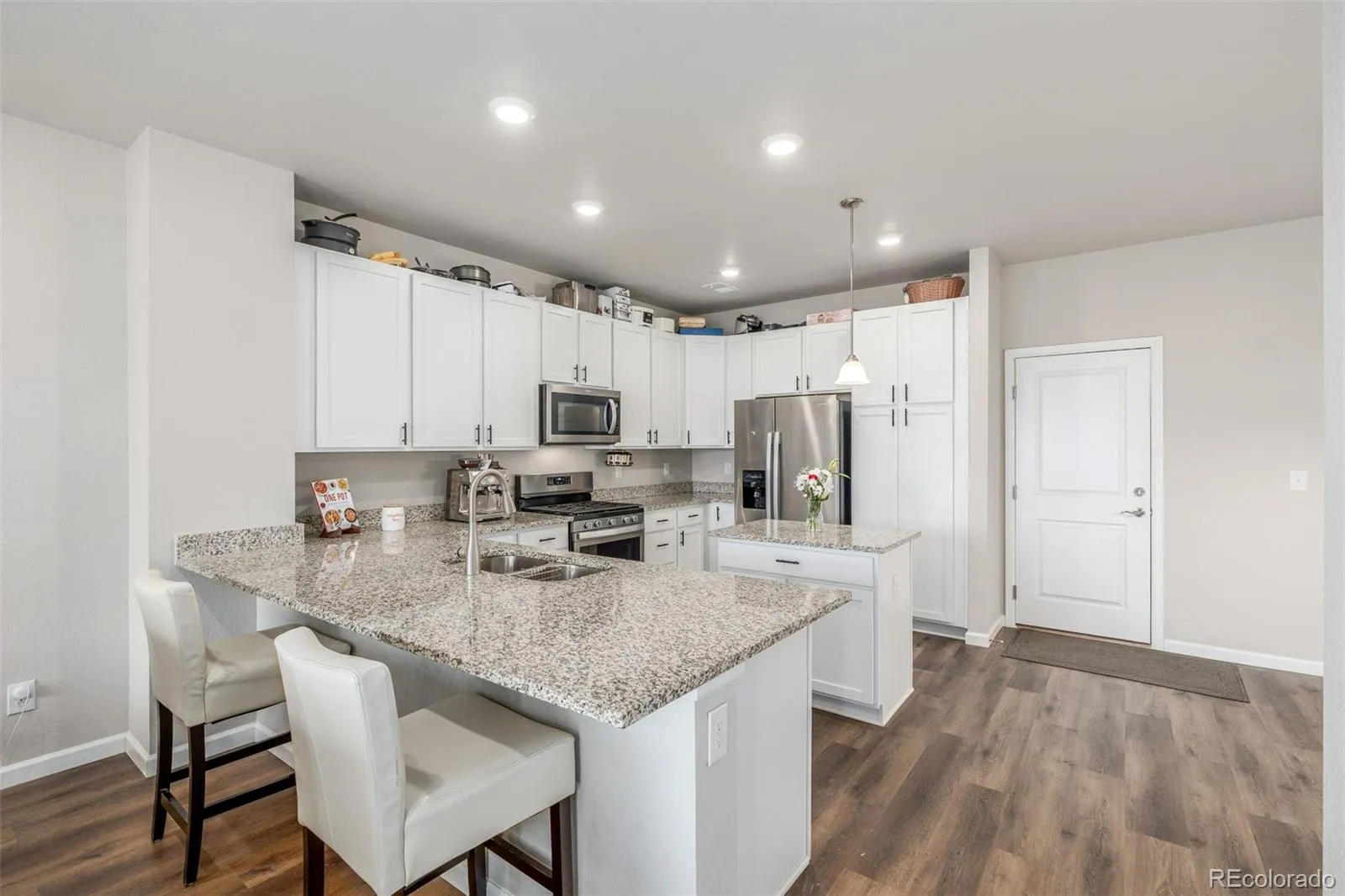 Welcome to this beautifully maintained townhome offering modern comfort, thoughtful design, and easy living in a desirable Aurora community. Step inside to a bright, open main level where warm flooring, recessed lighting, and an inviting living area create the perfect setting for everyday life and entertaining. The spacious kitchen is a standout, featuring crisp white cabinetry, granite countertops, stainless steel appliances, and a generous island with seating, ideal for casual meals, morning coffee, or hosting friends.