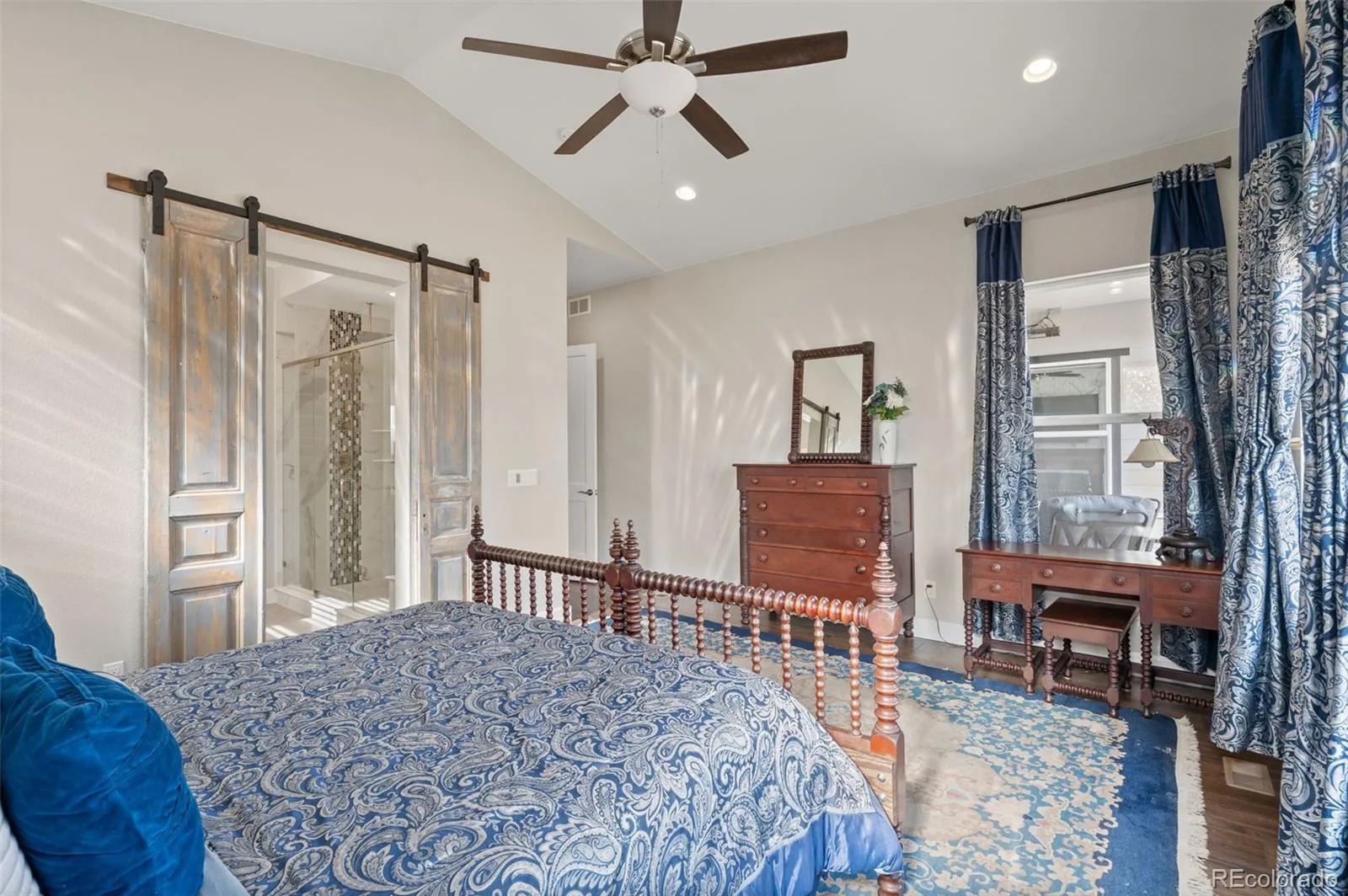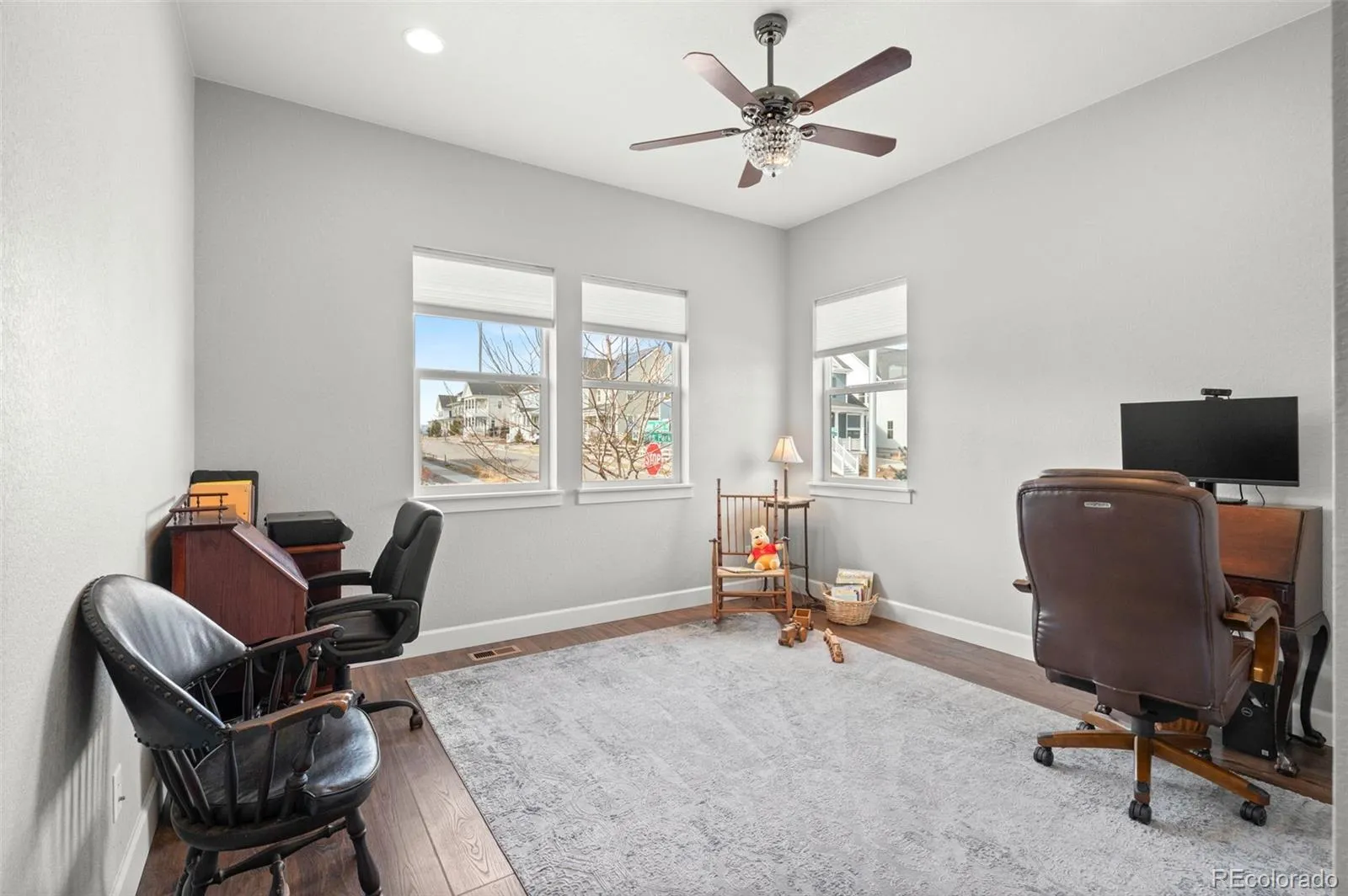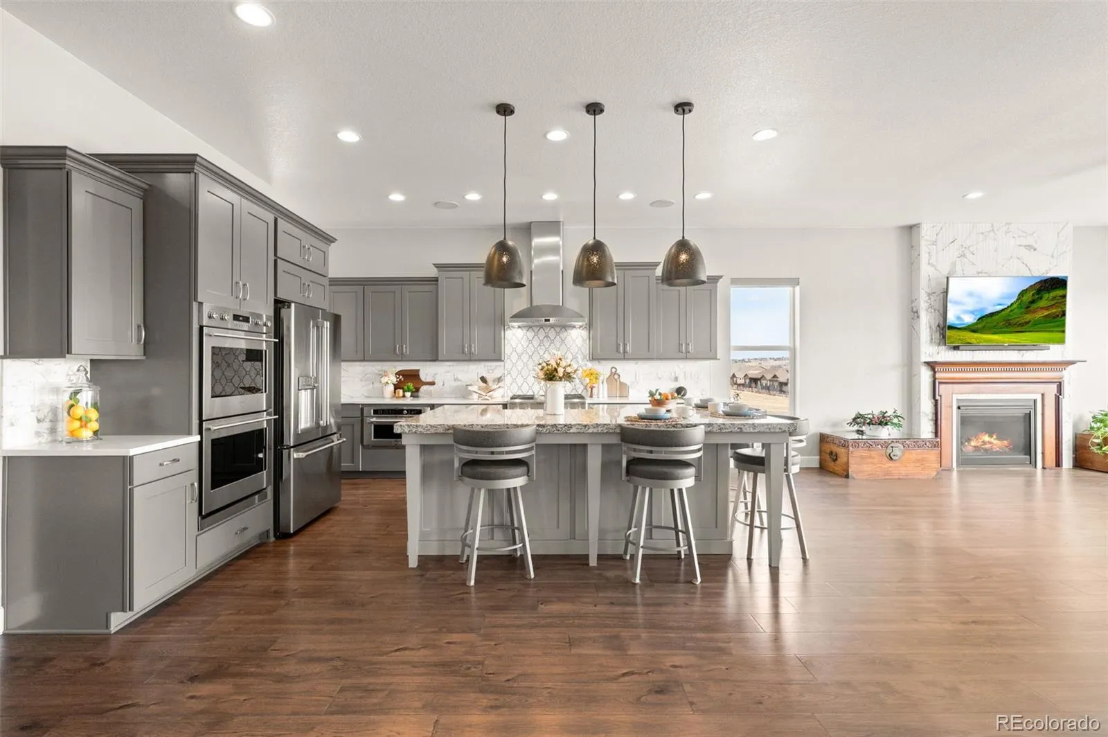 Set on a premium corner lot backing to open space, this meticulously upgraded home offers exceptional privacy, views, and modern luxury. The main level features a chef’s kitchen with Carrera marble backsplash, extra-thick granite island, farmhouse sink, soft-close cabinetry with roll-out shelving, under-cabinet lighting, ceiling speakers, and a full suite of GE Monogram and Café appliances—ideal for both everyday living and entertaining. Living spaces are anchored by a dramatic floor-to-ceiling custom-tiled gas fireplace, oversized windows overlooking tranquil green space, motorized window treatments, and upgraded lighting throughout. The primary suite is a private retreat with a custom antique Egyptian barn door, heated floors, rain and dual shower options, upgraded ventilation with heat and light, illuminated makeup mirror, quad vanity outlets, electronic bidet, and a custom walk-in closet. Indoor-outdoor living includes a covered deck enclosed on three sides with heaters, ceiling fan, speakers, gas line, and access to an expanded deck—perfect for year-round gatherings. The walkout lower level adds 1,500 SF of finished space with a wet bar, recreation and family rooms, additional bedroom, luxury bath, generous storage, workshop space, and a private hot tub beneath the deck. The insulated and finished garage includes upgraded doors, LED lighting, extensive overhead storage, smart openers, and a Level 2 EV charger. Exterior upgrades include fully owned solar panels, gemstone architectural lighting, oversized gutters, heat-tape protection, zero-maintenance landscaping, French drainage, and a fully fenced yard—delivering comfort, efficiency, and peace of mind. A rare opportunity combining corner-lot privacy, open-space living, and high-end upgrades throughout.