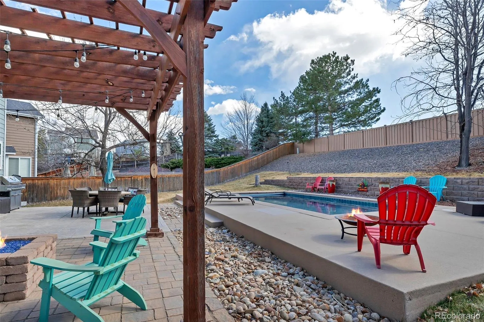 Just beyond the main living area, the home truly shines outdoors. Set on an impressive ¼-acre lot, the backyard is a rare find in Highlands Ranch—complete with a pool, hot tub, and room to relax, play, or host unforgettable summer gatherings.
