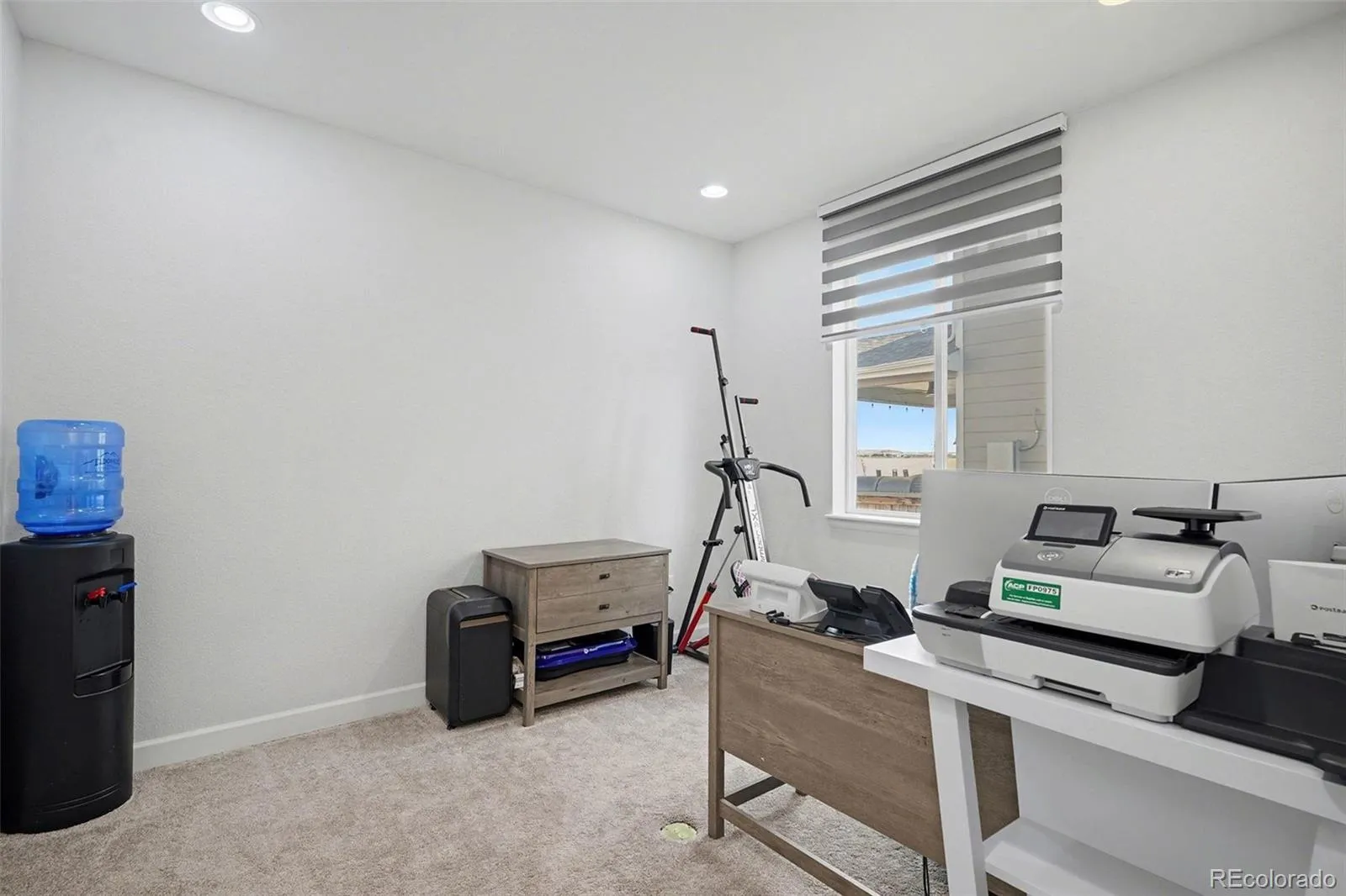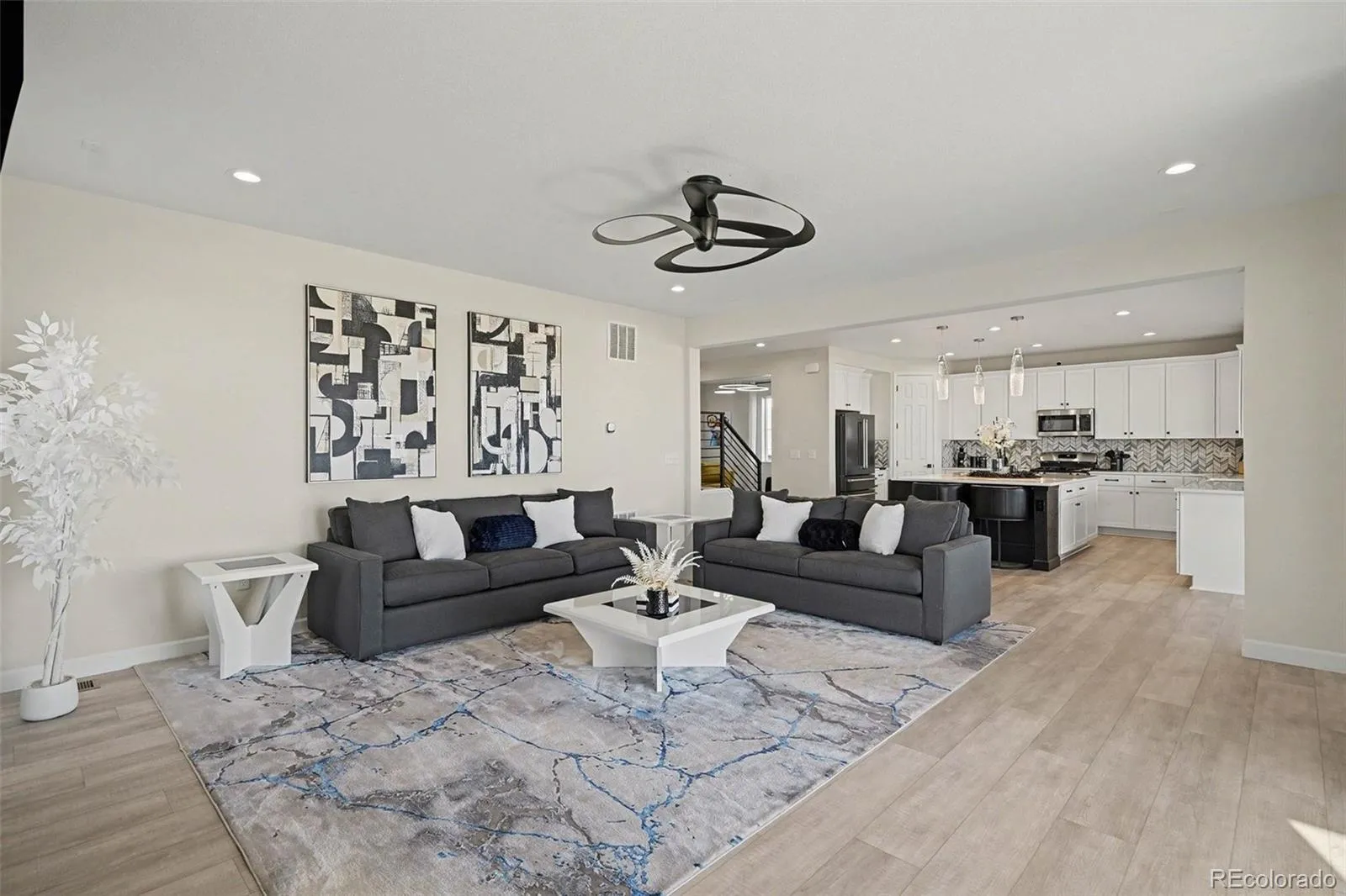 The main level blends everyday comfort with effortless entertaining, highlighted by LVP flooring, horizontal wrought-iron stair railings, and clean sightlines throughout. A flexible front room offers formal dining or sitting space, while a main-level bedroom or office with a large walk-in closet adds versatility that adapts as life evolves.