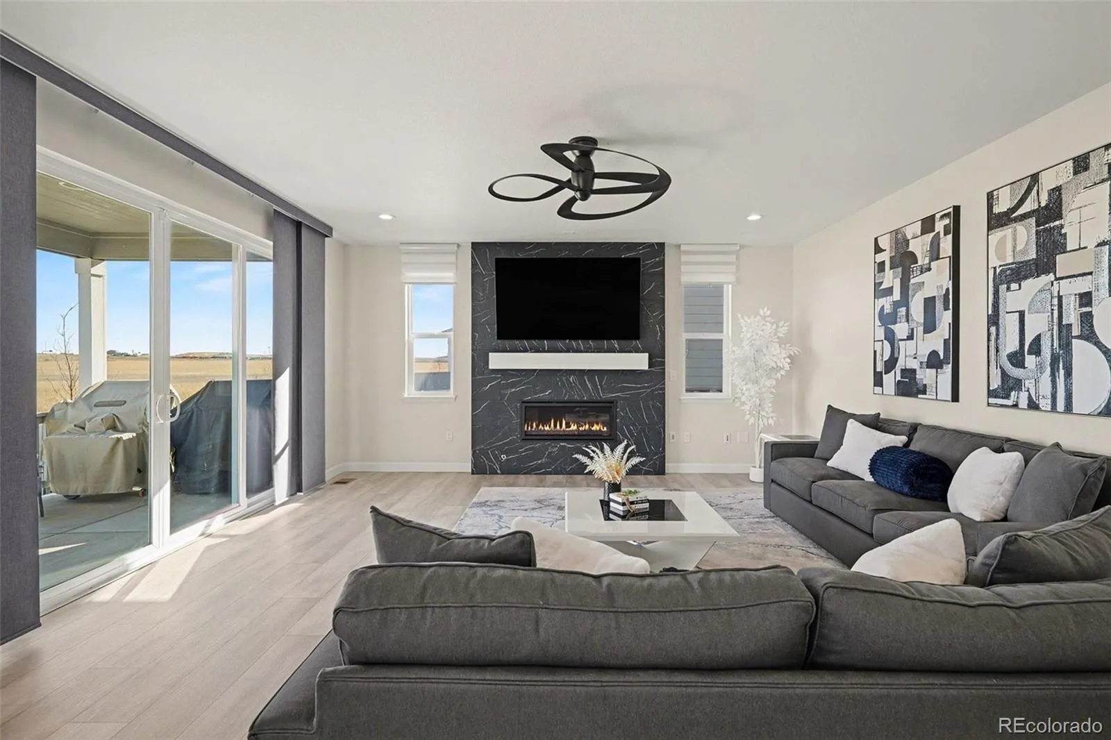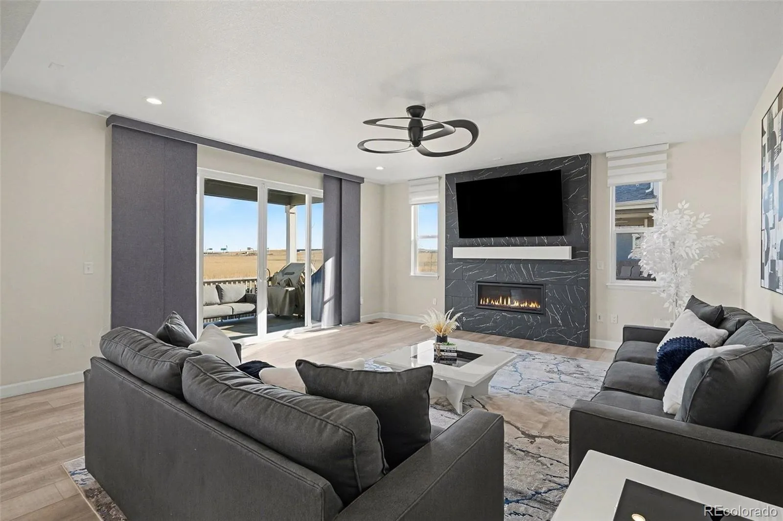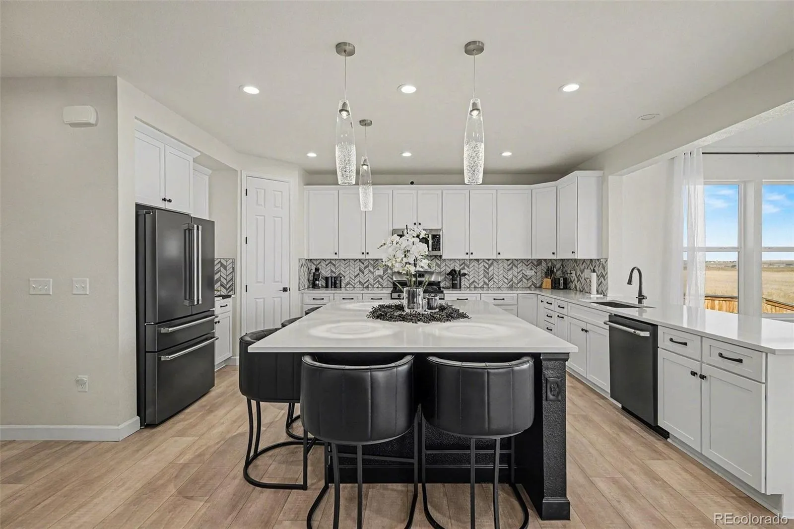 The kitchen anchors the home with white cabinetry, crown molding, stainless steel appliances, a striking backsplash, and an oversized island that naturally becomes the gathering place. The expanded breakfast nook opens to a covered patio, and upgraded oversized sliders connect the living room to the outdoors—creating seamless indoor-outdoor flow.